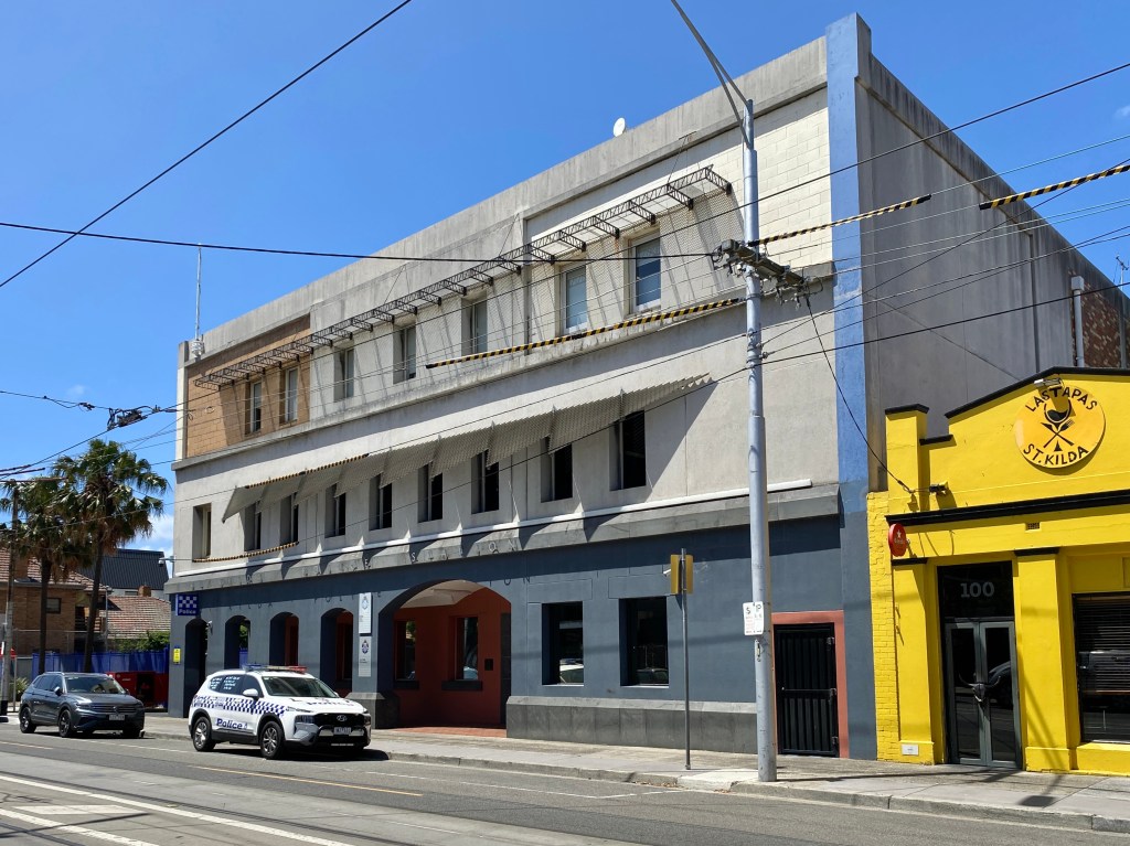 The 1989 St Kilda Police Station at the bottom of Chapel Street is not a likeable building, but it’s notable that it was heritage listed only about 10 years later ! In fact it was identified for listing in a 1992 St Kilda study, which unusually had a brief to look at very recent architecture. The citation just says it’s a ‘well handled postmodern pastiche’, representing the period. It sort of looks like an altered old warehouse, or a public building that’s lost its detail, leaving that odd arcade at ground level with its bluestone bases, but perhaps it was meant to be tough looking. The delicate mesh sunshades offer quite a contrast, still doing their job. There’s a huge carpark /yard as part of the thing, with bold forms to the side and rear, including a windowless tower. The citation says the architect at the Public Works Department was Rob Miles, who I recall working on this when I was there on work experience, maybe 1987?