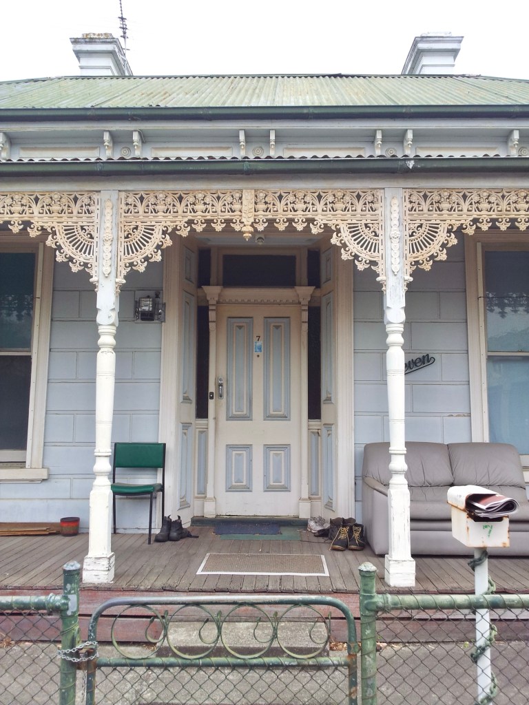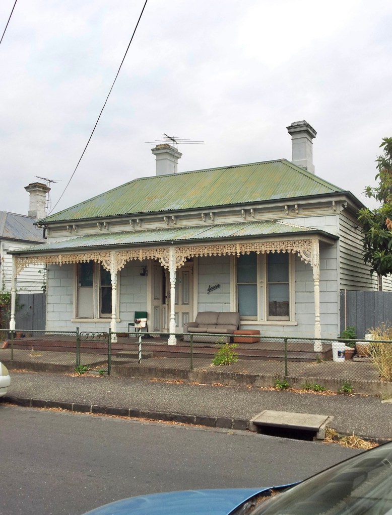 Photographed in 2014; my caption was then ‘old unrestored cottage’- might be all zhoojed up by now, but no idea where it was. Also, I now notice that the verandah posts are typically Edwardian thick turned timber, while everything else is Victorian. Oh, and the fence is Edwardian wrought iron and cyclone wire. Possibly it dates from c1900 and so had a bit of both eras. Or bits replaced, maybe the verandah had Victorian square timber posts, which decayed and got replaced with these in the 80s or after when they got really popular again. (Also I’m sure my mother used the term ‘zhoozhed up’, but American sources say it’s from Queer Eye 1).