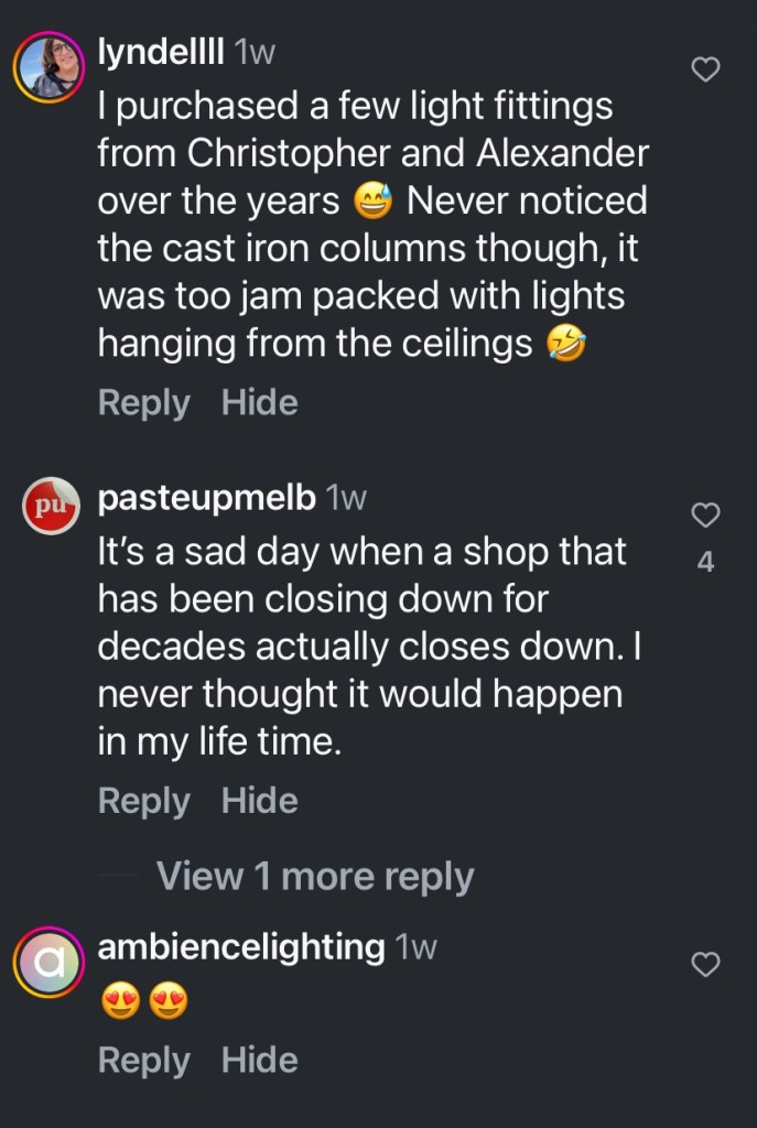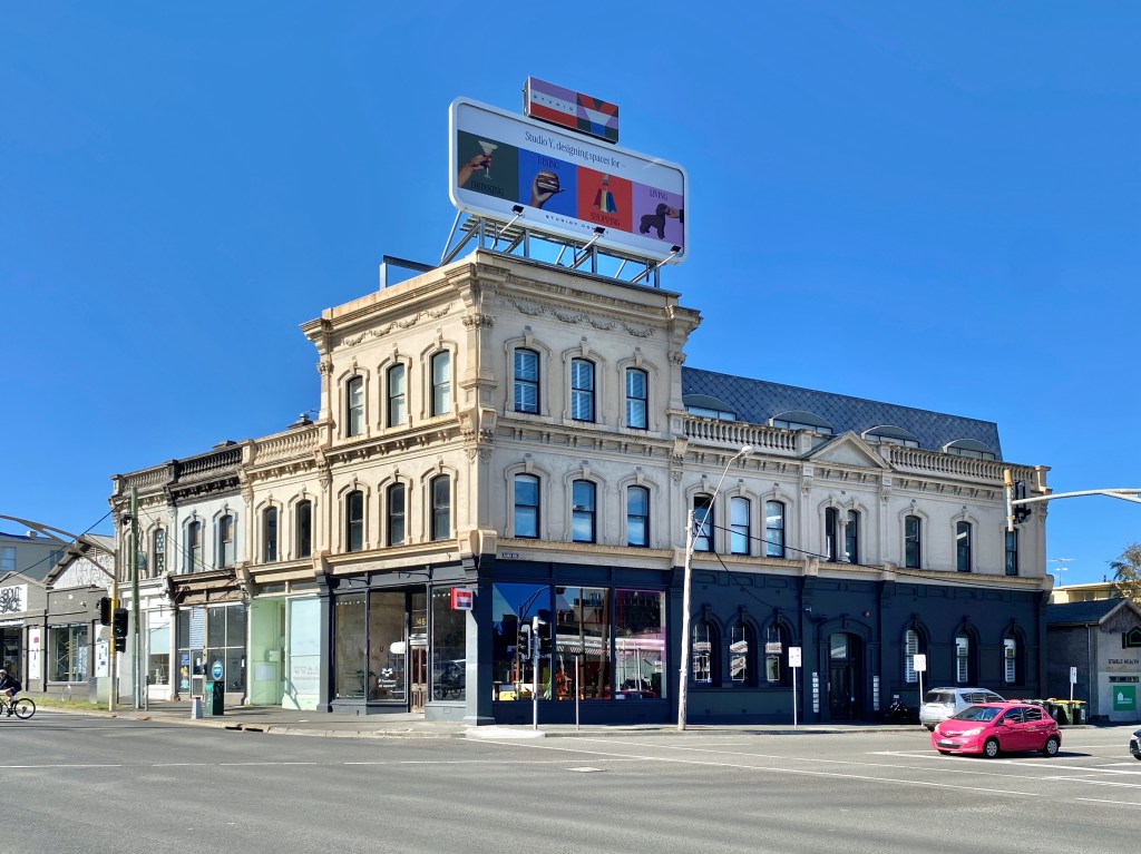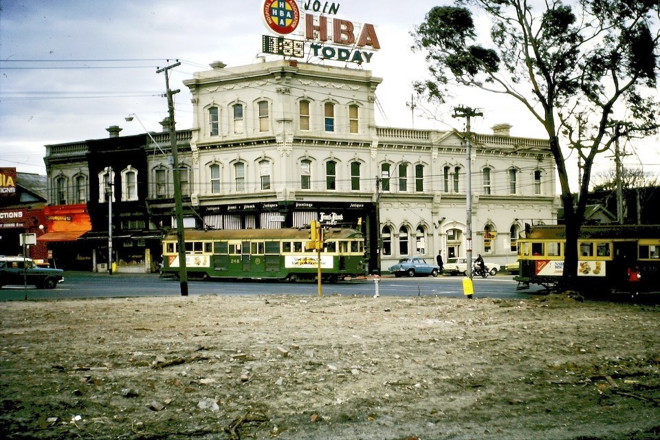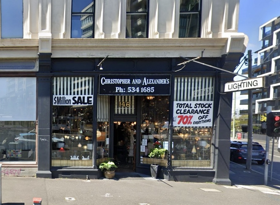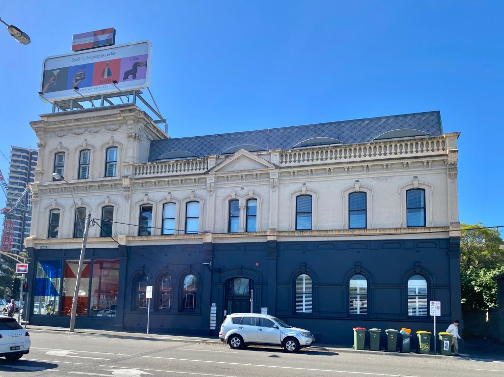 Who hasn’t noticed this impressive shop building on the crest of St Kilda Road, cnr Alma, with that chandelier shop that was always having a sale ? Well it closed a year ago, and @studioy.com.au bought it, and director Yaron kindly asked me in to have a look – and it’s just as impressive inside. The ceilings are at least 6m high, supported by cast iron columns, complete with lace panels, and a half a stair to nowhere. Room for a mezzanine, and there’s also a basement, with hefty columns and wrought iron beams. The shopfront (and two others) and even the door are original too. Round the side is a generous entry hall to what was a 10 room house above and behind the corner shop, converted to flats in the 90s (with an additional floor you can barely see), and there’s stairs everywhere, including newer ones inside the top corner flat that go up to the roof – quite a view ! (Thanks to Trish and Trent for letting us in). The whole thing was built in 1886 for Alex Macadam, who ran his grocery business from one of the other shops, but found his investment soured quickly; the shops were all filled in 1890, the corner one as Hewitt’s crockery and glassware (I think), but by 1895 only his grocery remained, and the corner shop wasn’t occupied again until about WW1. Meanwhile the house was occupied by Mr Harricks, physician, who appears to have been the St Kilda coroner at the time, joined by 1895 by Dr McAdam -they might have used the ground floor on Alma Road as a surgery (all that comes from directories and Trove). I found one old pic on Facebook from 1967, when what was once a narrow shopping strip called High Street was being bulldozed into the wide St Kilda Road it is now. It was an antique shop then, Franzi & Filcock, and I was told the chandelier shop started 40 years ago, run by the sister of the owner of the whole building, who was a property developer (I didn’t quite catch the name). Pic 2 is streetview.