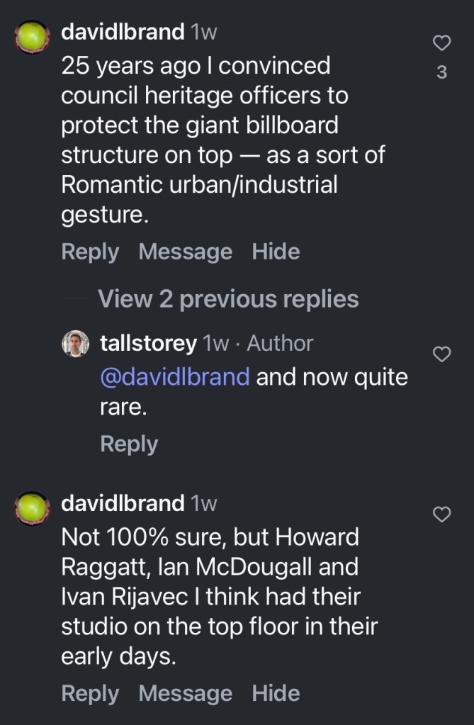 Update : a few commenters recall that Ian McDougall of @armarchitecture had his studio in the top corner in the early-mid 80s, and the partnership formed in 1988 might have started there.