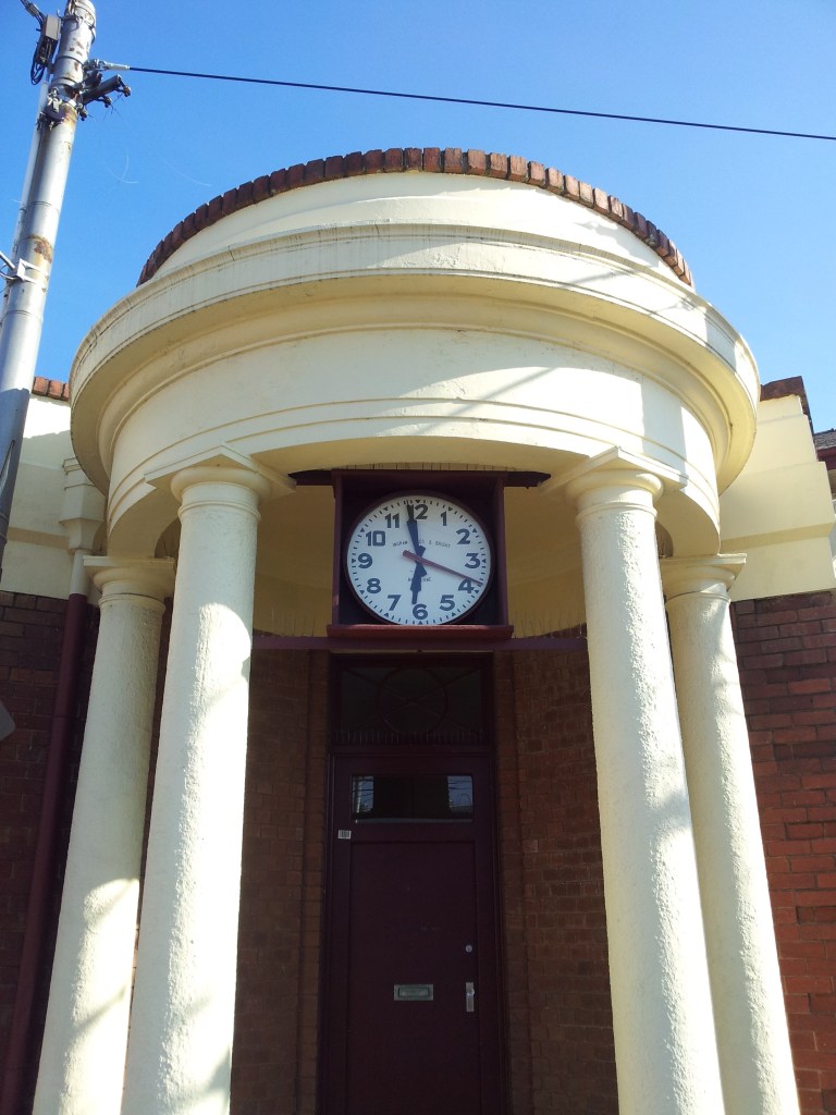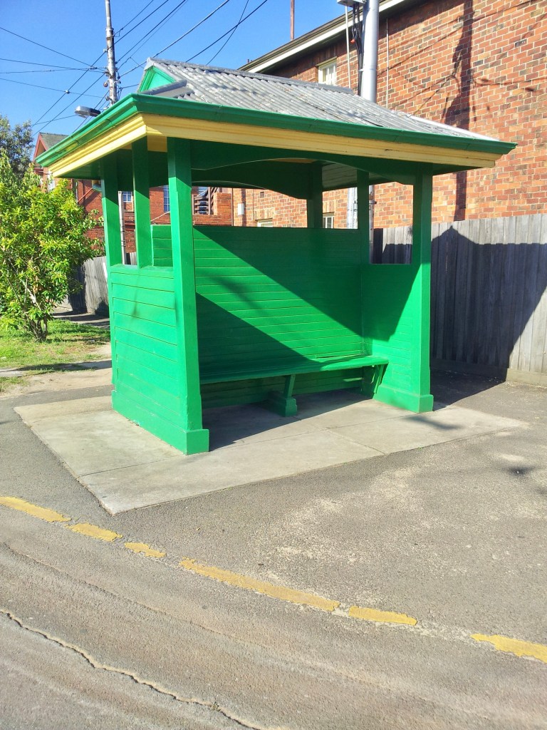 The fine restrained Georgian style offices at the Camberwell Tram Depot, built 1929. It has a corner piece like a little classical temple with a clock to keep the drivers on time perhaps. It was designed by Alan G Monsborough, who was the chief architect of the M&MTB from 1925-1938. The depot is actually in Hawthorn, off Riversdale Road, with the shed itself on Camberwell Road. The tram line here was created much earlier, opening in 1917, and the cute little shelter may date from then, and perhaps relocated here later. I took these photos in 2013, when what looks like an original tram wire /electricity pole was being replaced.