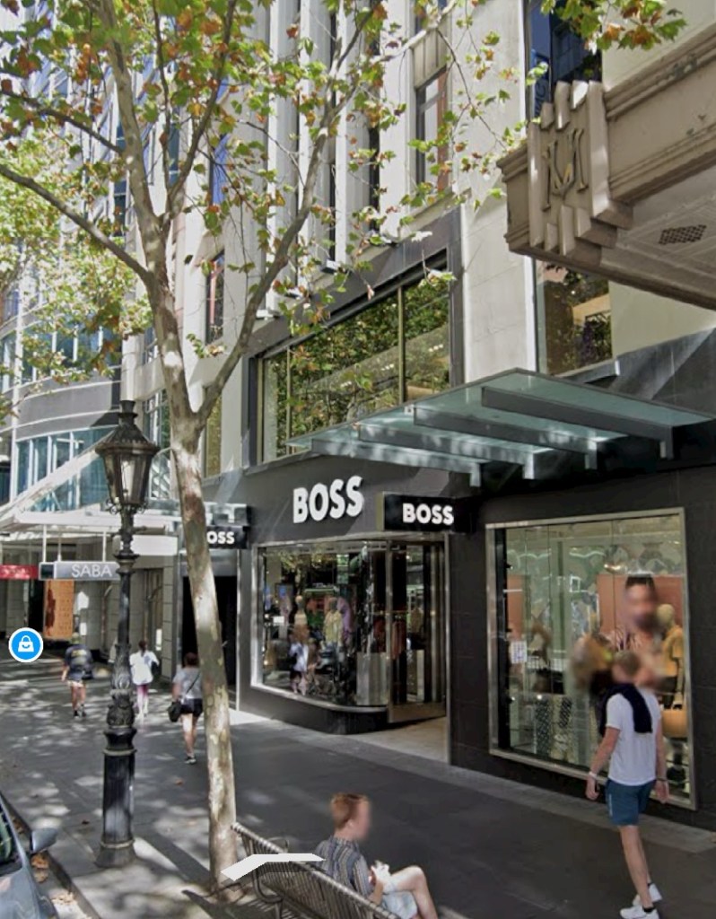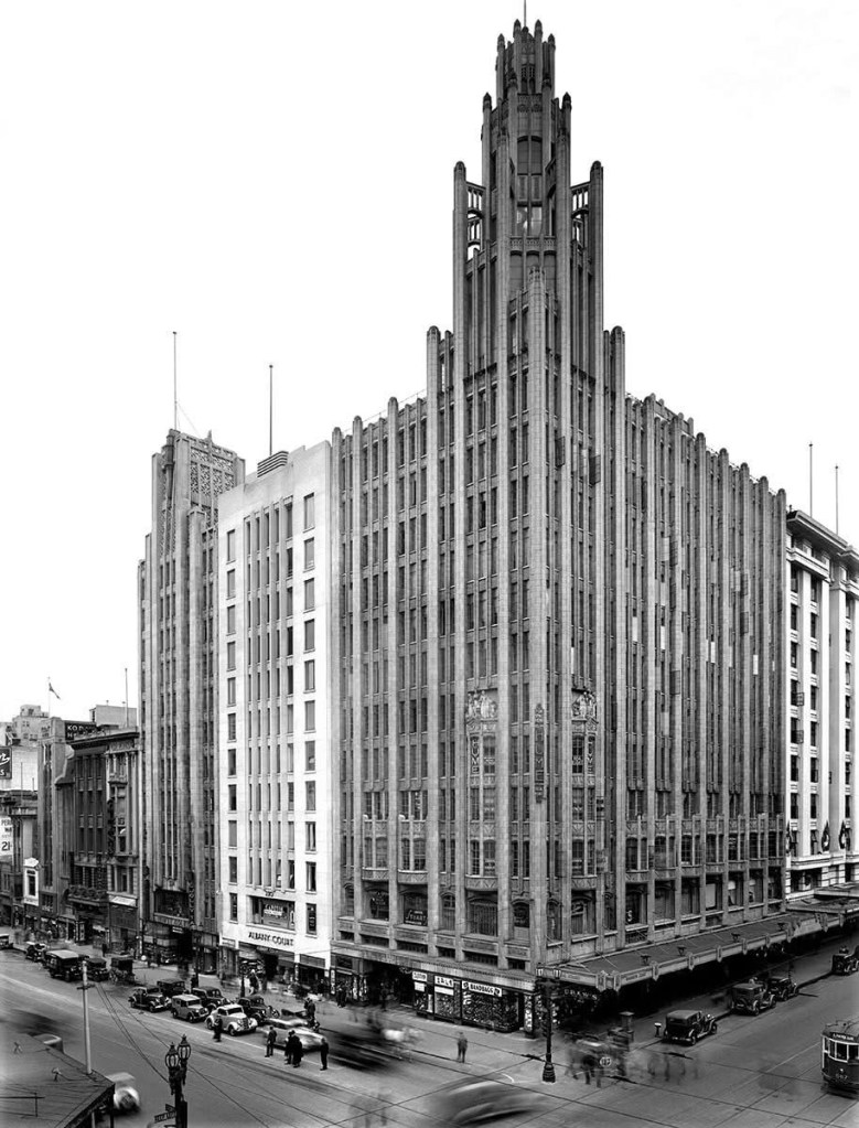 A case of extreme change at ground level – Albany Court in Collins Street was built in 1936, next to the 1932 Manchester Unity building, and both were designed by Marcus Barlow. It had great signage, a short shopping arcade through to Howey Place, and a newsreel cinema in the basement, with a simple but striking interior (and air conditioning). A verandah was added by the time of the 1962 colour photo, and in 1978 the cinema became the Pussy Galore adult theatre, finally closing in 1989.