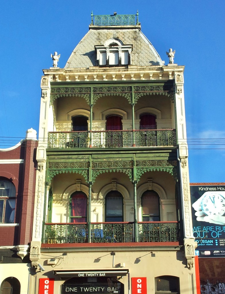 This landmark in Johnston Street Fitzroy off Brunswick Street was built in 1887 as Dr Samuel Peacock’s house and surgery – and he certainly made a statement ! Not only three storeys, but topped by a mansard roof, complete with lookout, designed by Swedish born Olaff Nicholson.
