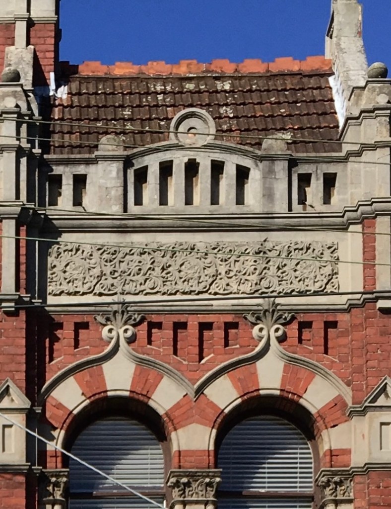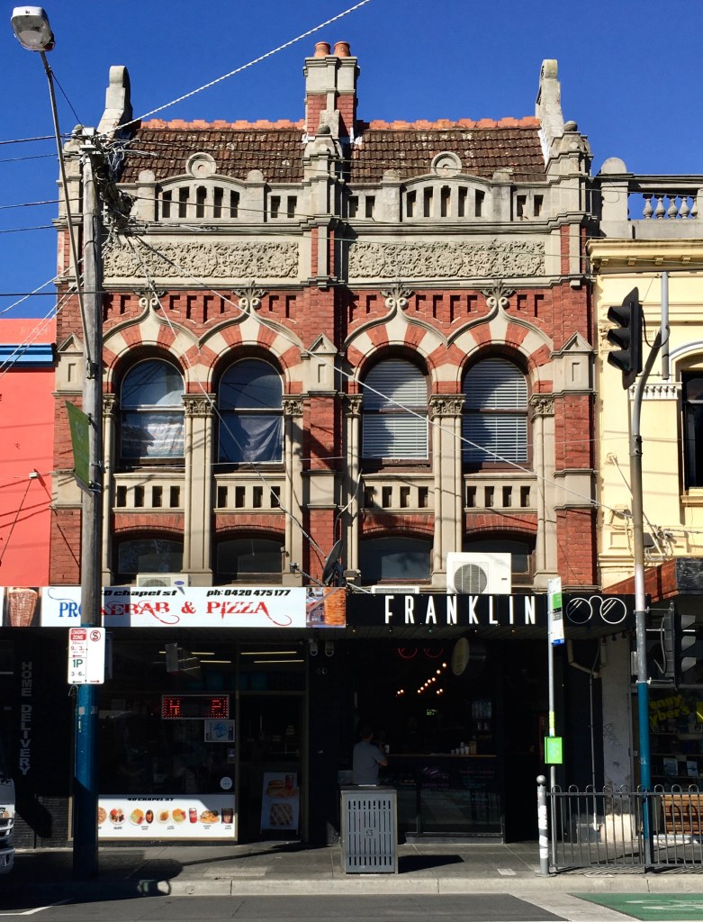 Some excellent Edwardian era shops on #ChapelStreetWindsor, with a completely untouched upper facade, and all that elaborate detail is in pretty good condition. There’s a range on influences, including Queen Anne classical bits, Art Nouveau-ish arch tops and especially that panel of floral ornament, Gothic capitals on the piers, all topped by a feature tiled gabled roof. There’s never been a complete study of all the great shops on Chapel Street, but seems to date from 1906, the first ad I can find for the new address of 38A- looks like it was a wider single shop that became two rather narrow ones. One shop sold phonographs ie. records, with facilities to record your own (!), and two years later an electrical contractor occupied the other. Couldn’t find an architect.