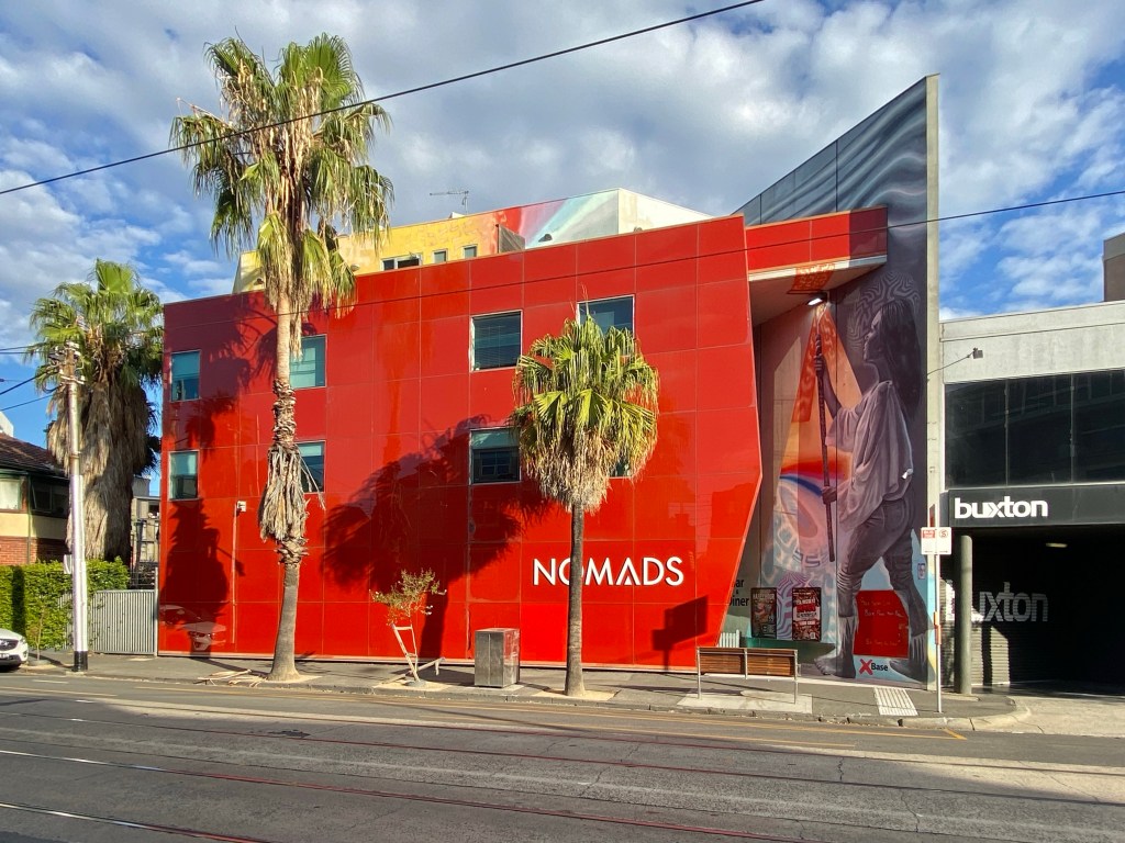 Nomads, Carlisle Street, St Kilda, 2004. Even though this is so brightly coloured and blocky I kind of like it. I guess it helps a lot that the street is mixed and especially that there’s two palm trees in front. Also, it’s kind of just like a sculpture, with that almost blank wall, and angled cut out for the entrance. But if you look close you’ll see that the bright red backing on the glass is coming off. Adds texture I suppose ! Inside it’s like motel rooms or dorm rooms, with 238 beds (!), and there’s actually a larger rectangular plainer part facing the side street, with a gap between which is where they’ve put the bar/lounge. Possibly the first purpose built backpackers in St kilda. Don’t know architect, though Google AI says it was M2M (?!). Update : it’s possibly by Allan Powell.