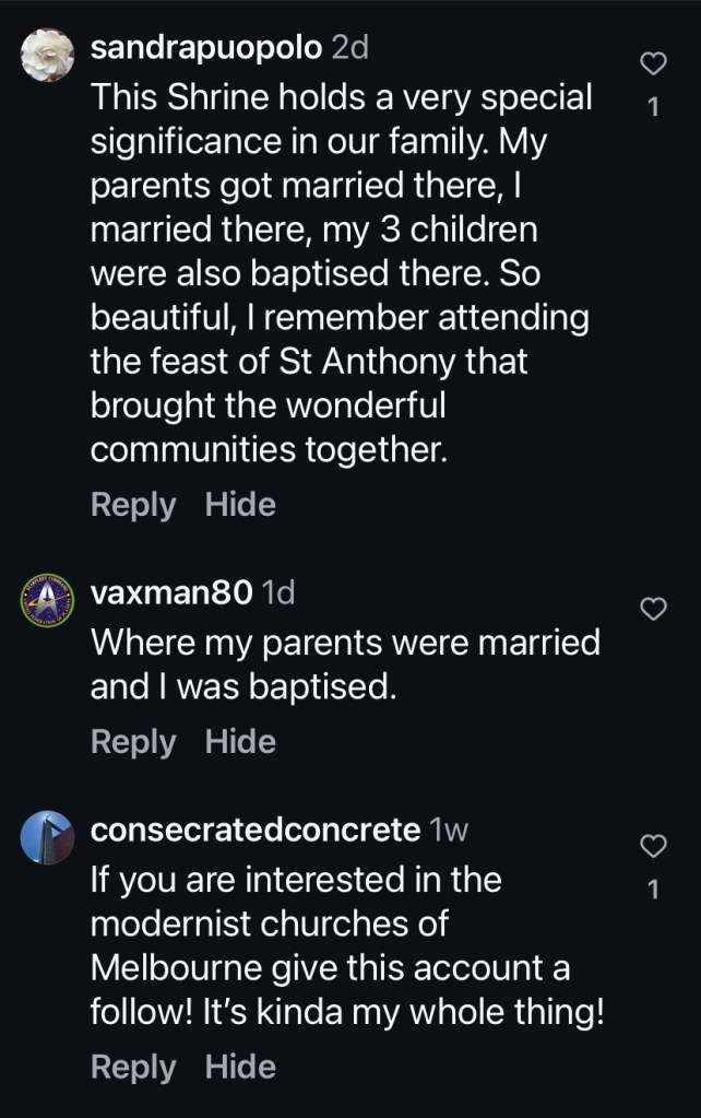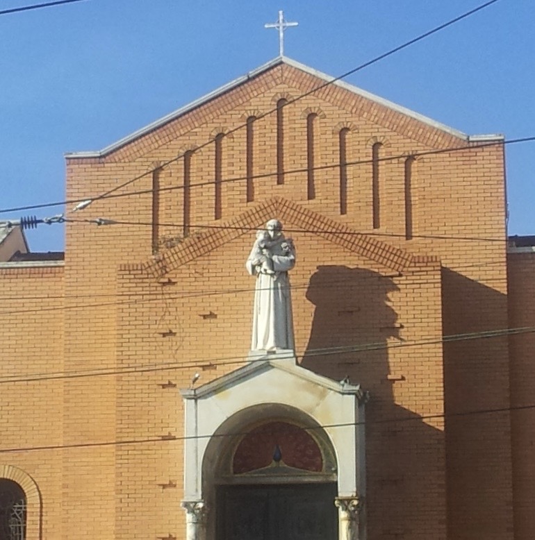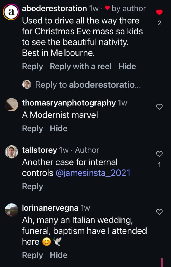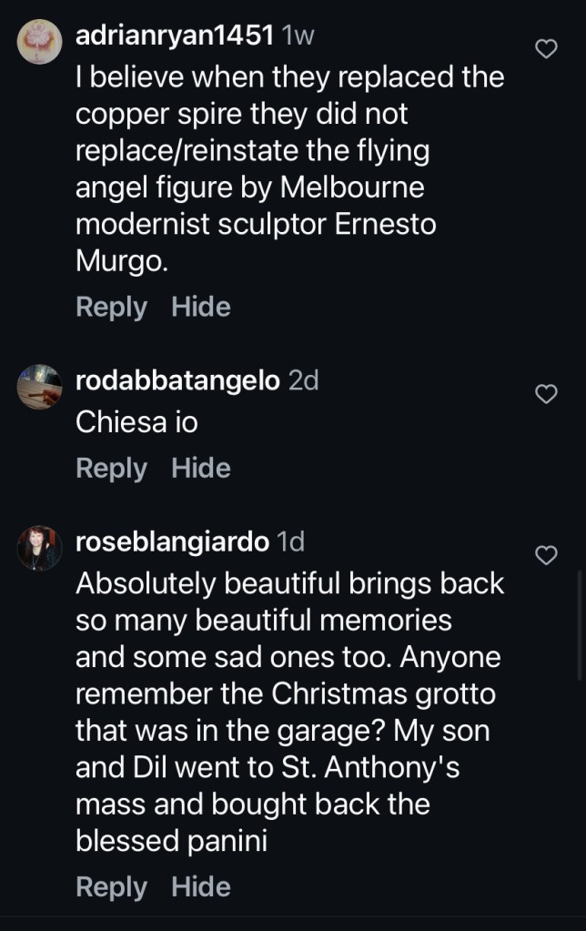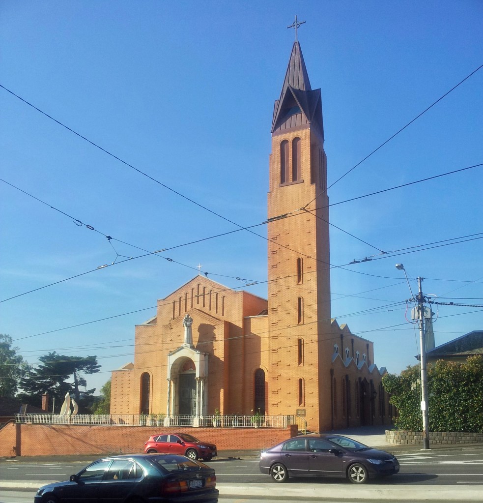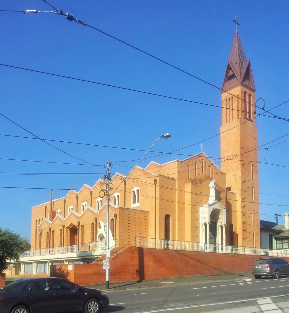 This was always a landmark for me coming into town from Camberwell as a kid – a very grand church on the corner of Power Street and Wallen Road Hawthorn. It’s actually not a church, but a Shrine, dedicated to St Anthony of Padua, patron saint of the lost. It’s one of the last churches built in Melbourne with such traditional features, in a stylised Romanesque, complete with spire, built 1962-69. Inside it’s even more traditional, with a coffered ceiling and lots of classical shrines and altars, most imported from Italy, and a lot of frescoes (not my photos). It’s run by the Capuchins, and very much a pillar of the Italian community, and one of the first purpose built by and for them- it’s a long way from the postwar Italian home of Carlton though, because the church had previously purchased the two Victorian houses on the corner, and gave them to the Capuchins after inviting them to Victoria in 1949. The houses are still there, behind gardens, with the church basically occupying their backyards (!). The architect was Gregore Hirsch, another long story, Romanian Jewish, India in the 40s and converted, here 1948, quite successful but mostly in modern styles. Last thing, the copper top of the spire decayed and was replaced in the early 2010s with a less steep version, and no angel. My photos 2014.