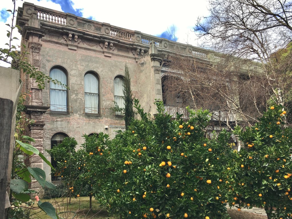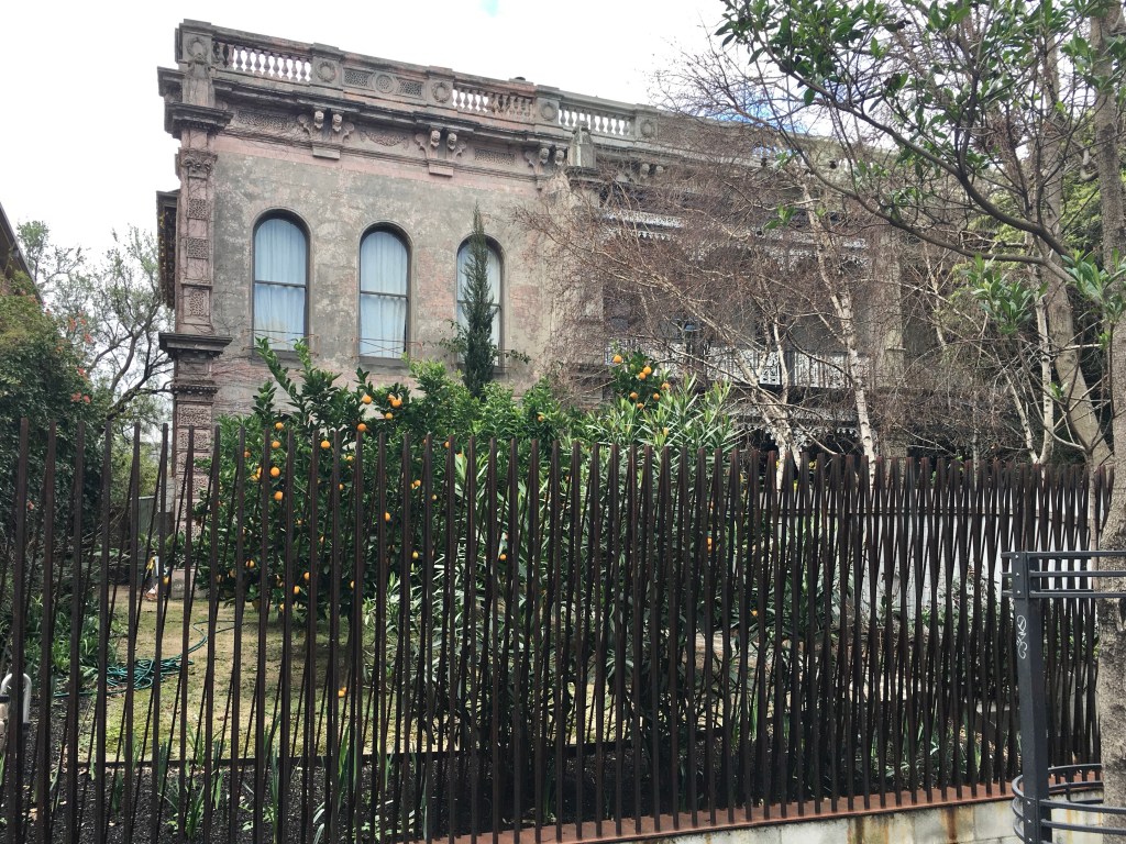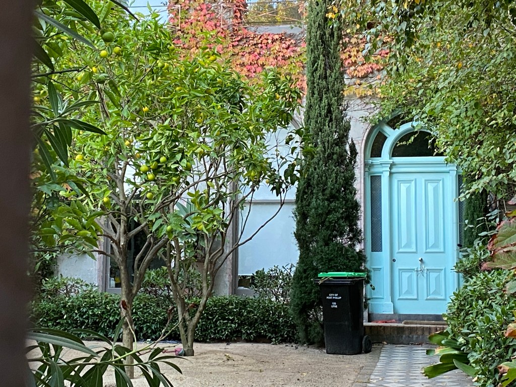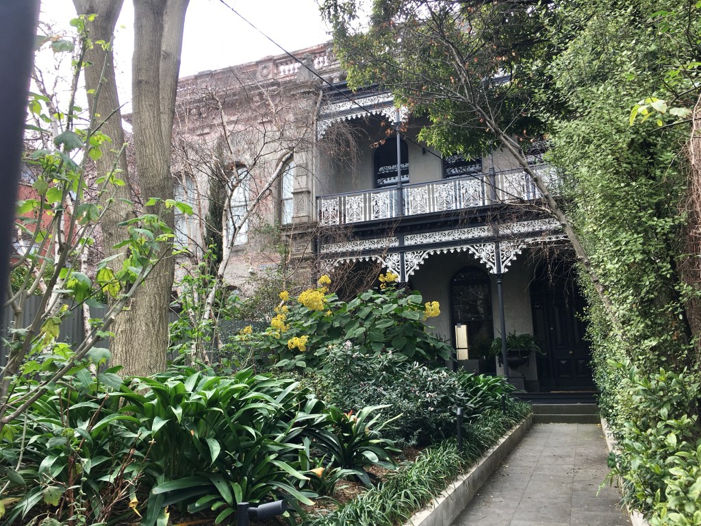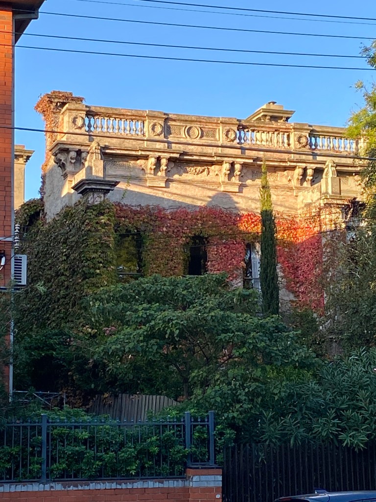 It’s a pretty grand terrace in Grey Street St Kilda, possibly 1870s, maybe 1880s, set back behind large gardens, and the most visible one missing its verandah. But lots of great detailing up top. (Beautiful autumn creepers too in 2025).