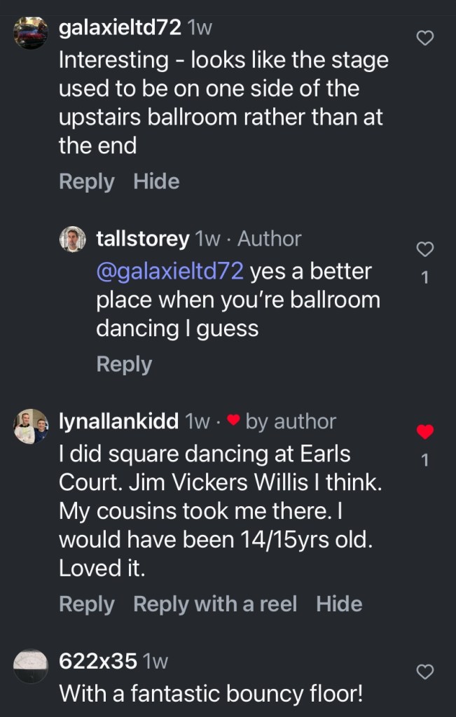 It had been the Lyric open air cinema from 1913, rebuilt as the Mayfair with a cabaret downstairs and dance hall upstairs in 1928. Then in 1932 it was transformed again with castle style front, complete with moat and drawbridge (somehow), with a cinema downstairs (for ‘talkies’), and refreshed dance hall upstairs, with a proper sprung floor, continuing the castle theme. Seems it had dances, bands and dinner shows too.