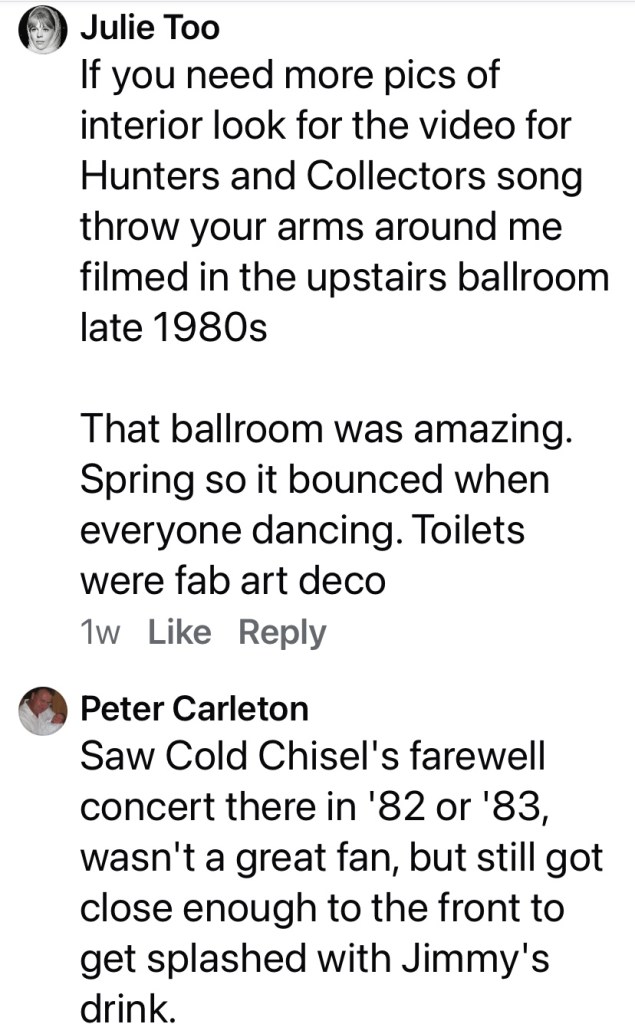 By the early 80s it was The Venue, featuring punks and new wave, all that crazy live music scene, but seems to have closed in 1988. The site is now a rather large old folks home, I think operated originally by the St Kilda Council Housing branch. It’s in a perfect evocation of mid postmodern, looking very Art Deco, but using tubular steel and baby blue.