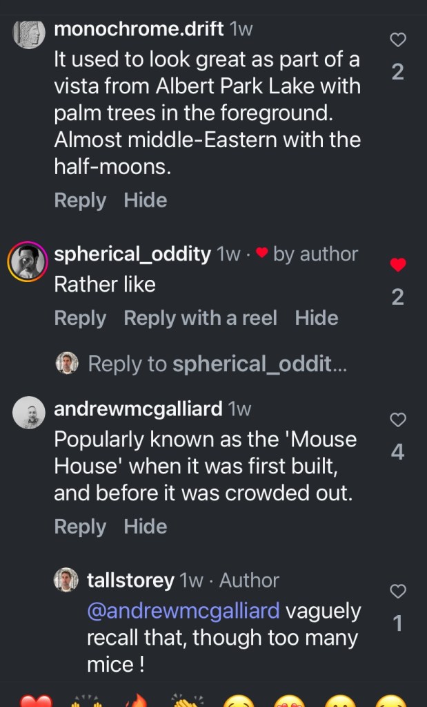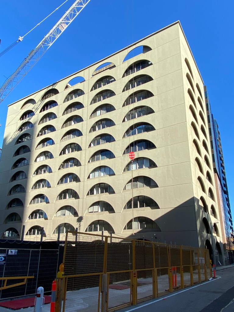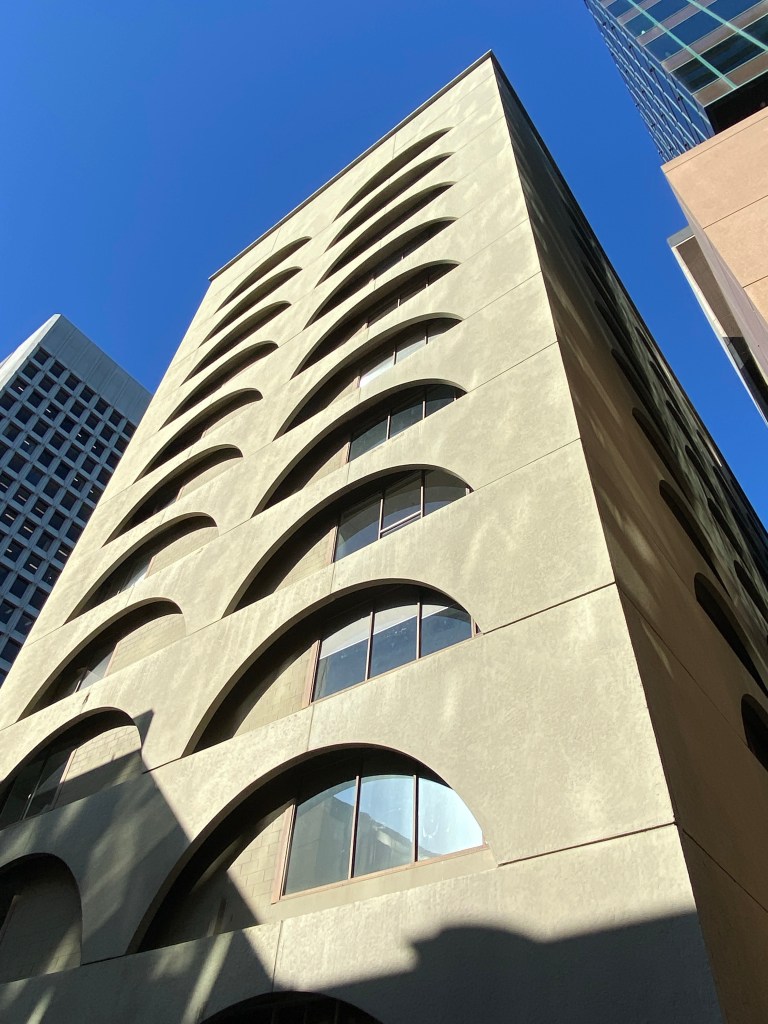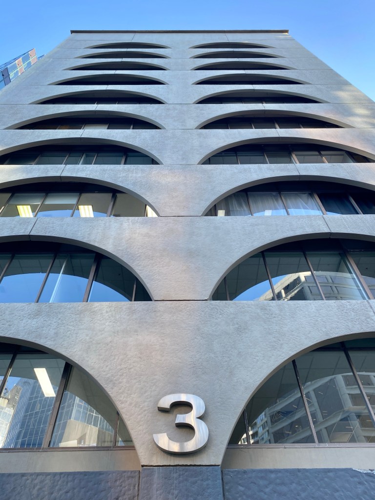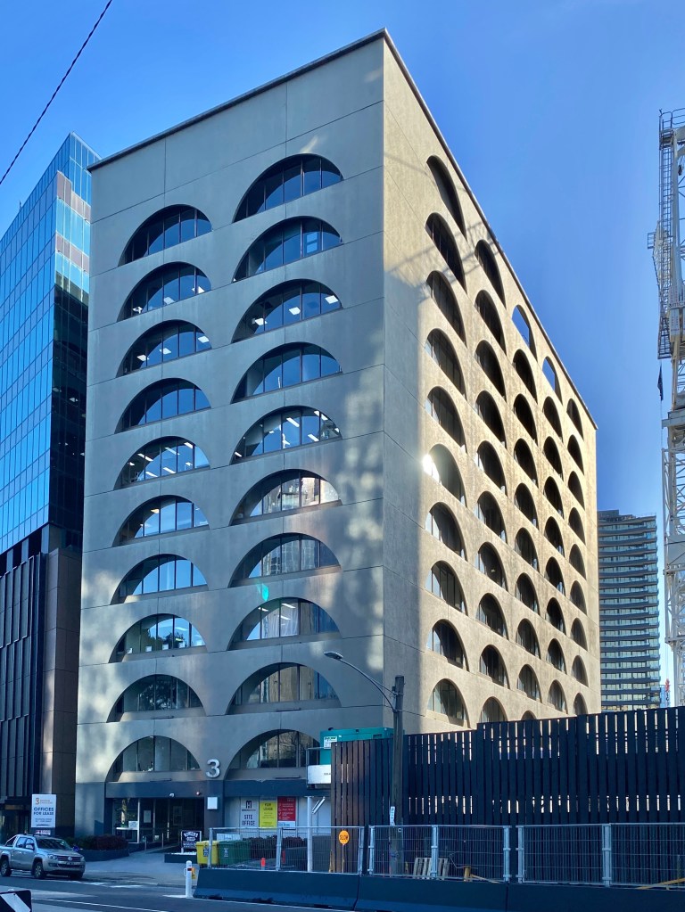 I’d only ever glimpsed this one from a distance in passing – it’s 3 Bowen Crescent, off St Kilda Road, a bit more revealed recently by demo next door. Kind of wild, almost eye-straining use of stacked low arches done as a screen wall, a cheery op-art idea by Lumsden Ashton & Hale, and built in 1972 for Equitable Life. D Graeme Lumsden gave us similar fun architecture at the Petersville ice cream factory (sadly abandoned) and the zippy Royal Mail House in Bourke Street.