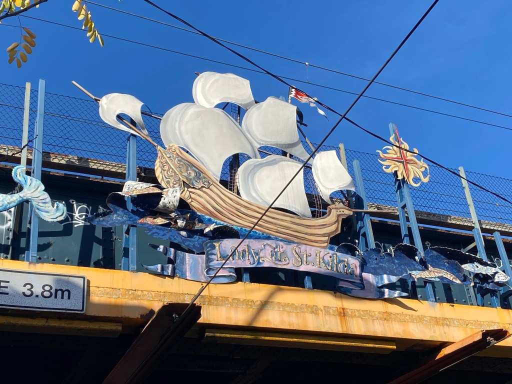 Im not usually a fan of local government commissioned public art, but this one is rather cheery. It was chosen in a competition by the former City of St Kilda in 1993; they asked for something nautical, so the obvious choice was to depict The Lady of St Kilda, the ship that was moored off the beach in 1842 and leant the suburb it’s name. It’s by Alex Nemirovsky, metal enamel, 4m high, partly real partly painted 3D, and there’s mermaids, waves and starfish etc. and it’s the same on both sides of the railway bridge. It was also restored in 2015 by the artist.