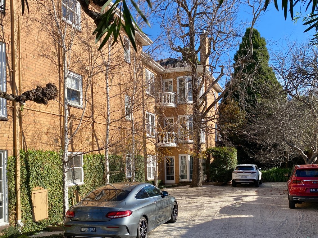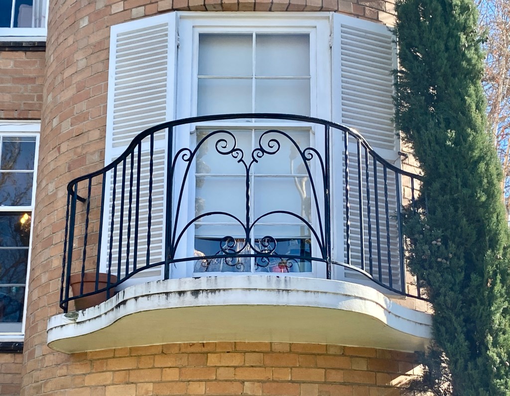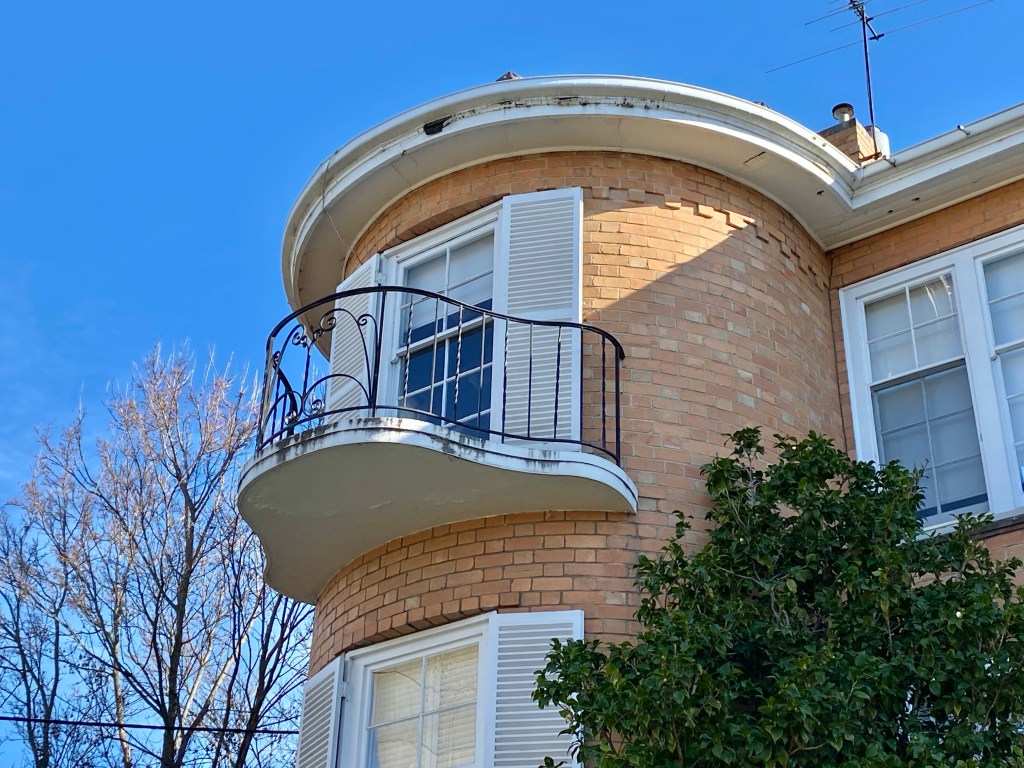 Havnt seen pollarding like this since the 70s ! But helps reveal the cute Regency-ish flats behind at 7 Wallace Avenue Toorak, just near the village. Real estate sites say 1930s, probably right, but can’t find out anything more. Love the way the rounded bays form towers, and the double curve balconies just stick out further. Then for the rear flats they used heavy balustrades, like something from the 60s. All one beds. Nice.