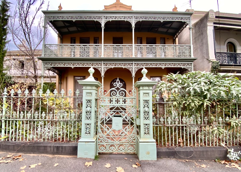 A fine large terrace house in Acland Street St Kilda that I snapped in 2018, and has since been painted up nicely – in rich beige with olive drab trim and the cast iron in eau-de-nil trim. (Looks like there’s brick under the paint though, at least around the door). So much more appropriate than black and grey.