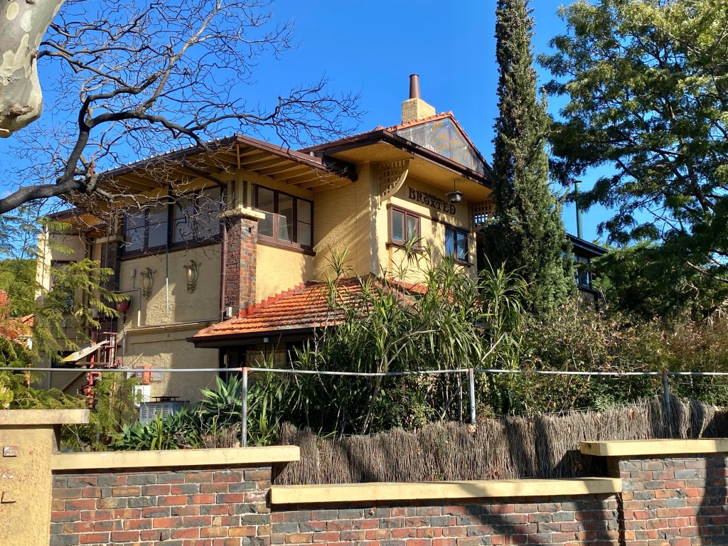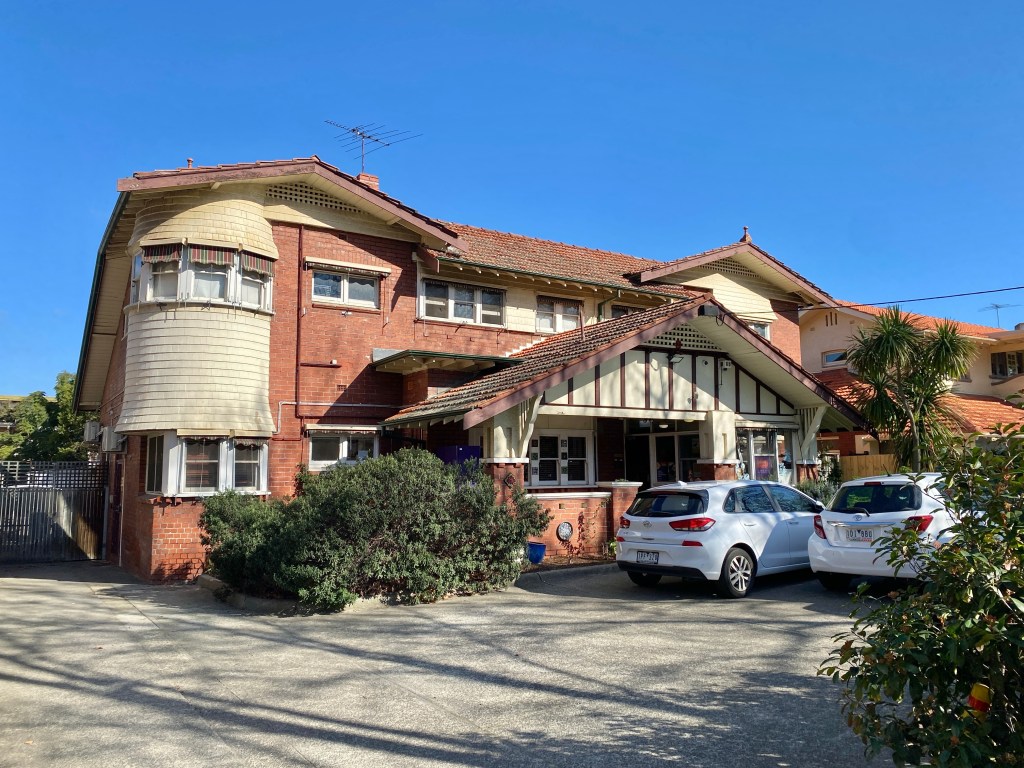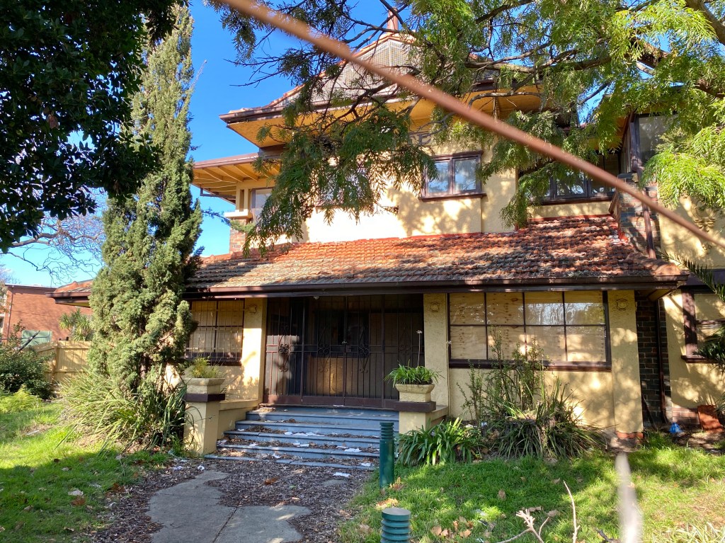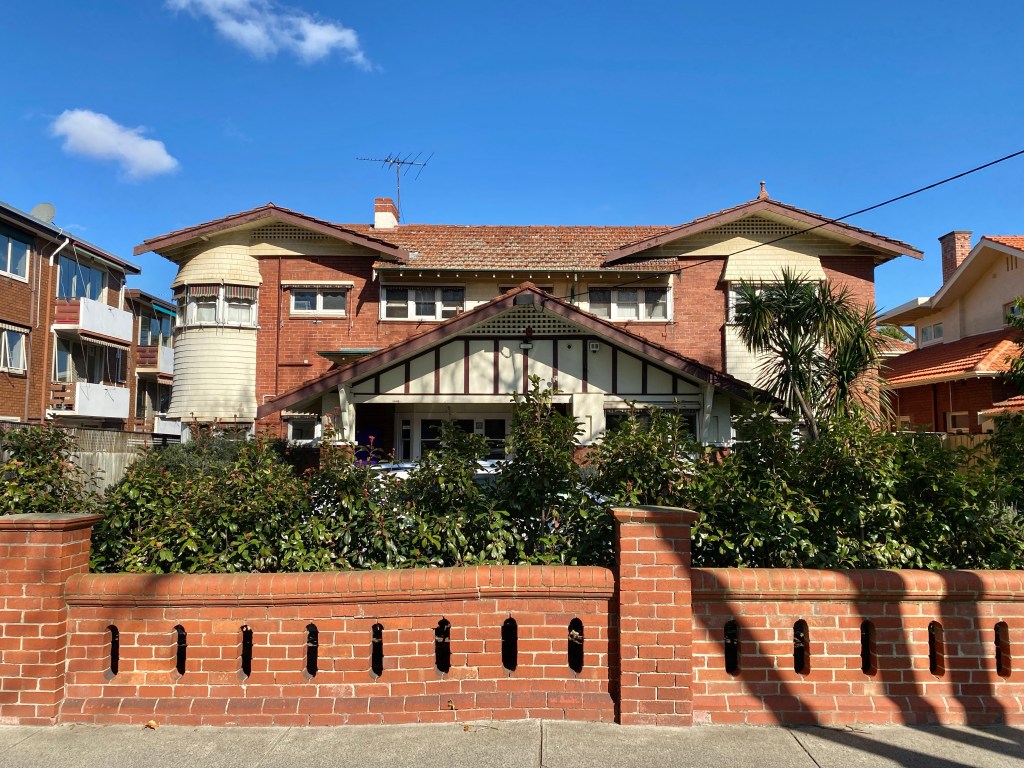 A house in Dandenong Road East St Kilda that’s seen better days – and pretty notable too. It’s called Broxted, and was built in 1918 by Howard Lawson as his own home. He was a pretty prolific architect /developer, starting out about 1912, best known for the 1930s Beverly Hills flats in Sth Yarra. But here, with the new electric trams along Dandenong Road, he developed a dozen houses and flat blocks in this area, and lived here too.