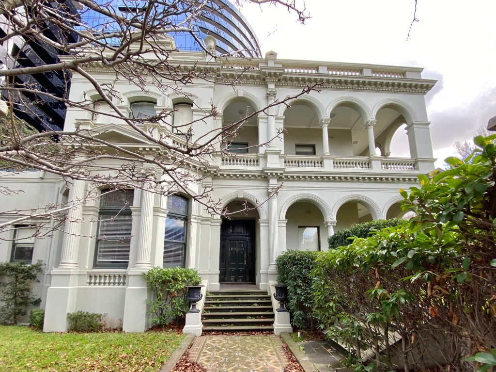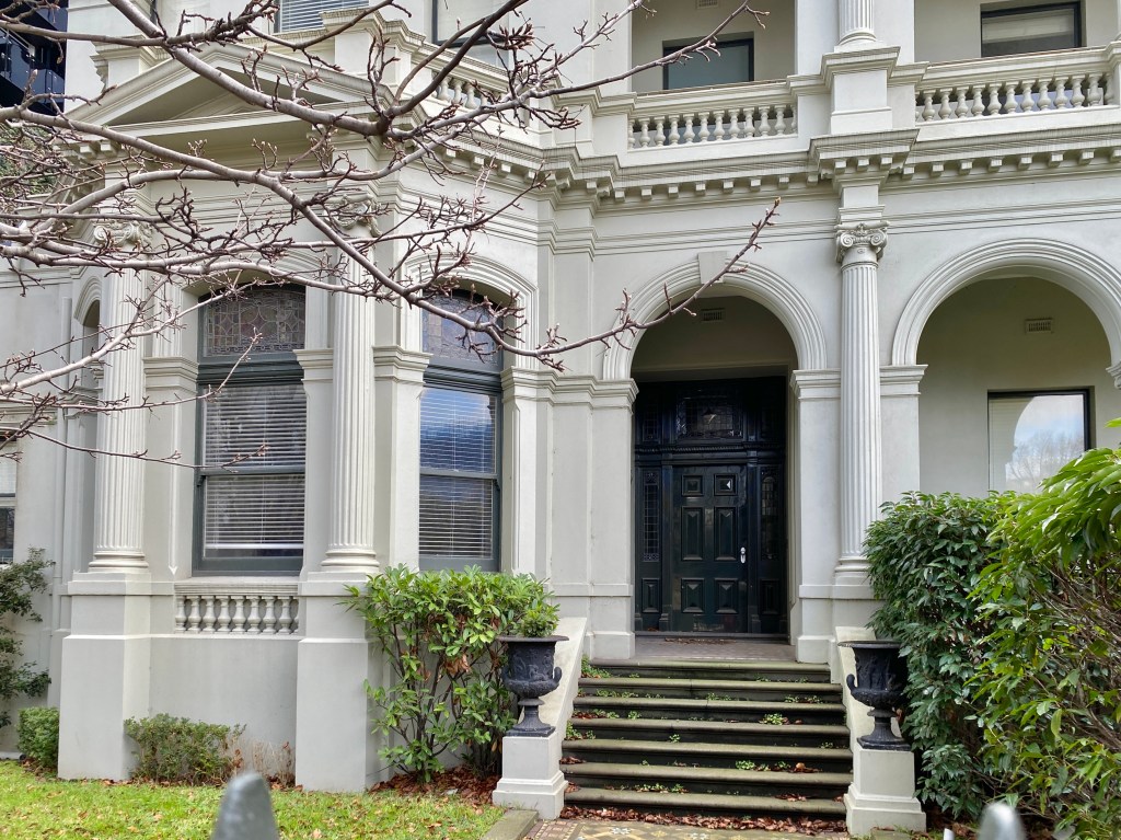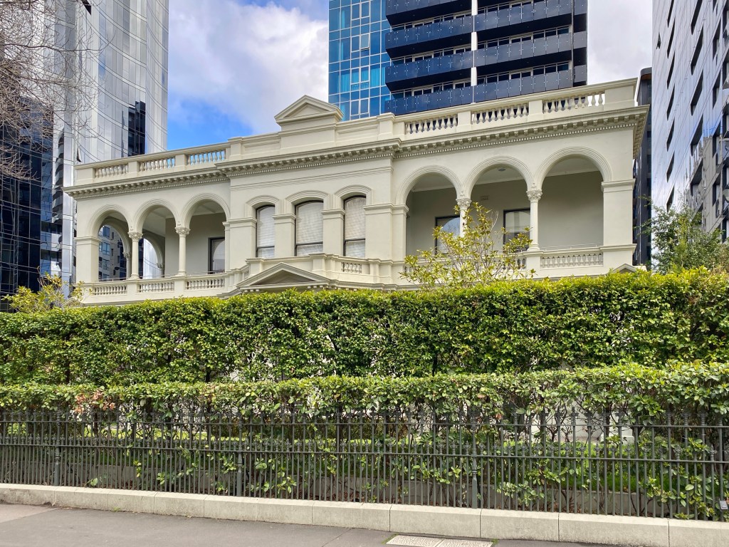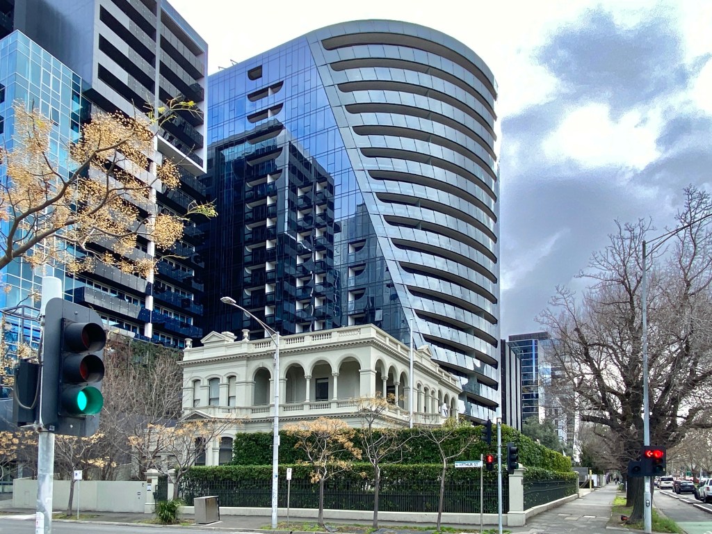 Airlie, another one of the dozen or so mansions left in St Kilda Road/Queens Road, now of course dominated by glassy blocks behind and next to – and in fact the curvy one (called Opera) seems to point down towards it.