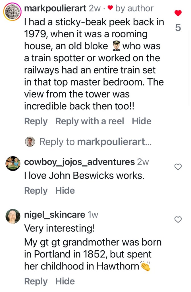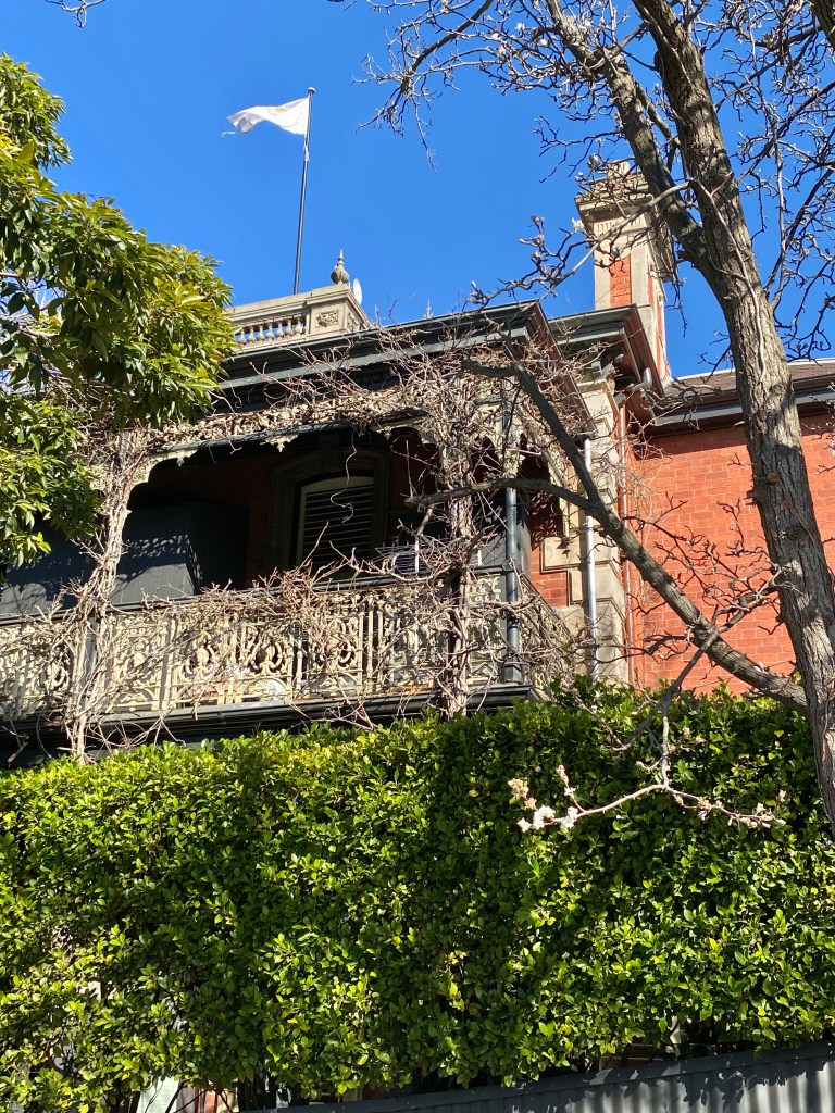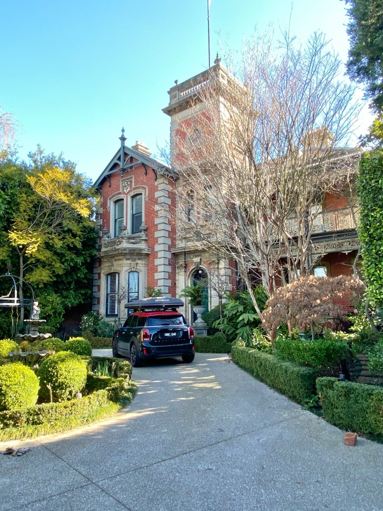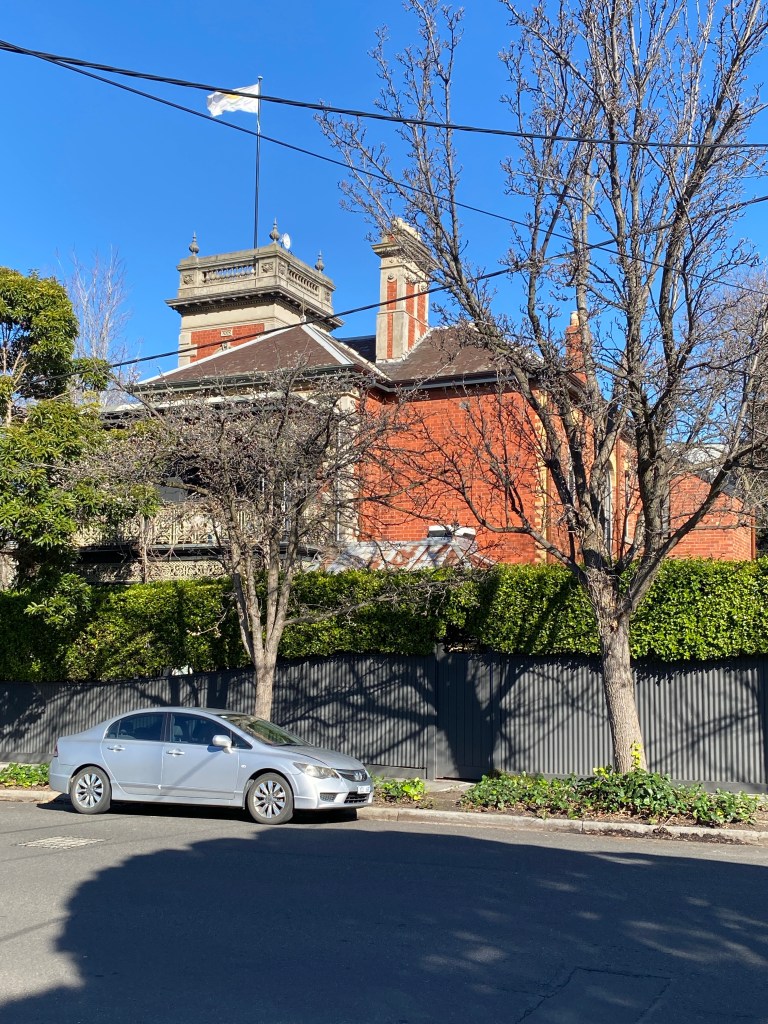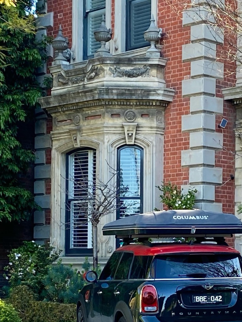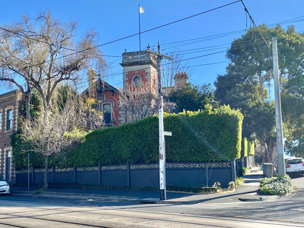 A grand mansion, or perhaps large house – but it does have a tower ! And it’s called Huntingtower (and said to have great views). Dating from 1890, it’s in Church Street Hawthorn, and in my memory was once much more visible, but you get a good view from the gate.