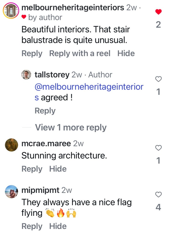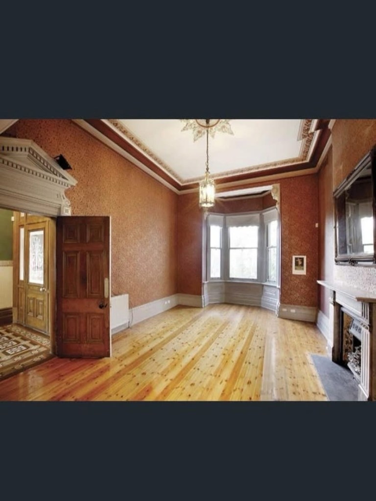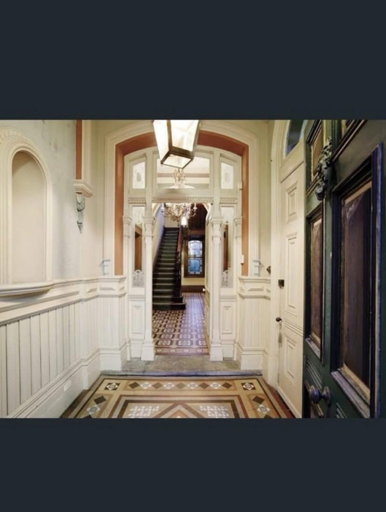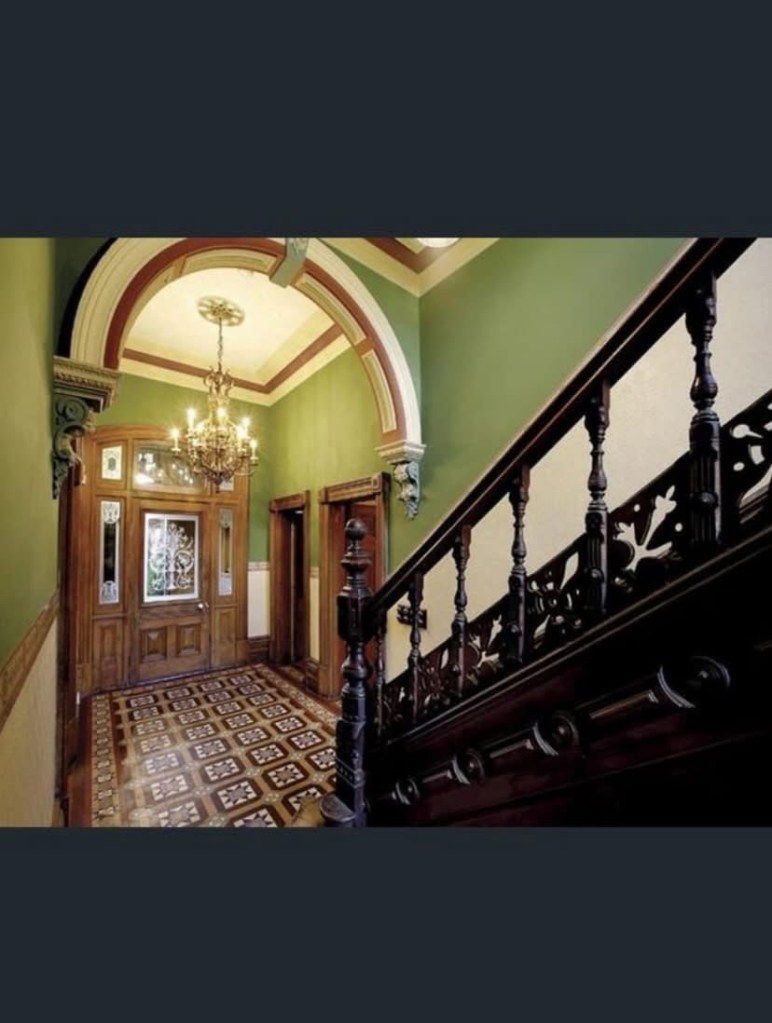 Real estate pics show the interior is pretty bloody good, and even more Queen Anne, like the stair balustrade. And it’s got a tessellated tiled hall. And I like the green upstairs.