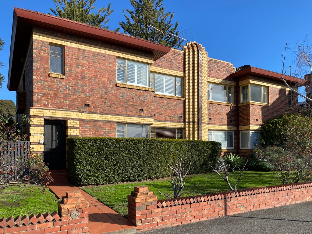 Rather striking, with the winter sun picking out all the colours, and it looks very neat too, with a very tidy garden. 1298 Malvern Road Malvern. It’s pretty simple actually with just that massive vertical fin, some stripes, and brick quoins round the entries. It was built in 1939, probably designed by the builder WH Bruce, for Mr & Mrs Reed, from Brunswick – this was a time when mum and dad and often just mum, and especially widows, invested in flats, through a builder or real estate agent who organised everything, before shares got popular. In this case it’s just four flats, all the same I think, with one bed and a dining room as large as the lounge, for young couples or singles. I’m a bit surprised it’s heritage listed individually given its ordinariness, but it is very appealing.