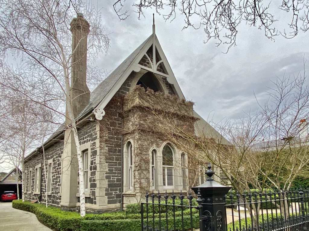 This house in Sorrett Ave Malvern is so neat and so unusual that I thought it was a recent attempt at Victorian Gothic, despite the prominent 1890 over the entrance – but no it is indeed authentic. Built for and presumably designed by George Jobbins, who did lots of classical banks. That tall gable with a battlemented porch is quite striking, and from real estate pics seems it’s an attic room accessed by a spiral stair ! Gosh.