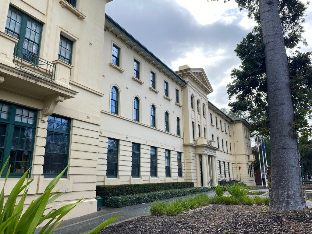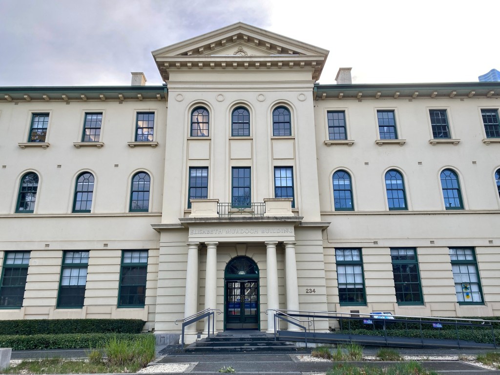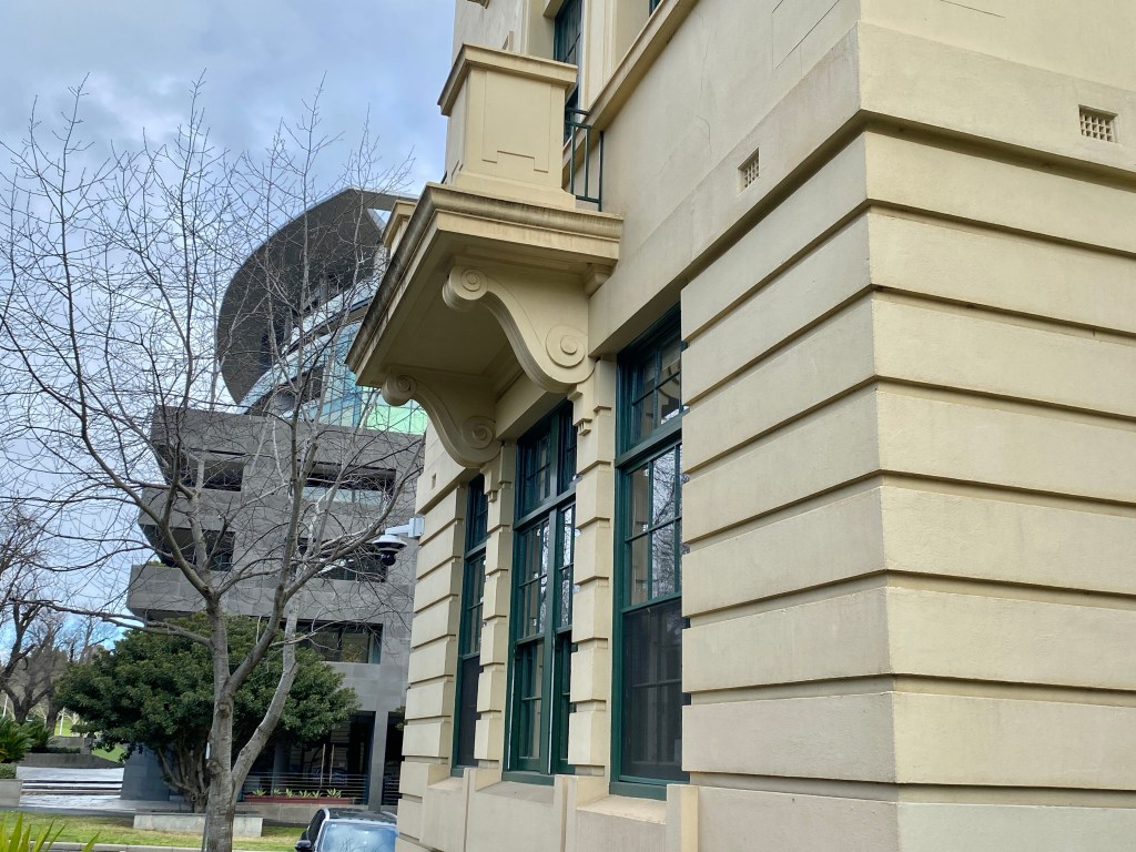 The former Police Barracks on St Kilda Road is rather grand, but also rather bland – it’s got a range of classical / Georgian details, but it’s all rather flat, but perfectly nice. Public Works Architect EE Evans liked a bit of no frills Georgian; Box Hill High is similar but much nicer.
