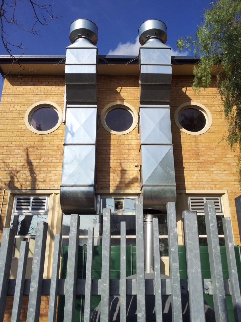 Former Richmond Girls High, Gleadell & Highett Streets, a curious blend of modernist and domestic – completed in 1954, it was a late design by Percy Everett who had been such a stylish designer up to then, not sure why he went in for pitched roofs in later projects, maybe they were cheaper. Nice rounded bit though, which was the original entrance, and leads into a little courtyard.