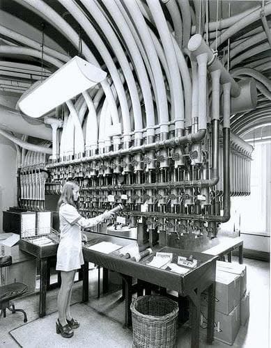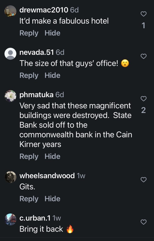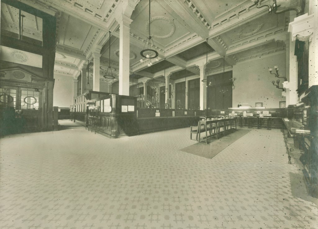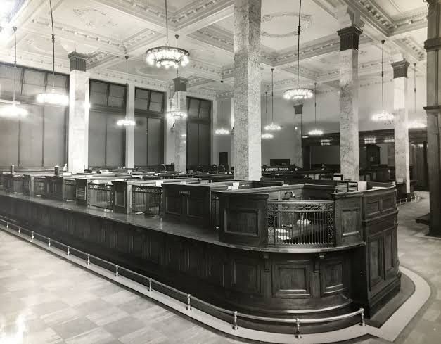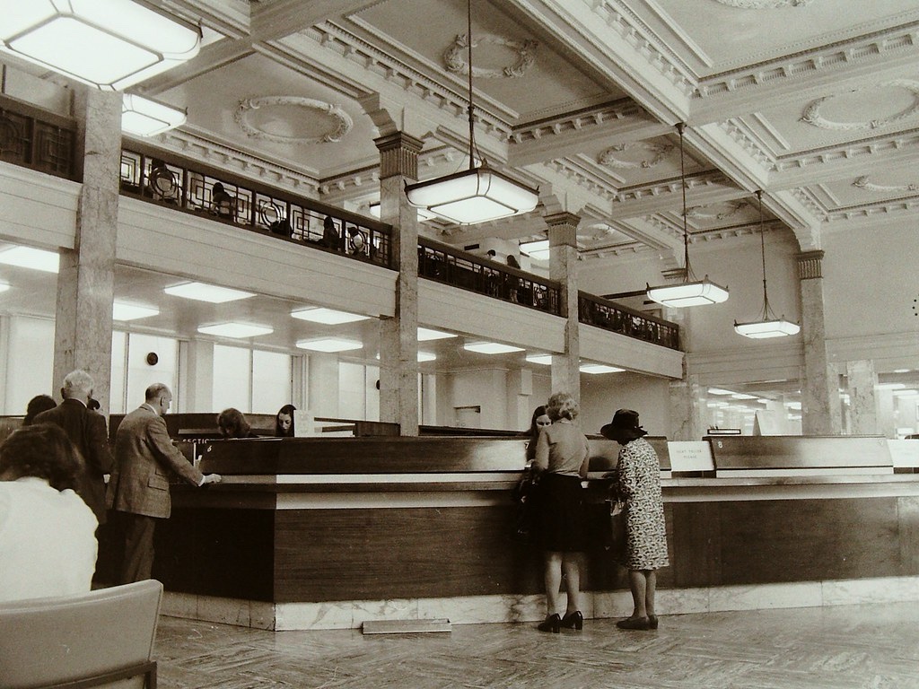 The banking chamber was largely the 1913 one, but extended in 1925 with more counters, which were all replaced by the 60s (third interior Graeme Butler). The @vic_archives has some great pics, including the loan managers office and a c1970 one of the delivery tubes 😮