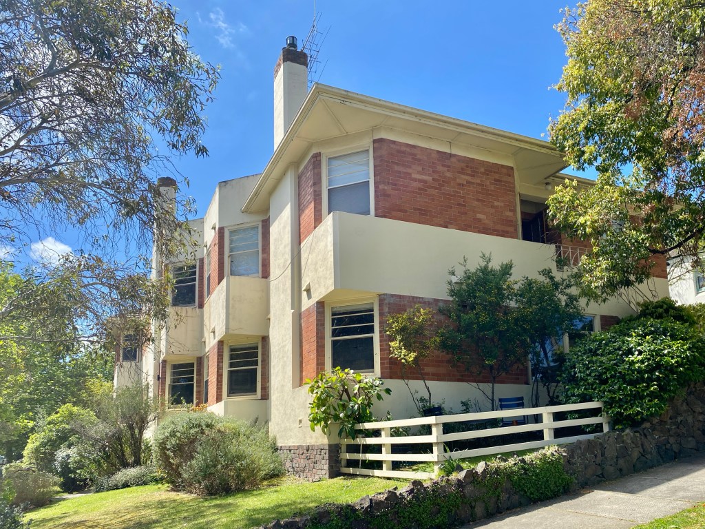 Some nice but not extraordinary Art Deco flats in Creswick Street Hawthorn, on a sloping site looking to the river. The only notable style elements are the broad horizontal stripes versus the stepped facades with chamfered corners creating windows on the angle. Not heritage listed so no existing research, but checking Trove contemporary newspapers I think they were quite controversial!