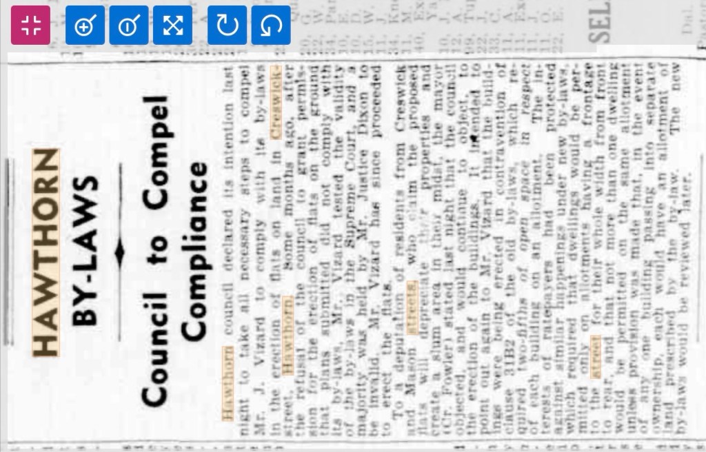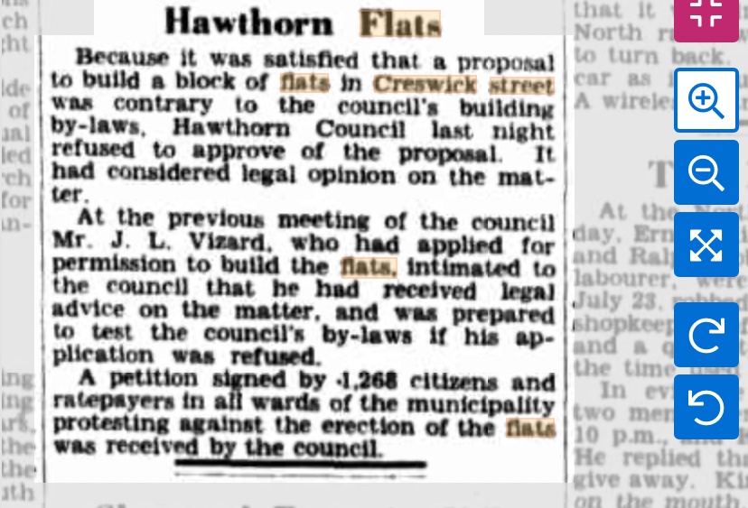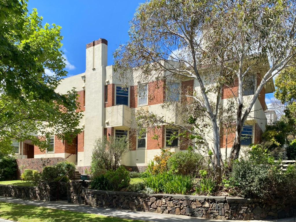 In 1938 Hawthorn Council claimed the proposed flats did not meet their many by-laws, prompted by a petition from 1268 ratepayers, who thought flats were like slums (even though there were 20s flats opposite). The builder, Lancelot Vizard (Steve’s dad I think), saw them off in the Supreme Court, which struck down many of the by-laws to boot. They were built in 1939, and since they’re the only Deco flats in the street, pretty sure this is them.