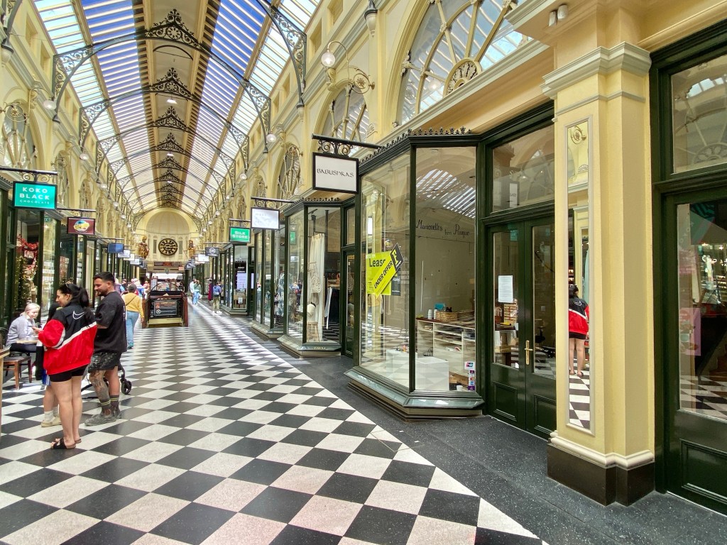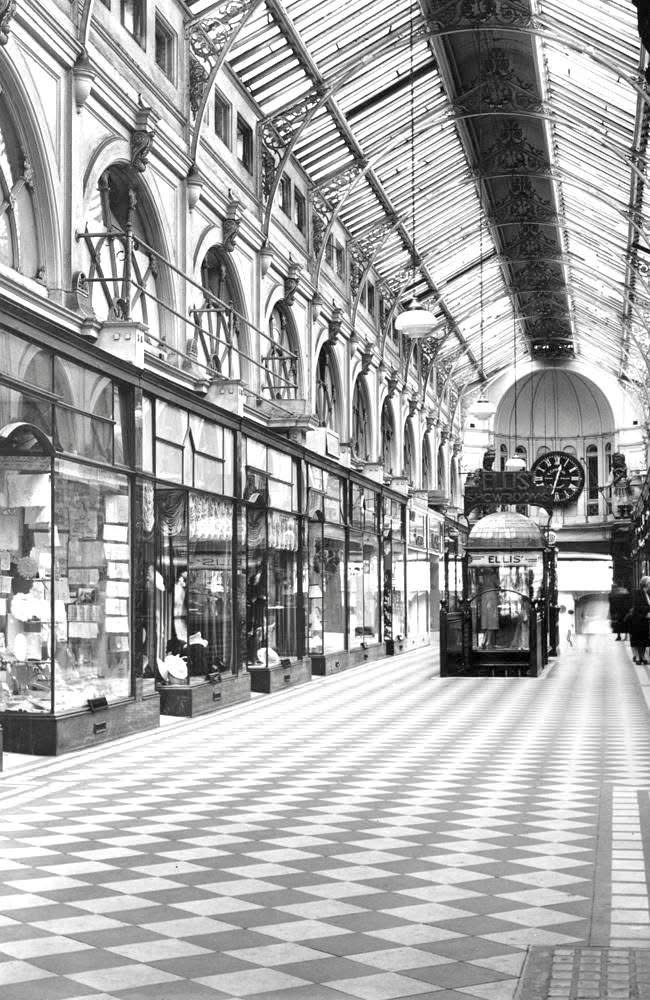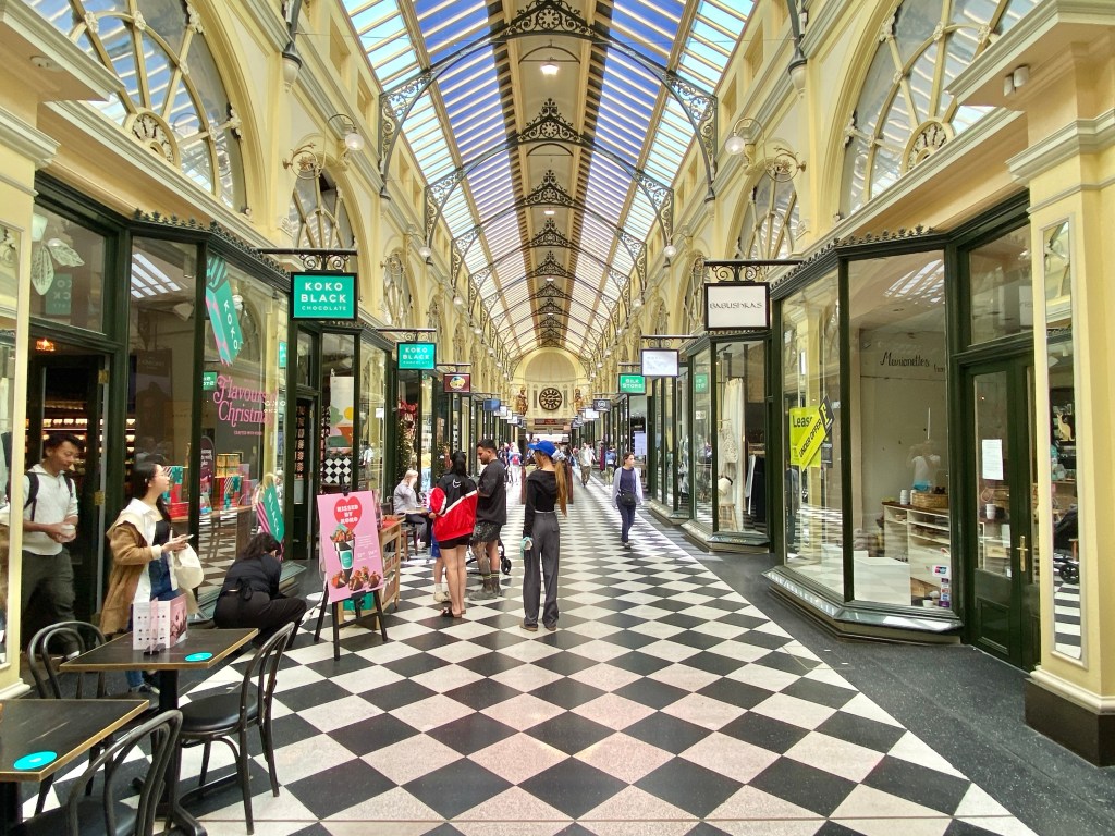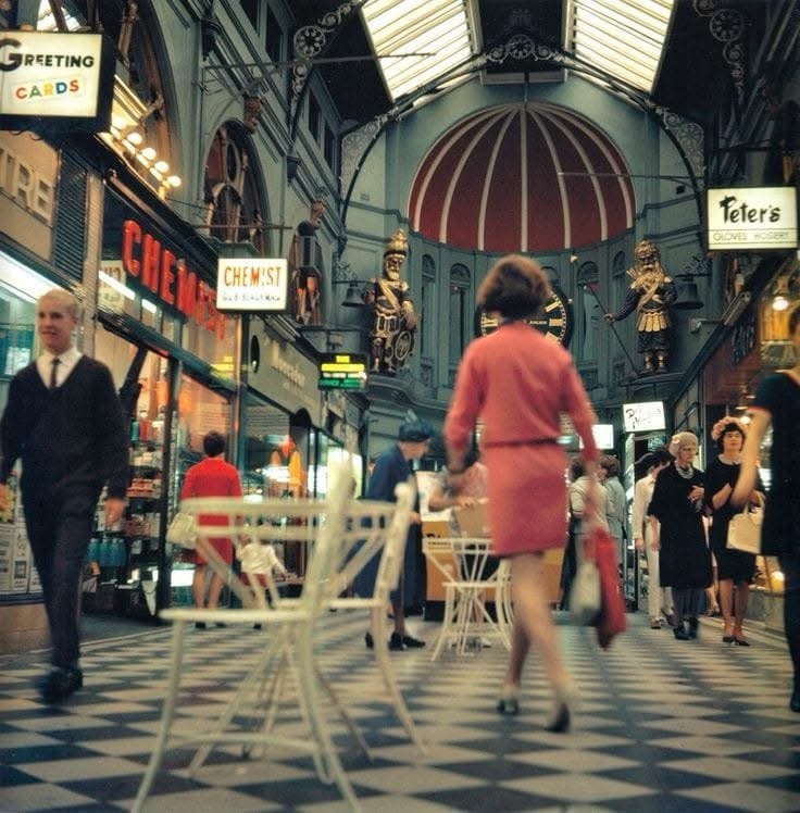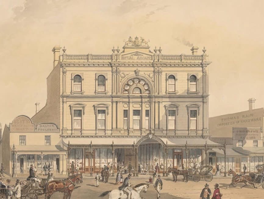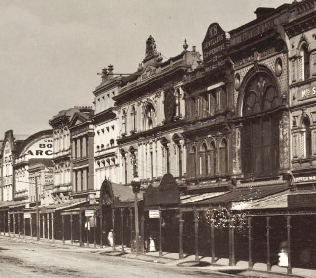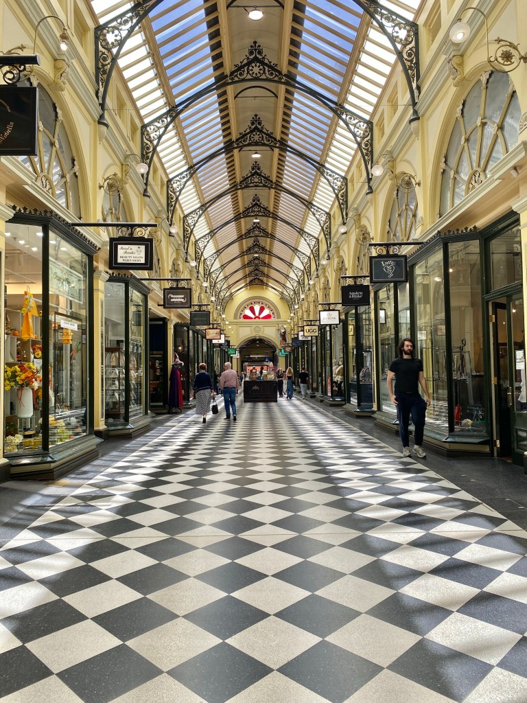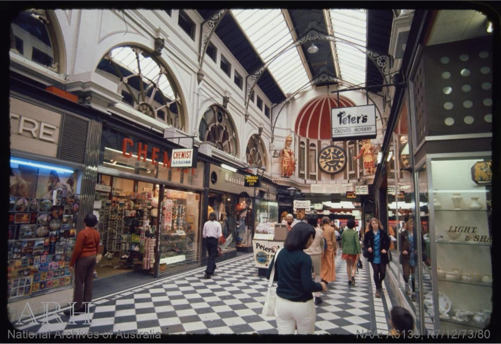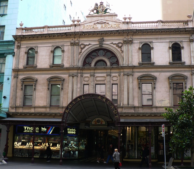 The beautiful Royal Arcade, which looks much like it’s ever done, elegant shopfronts, marble floors, glass roof on decorative cast iron trusses, lights on curly brass fittings – but actually it’s changed a bit from the 1870 original, designed by Charles Webb. Back then it had a slate floor and flat timber shopfronts, and a fountain down the end, very restrained and elegant, and a nice place to shop away from the dust and noise of Bourke Street.