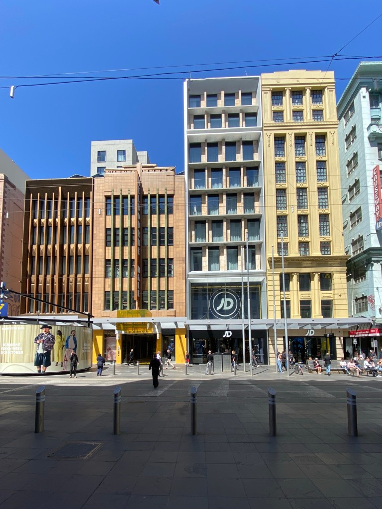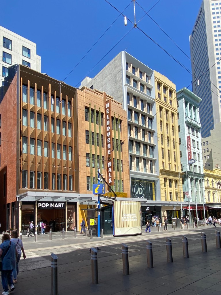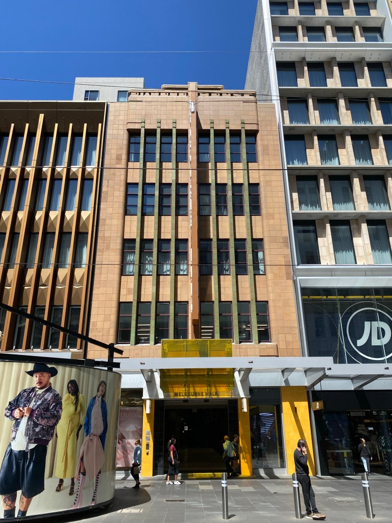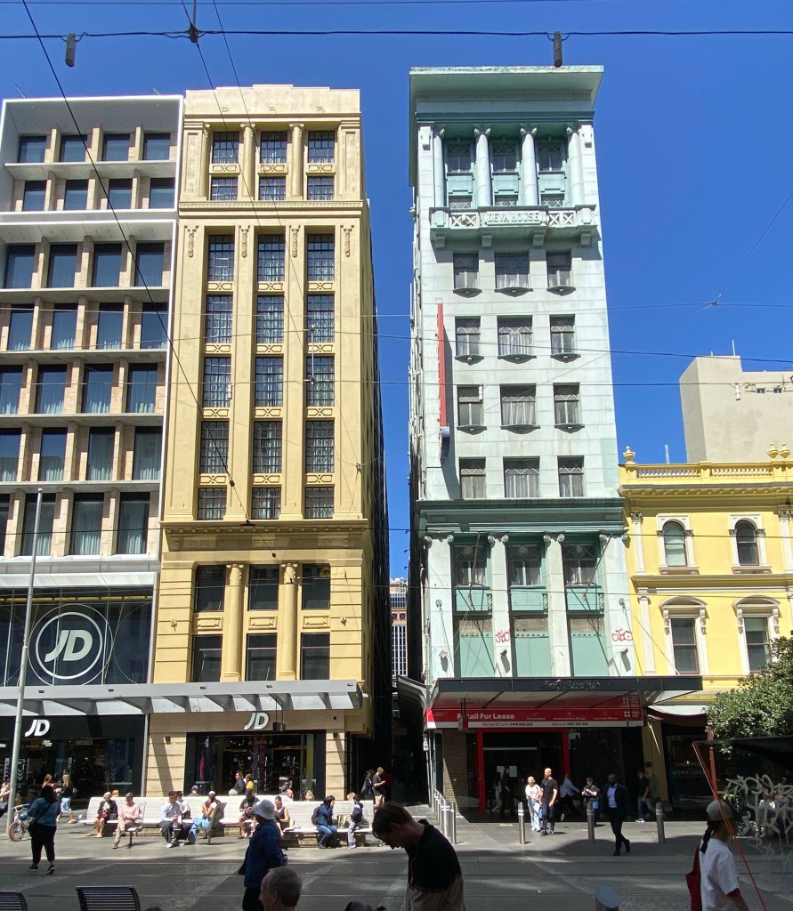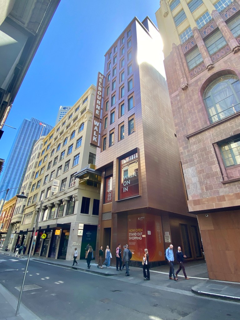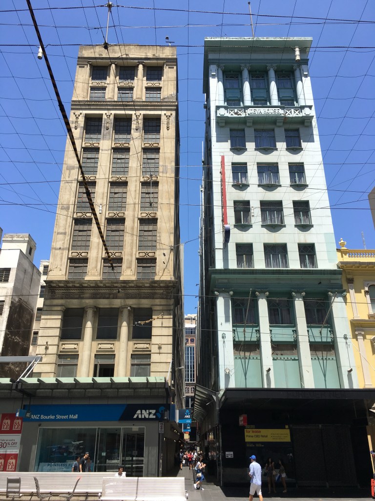 The all new Melbourne Walk development on Bourke Street, which looks very nice, does all the right things – except that only facades and some side walls were retained from the 5 heritage buildings there before (blue bits on the plan, and I’ve got some before pics interspersed). They were abandoned above the horrible ground level arcade, but more could have been retained.