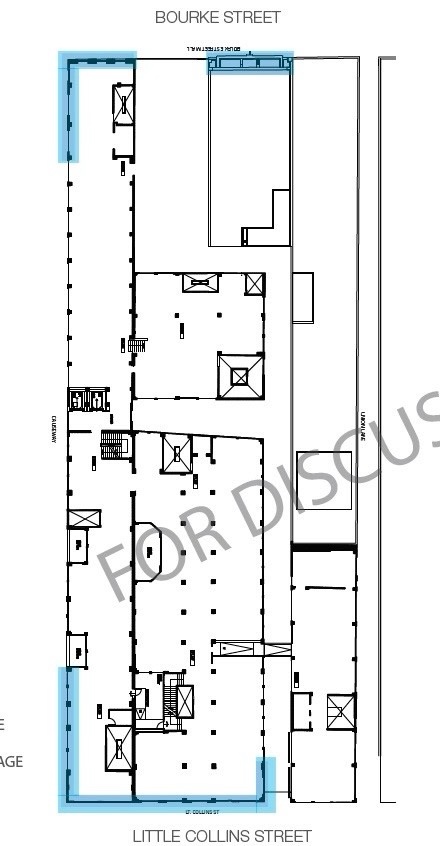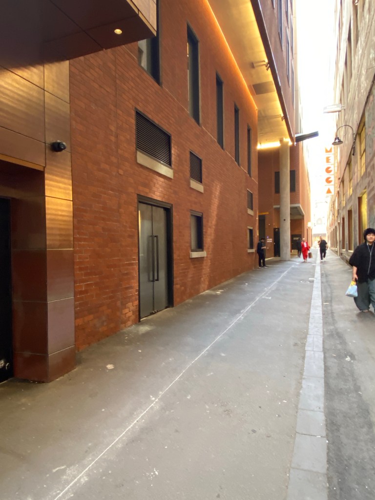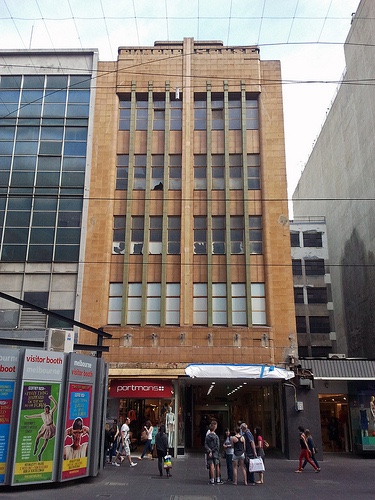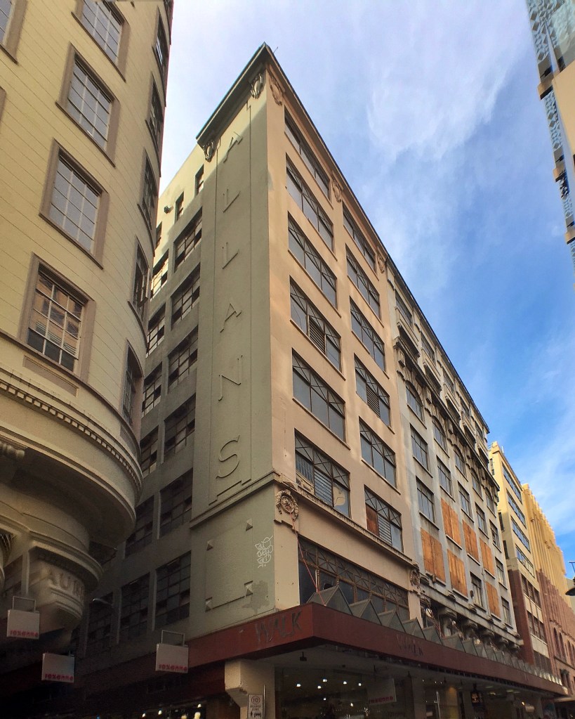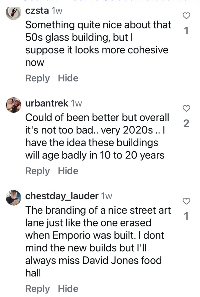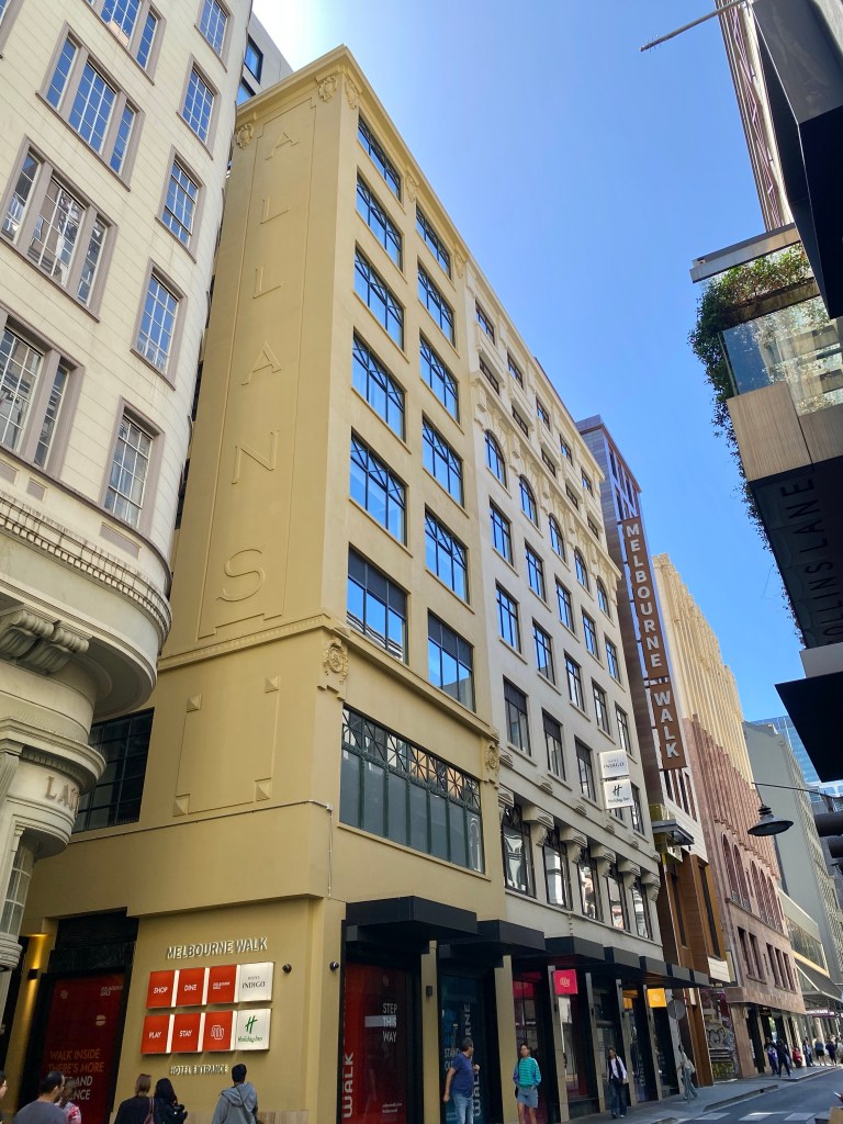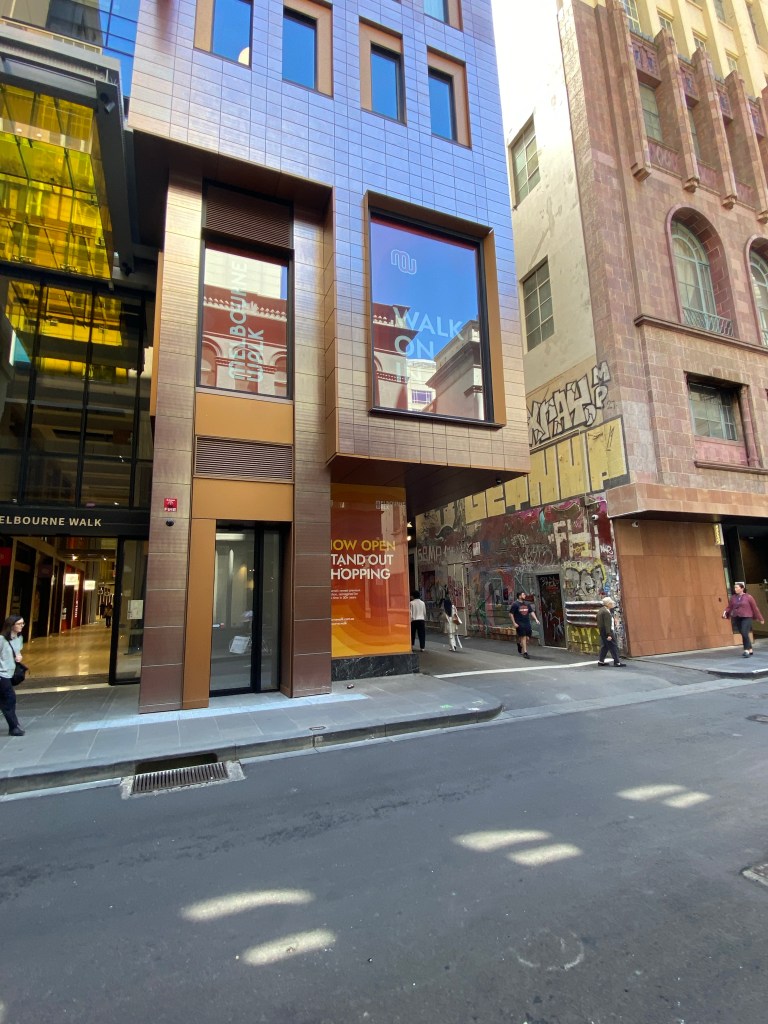 The all new Melbourne Walk development on Bourke Street, which looks very nice, does all the right things – except that only facades and some side walls were retained from the 5 heritage buildings there before (blue bits on the plan, and I’ve got some before pics interspersed). They were abandoned above the horrible ground level arcade, but more could have been retained.
