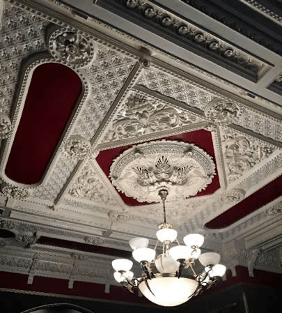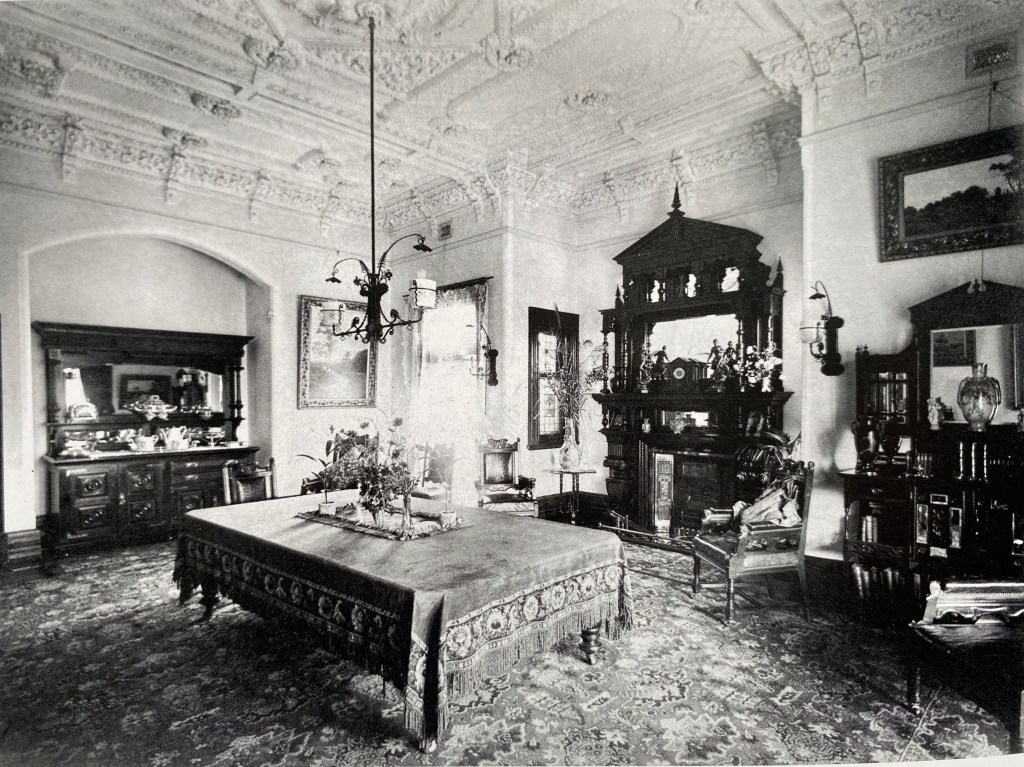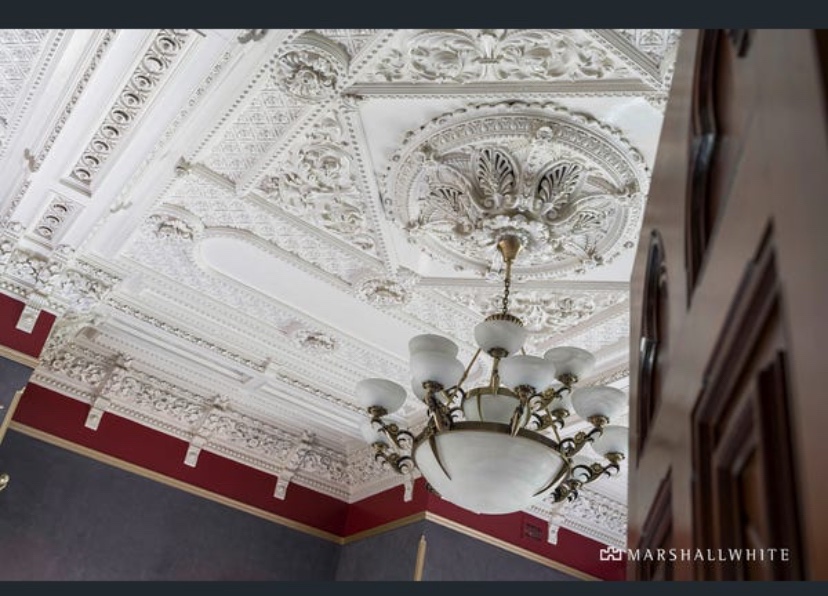 Beswicke had already taken up the very new Edwardian style of red brick and half timbered gables, and here ramps it up a notch, with that extraordinary gabled room on top of the tower, and a wide verandah round the corner turret with very rustic fretwork. Inside he went to town with those very elaborately detailed ceilings; I would have thought originally in many colours but the one old photo shows it was all white or pale.
