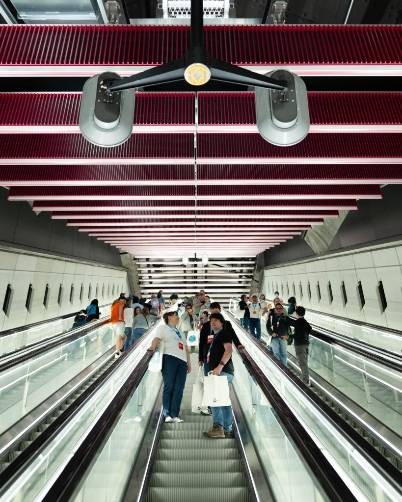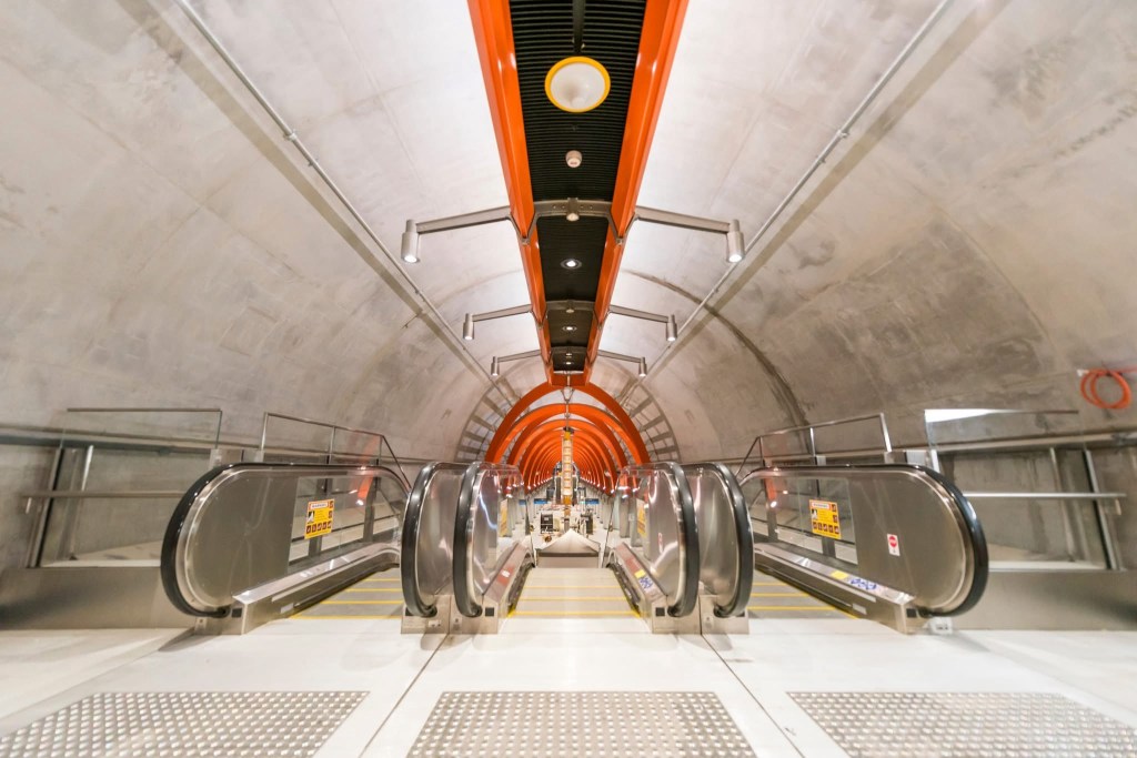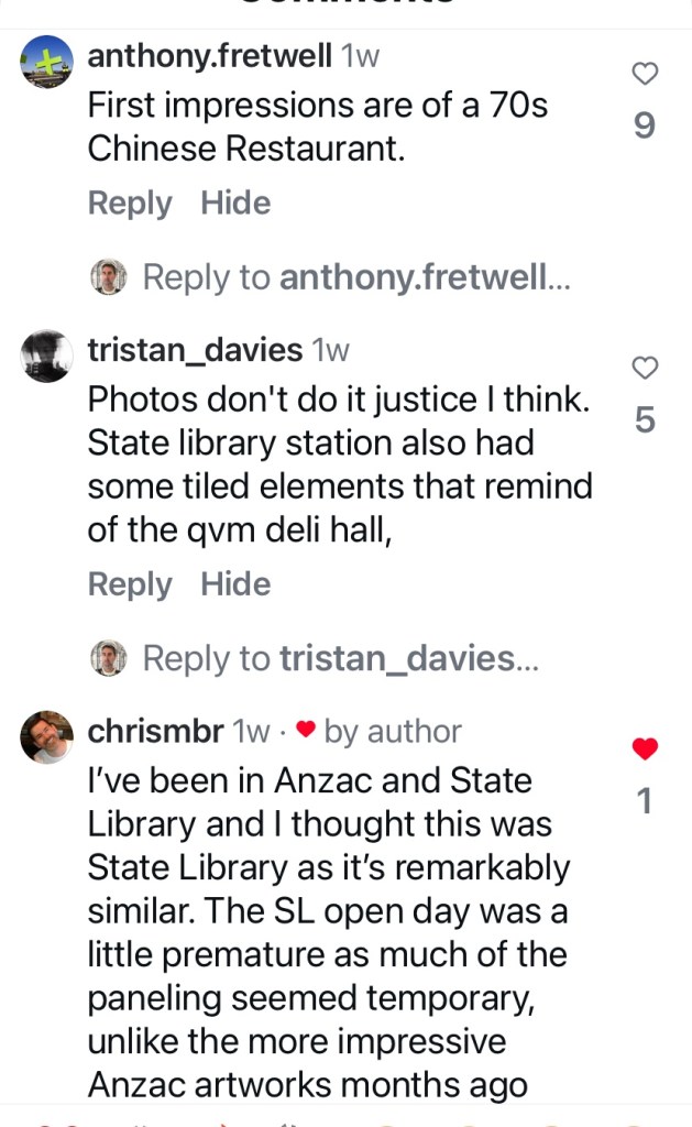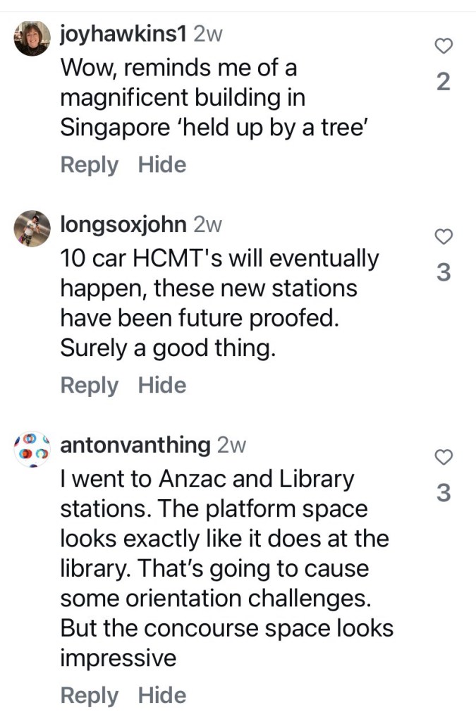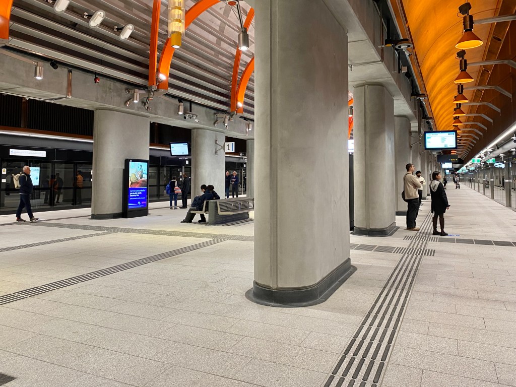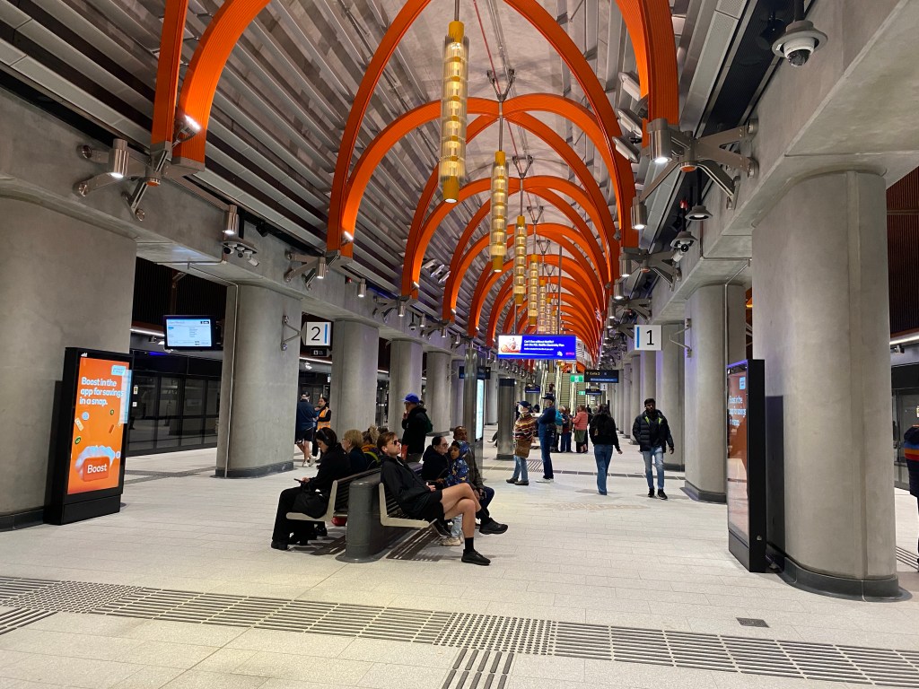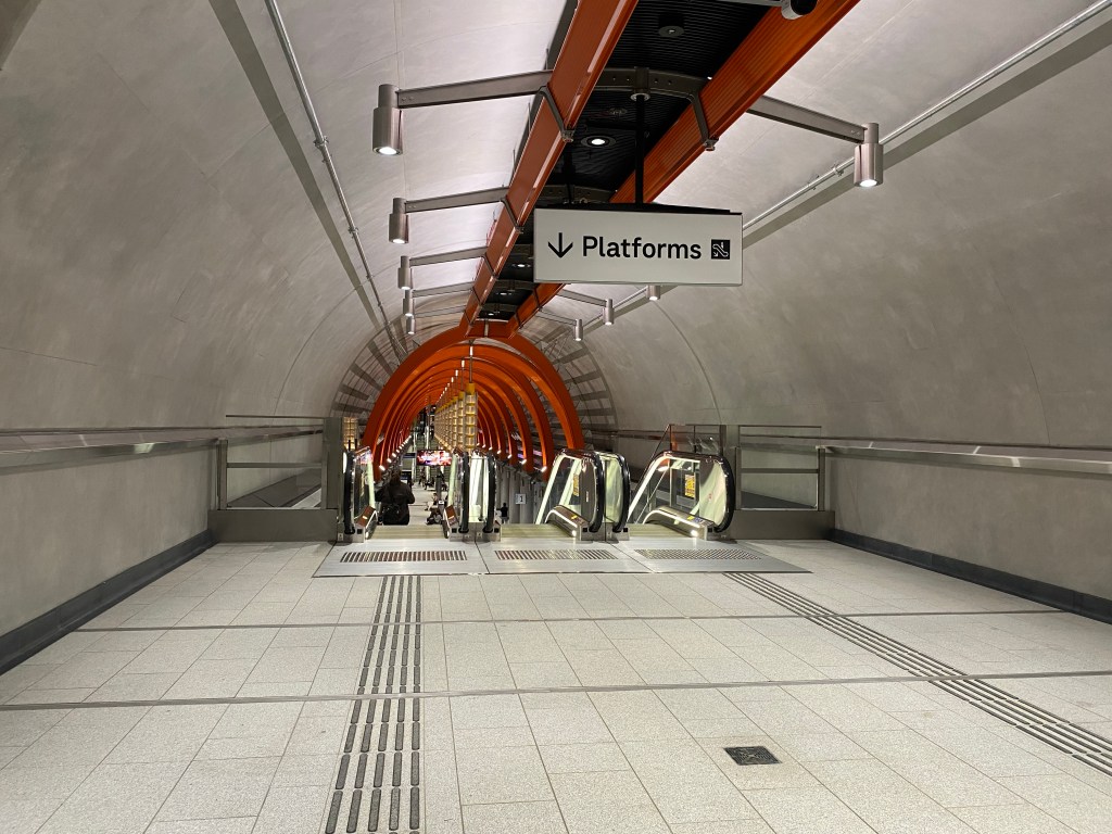 Town Hall and State Library have arched roofs at platform level while the others are flat bit open up to skylit areas (I think). Otherwise they’re all the same, I like the idea of being able tell which station you’re train is coming to, but then with the platform doors you’ll be relying on in-train announcements? There’s some pretty ordinary looking tunnels too, and the battens at the escalators and entrances are white on the way in and purple on the way out in case you don’t know whether you’re coming or going 😊