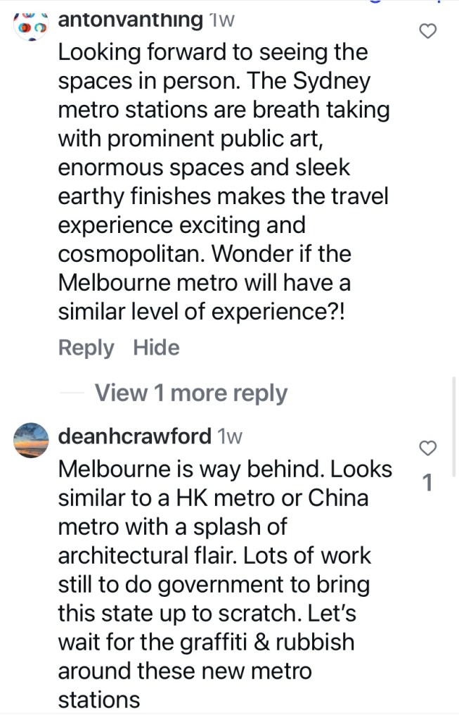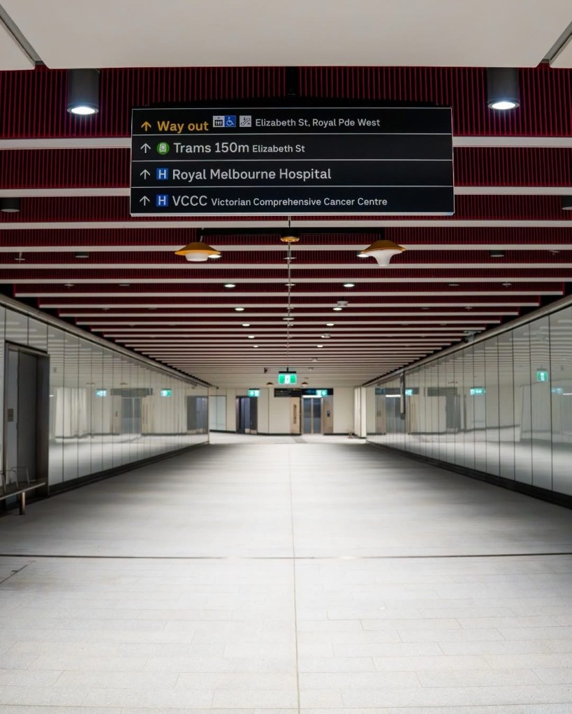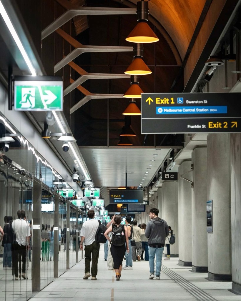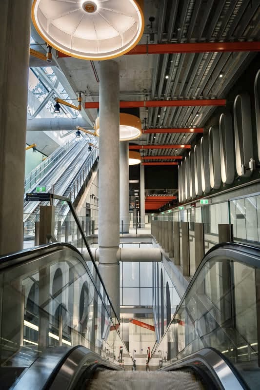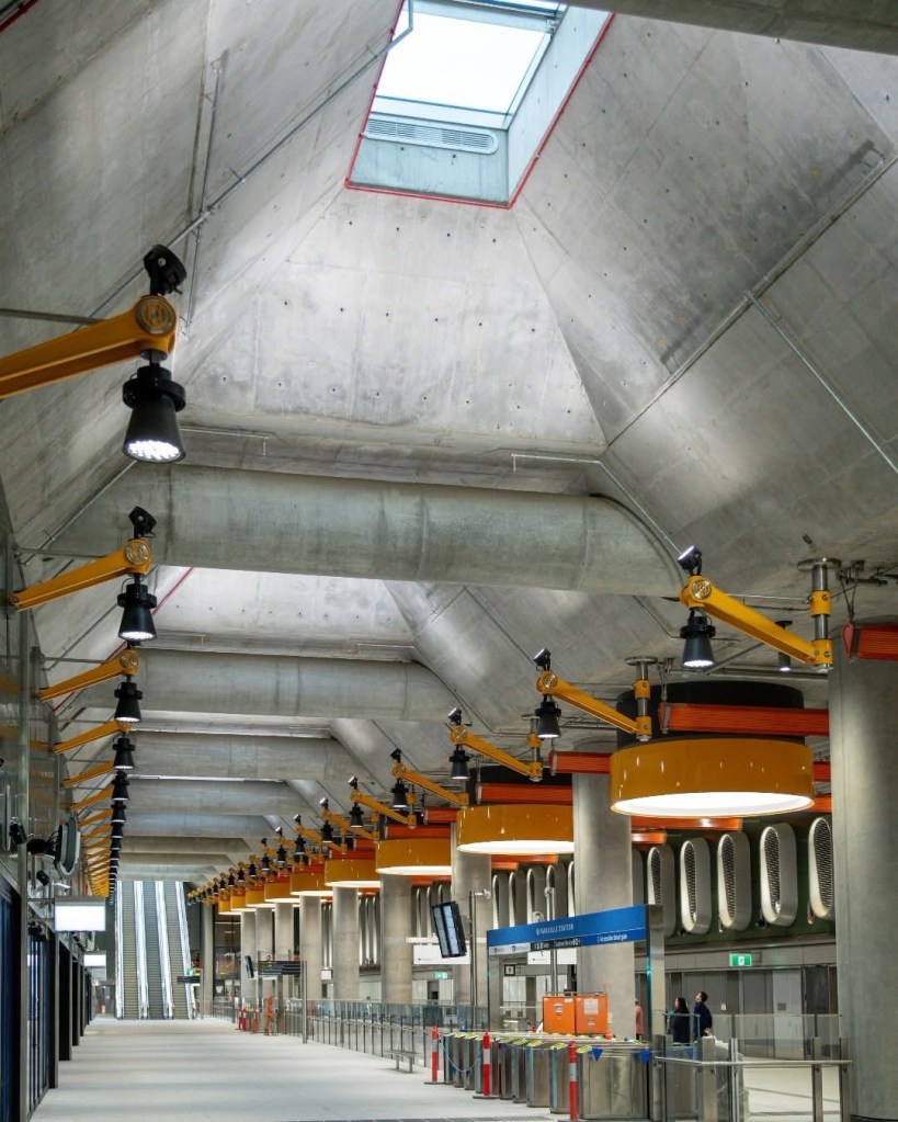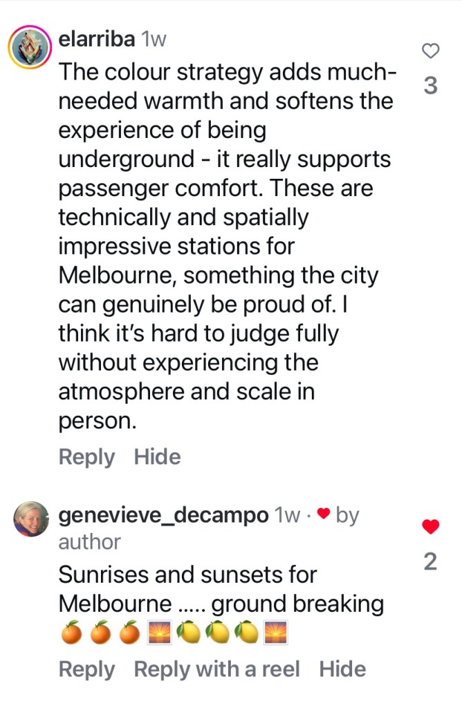 The Metro Tunnel is going to open for limited service soon, so I thought I’d see what I could make of the design underground – seems it’s all similar, bare smooth concrete walls and roofs, with lots of brightly coloured lamps, brackets and battens. The lead designer Ivan Harbour, from the international @rshparchitects, and Melbourne architect Ingrid Bakker, of @hassell_studio, said the yellow, red and pink is drawn from Melbourne sunrise/sunsets, a cheery idea though not particularly Melbourne.