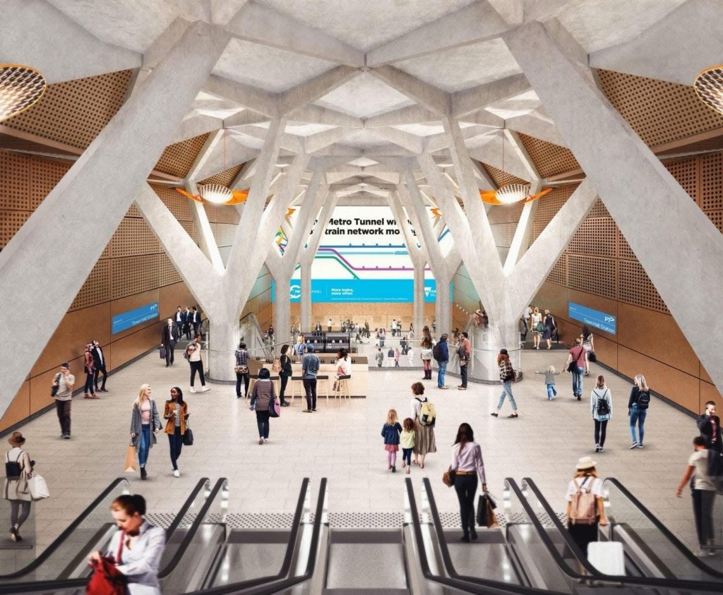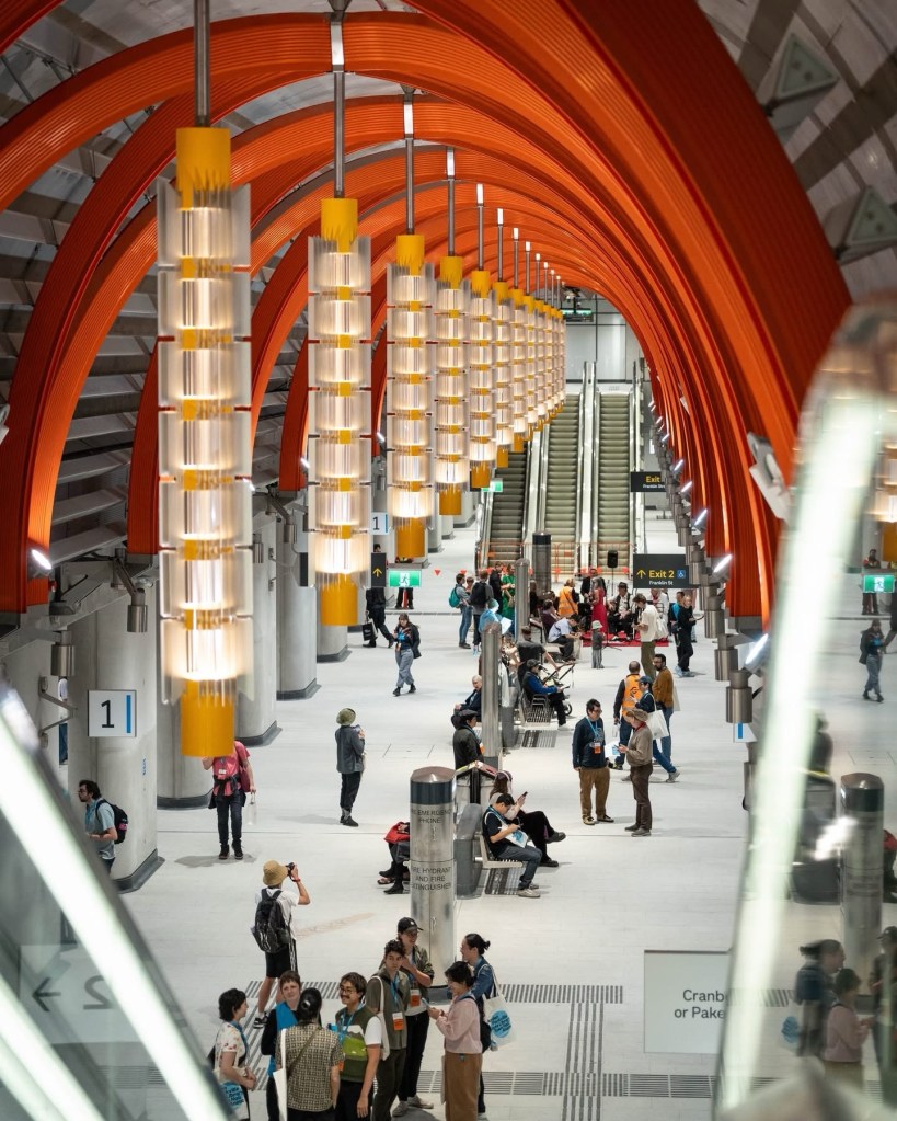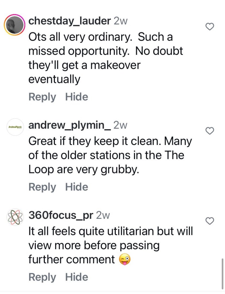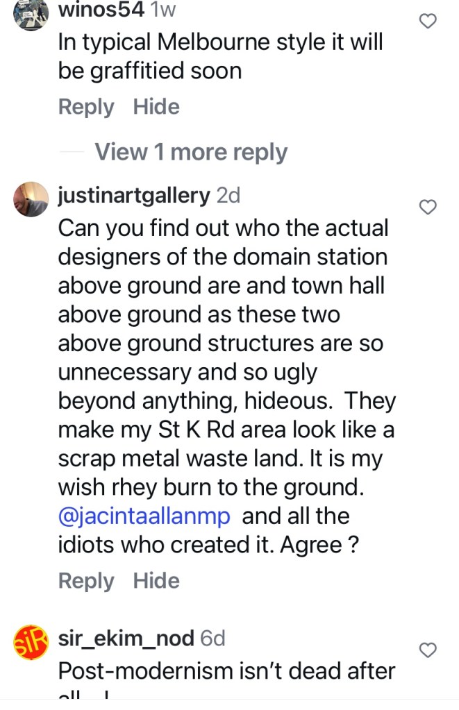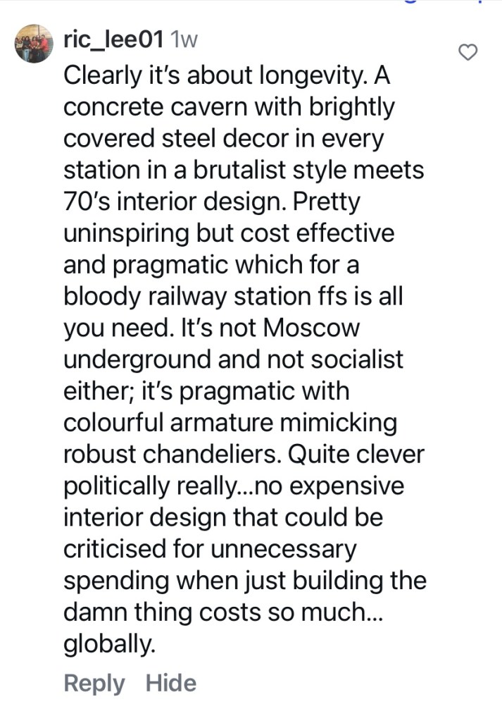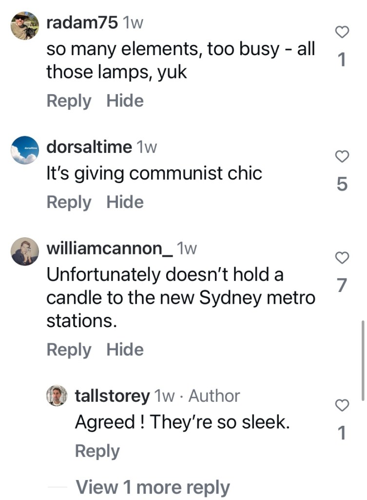 The Metro Tunnel is going to open for limited service soon, so I thought I’d see what I could make of the design underground – seems it’s all similar, bare smooth concrete walls and roofs, with lots of brightly coloured lamps, brackets and battens. The lead designer Ivan Harbour, from the international @rshparchitects, and Melbourne architect Ingrid Bakker, of @hassell_studio, said the yellow, red and pink is drawn from Melbourne sunrise/sunsets, a cheery idea though not particularly Melbourne.