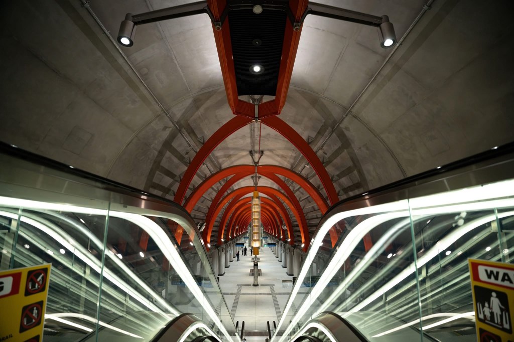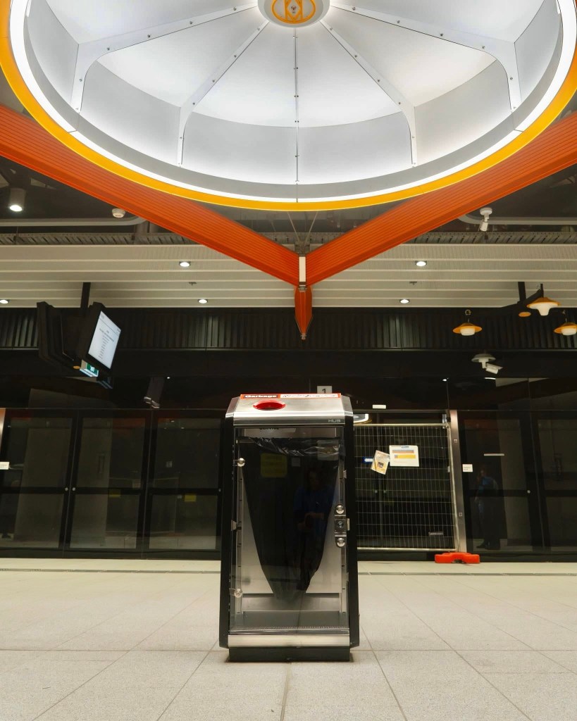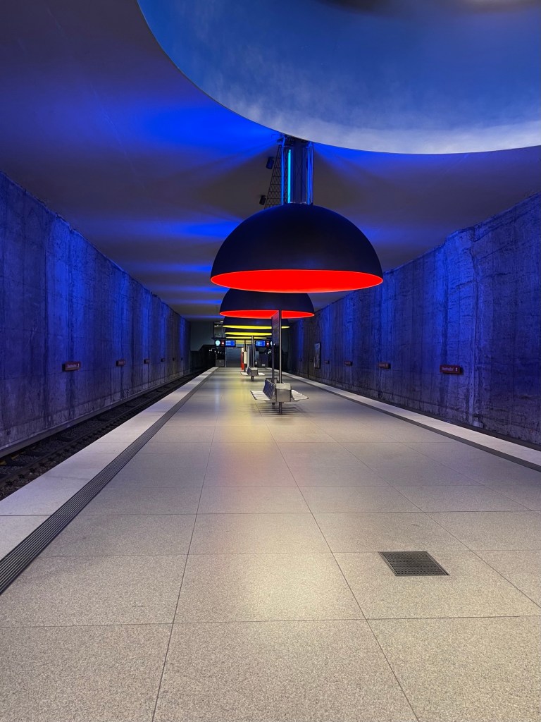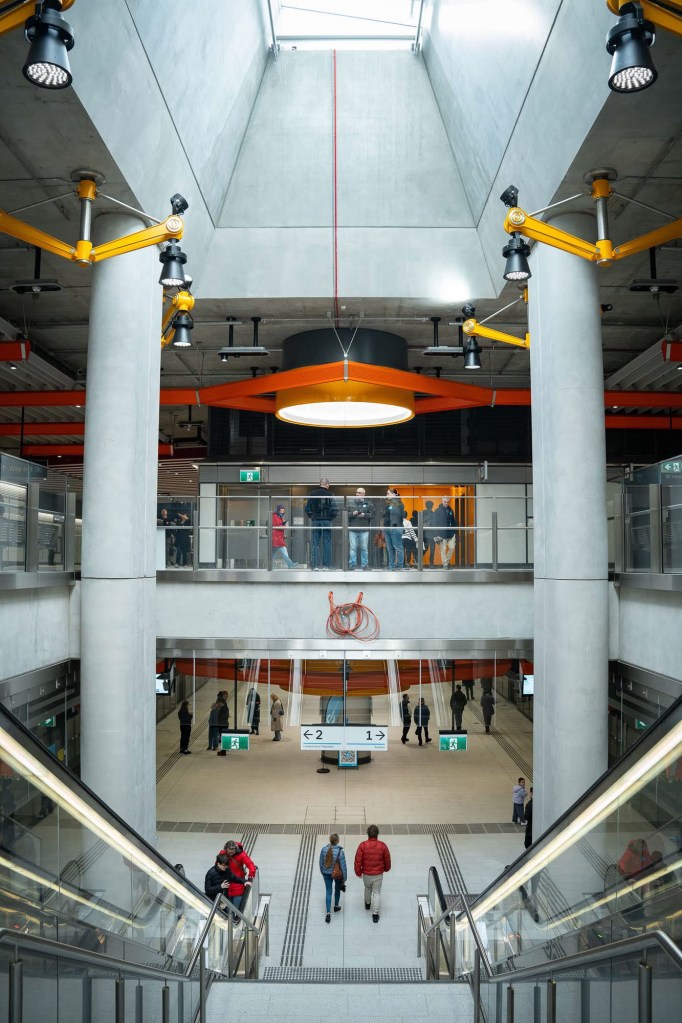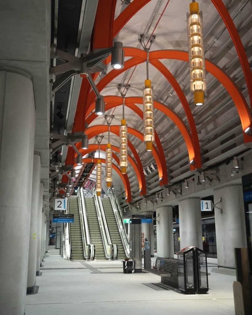 In fact it all reminds me of the Munich Ubahn, the orange of the 1971 stations and the moody huge hanging lamps of a 1998 station, altogether it’s sort of 70s Brutalist and 70s High Tech mashed together (and I predict the lower parts of the concrete walls will get marked pretty quick).