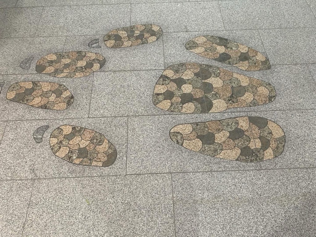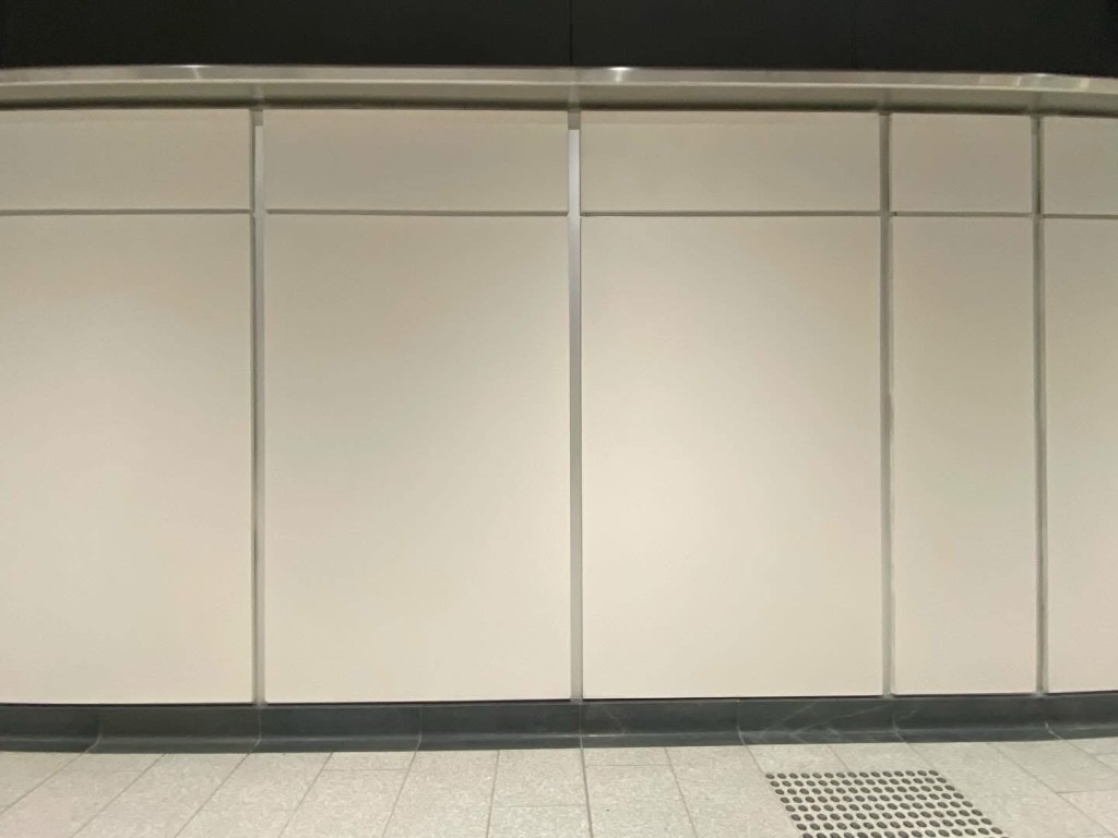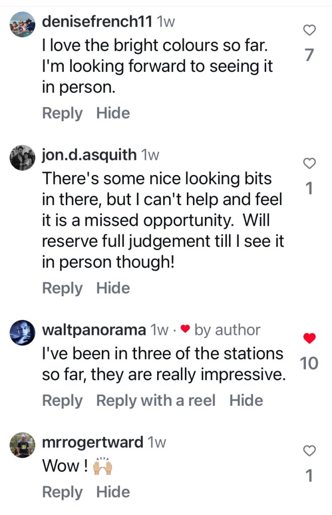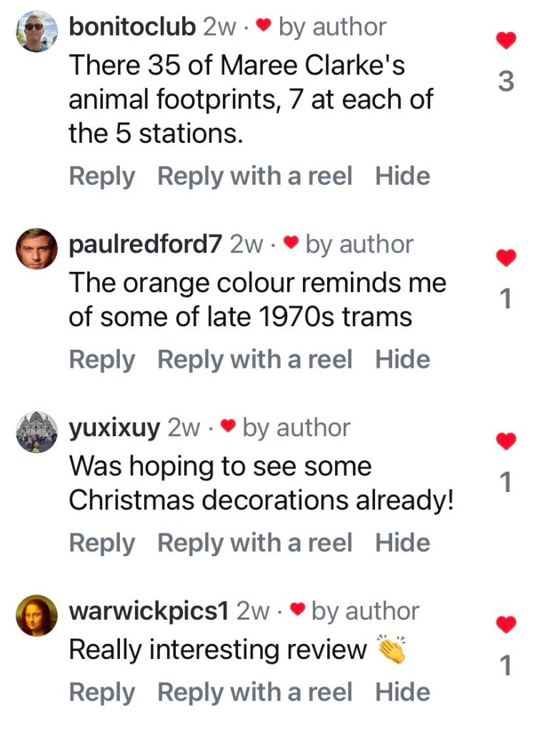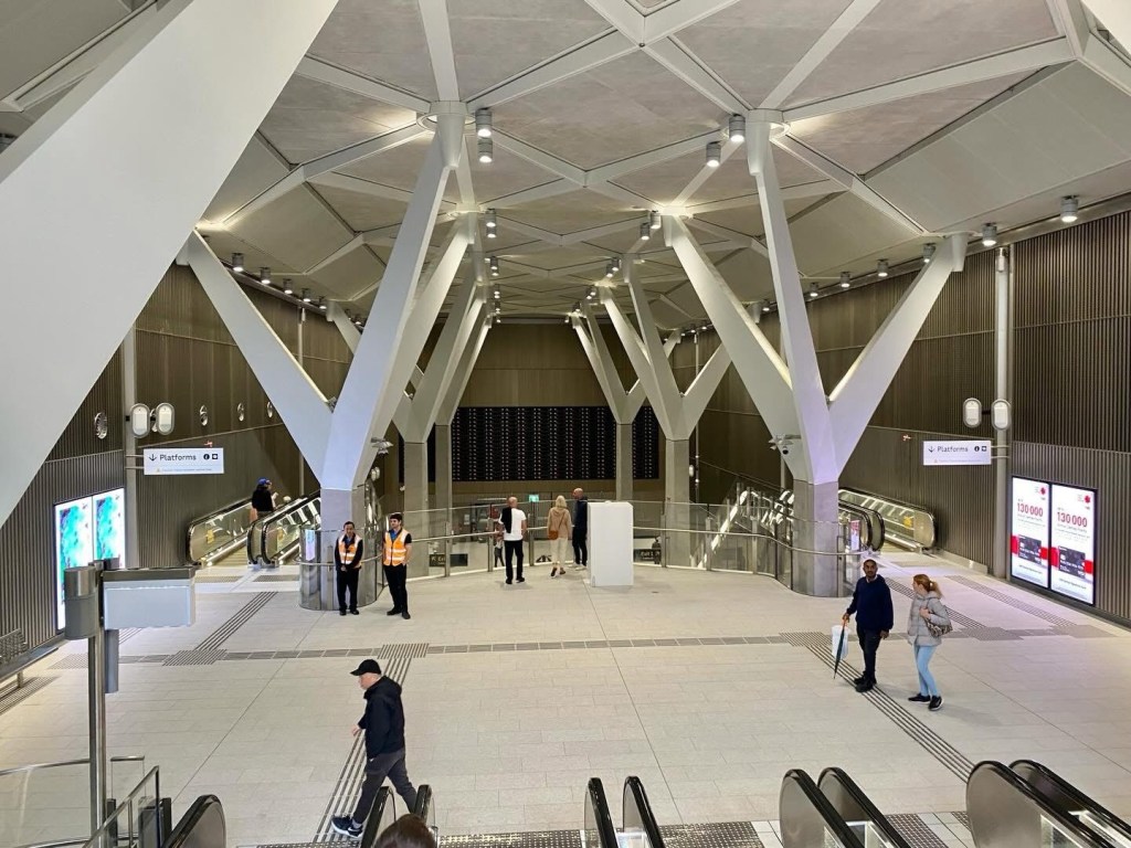 There’s quite a mix of materials everywhere, mostly grey or white, so it hangs together, but I do wonder why ? To avoid monotony? There’s panels of while and grey glass, shadow lines and expressed framing, smooth concrete which must be a render, and soft white stuff panels too, both of which I assume will mark ? Maybe can be cleaned easily ? And lots of shiny stainless steel, and grey painted steel too (or it’s possibly cast aluminium), in fact the cavern forks are steel not concrete. There’s less of the orange and yellow than I was expecting. And there’s cute art by @ree_clarke of native animal footprints in the platform paving.