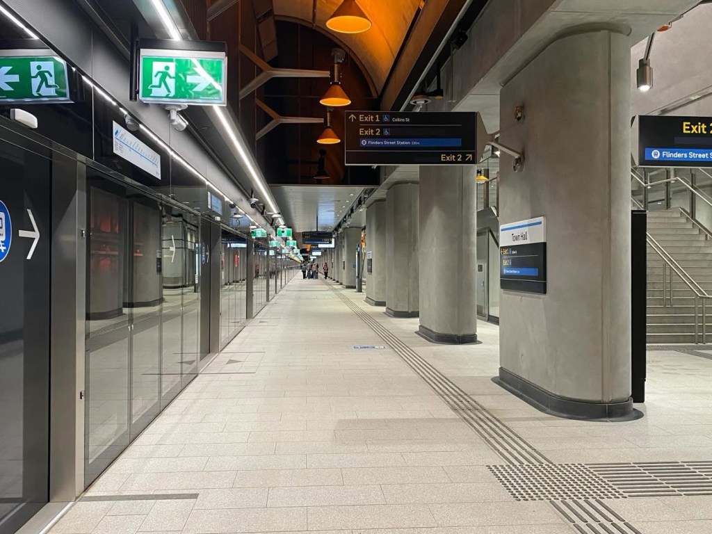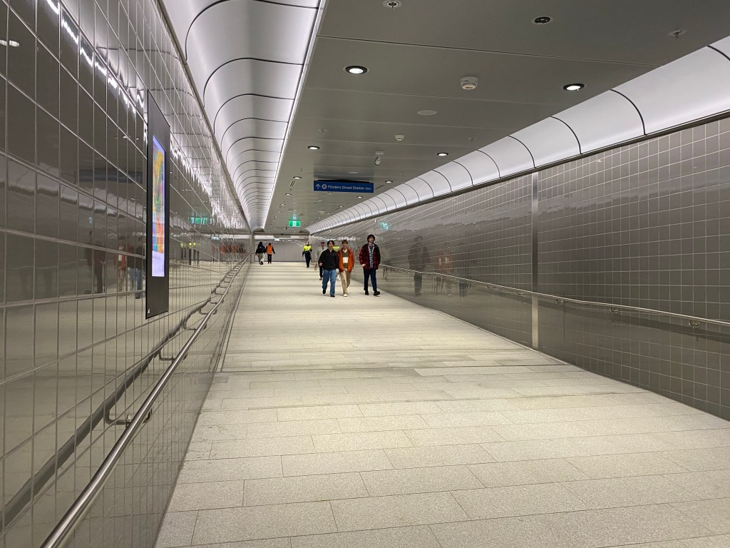 The platforms are 240m long – hmm a quarter of a kilometre! For future 10 car trains, once the rest of the stations are lengthened ? Anyway they’ve got sort of orange uplights to the arched roof. I thought perhaps that there’s be a direct walkway from Collins street to Flinders street station, but no they’re separate entrances to different ends of the platforms.