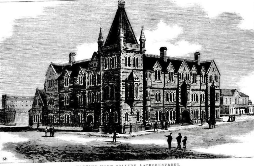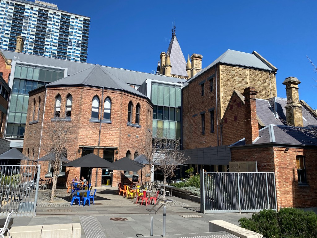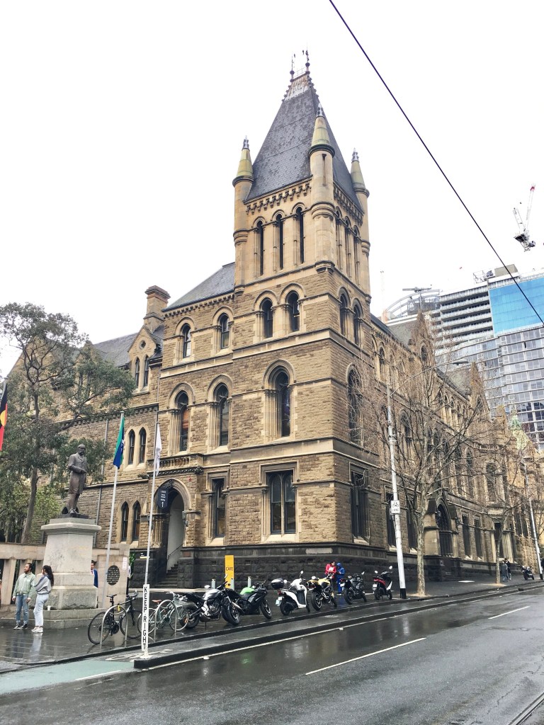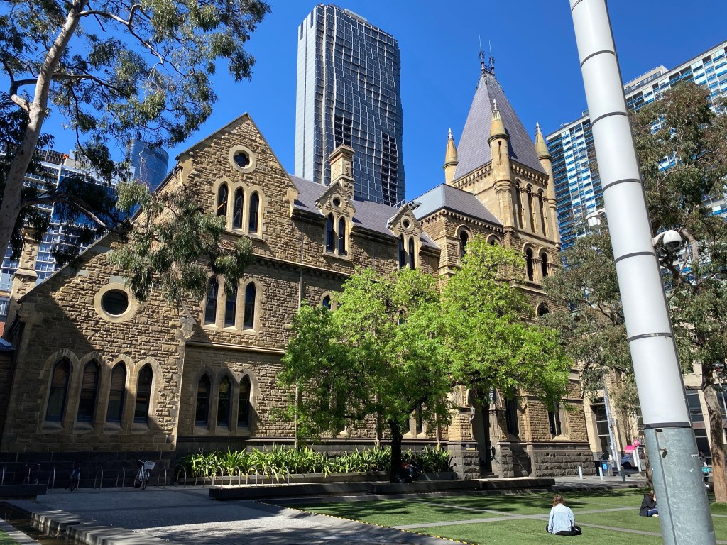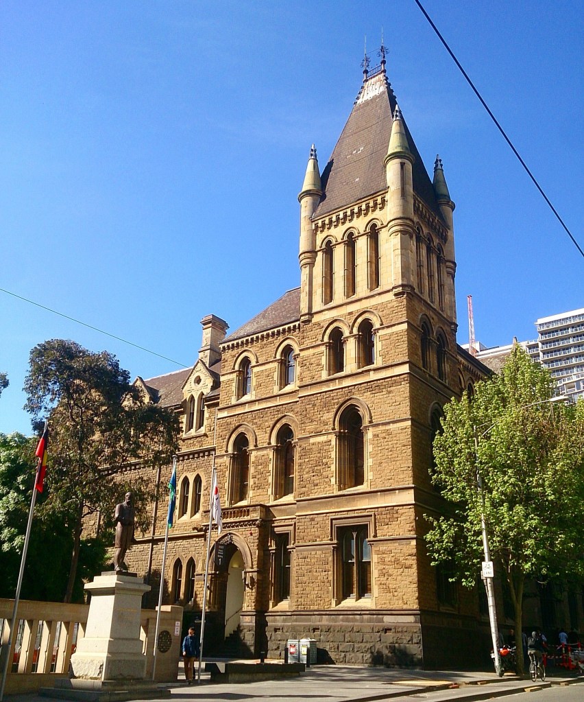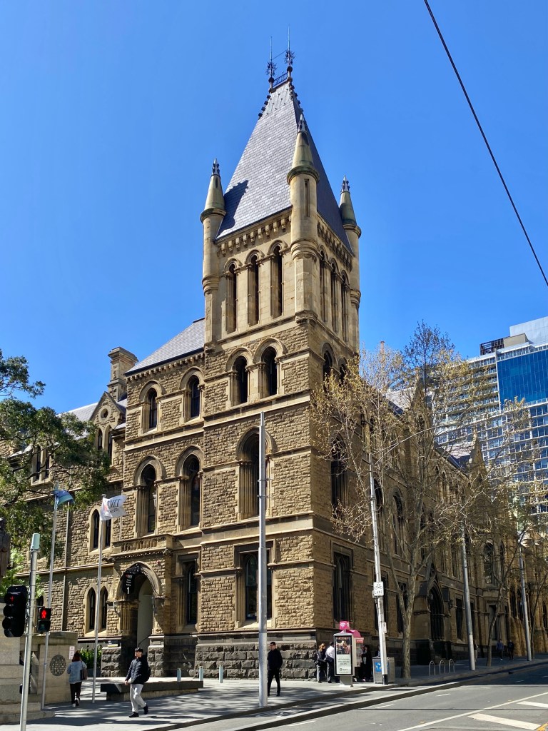 RMIT’s Building 1, all brooding Gothic/Romanesque, softened by trees on both sides, my pics from this year back to 2016. The great #RomanesqueRevival tower (described at the time as (‘Scotch Gothic’) and the #LatrobeStreet frontage completed 1892, designed by #OakdenAddisonandKemp.
