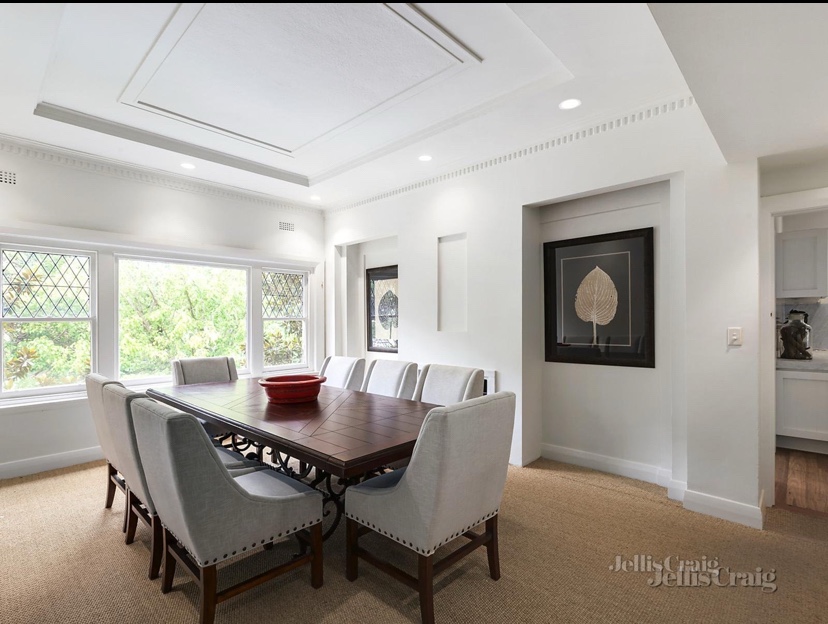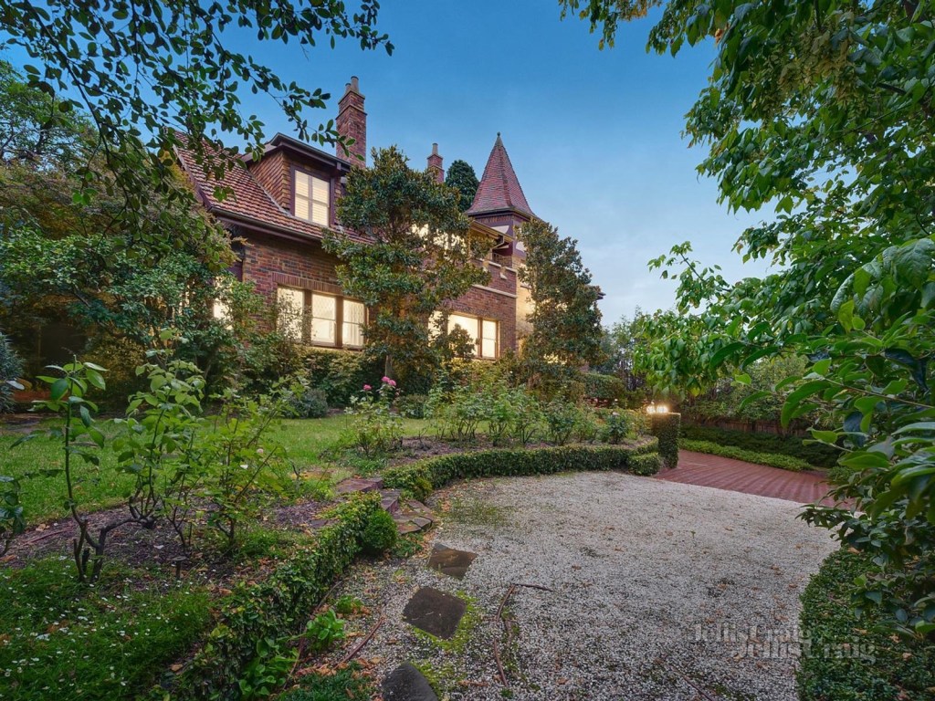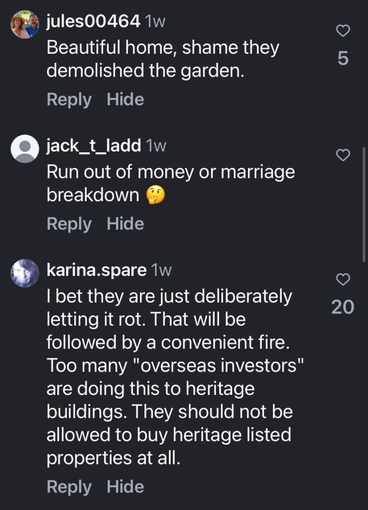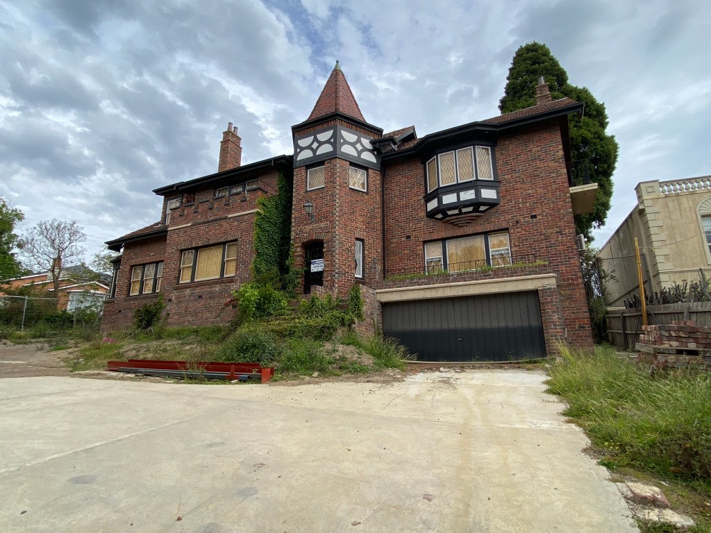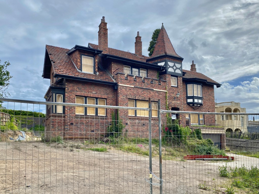 Read about this house at 81 St George’s Road Toorak so had a look – it was sold in 2020, and the overseas owners started renovations then changed their plans, so it’s pretty bare, but the main house is intact. It was built in 1934, architect unknown, but it was by the builders Dickson & Yorston, who may have designed it. It’s in the Old English (or Mock Tudor) style, in clinker brick with cute turret, picturesque roofline, some crenellations, but the half-timbering isn’t very convincing. If the interiors had any character originally that was all gone by 2020. It has a heritage overlay, which is why it’s still there.