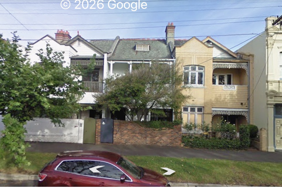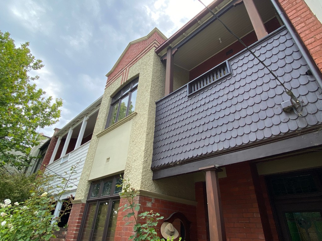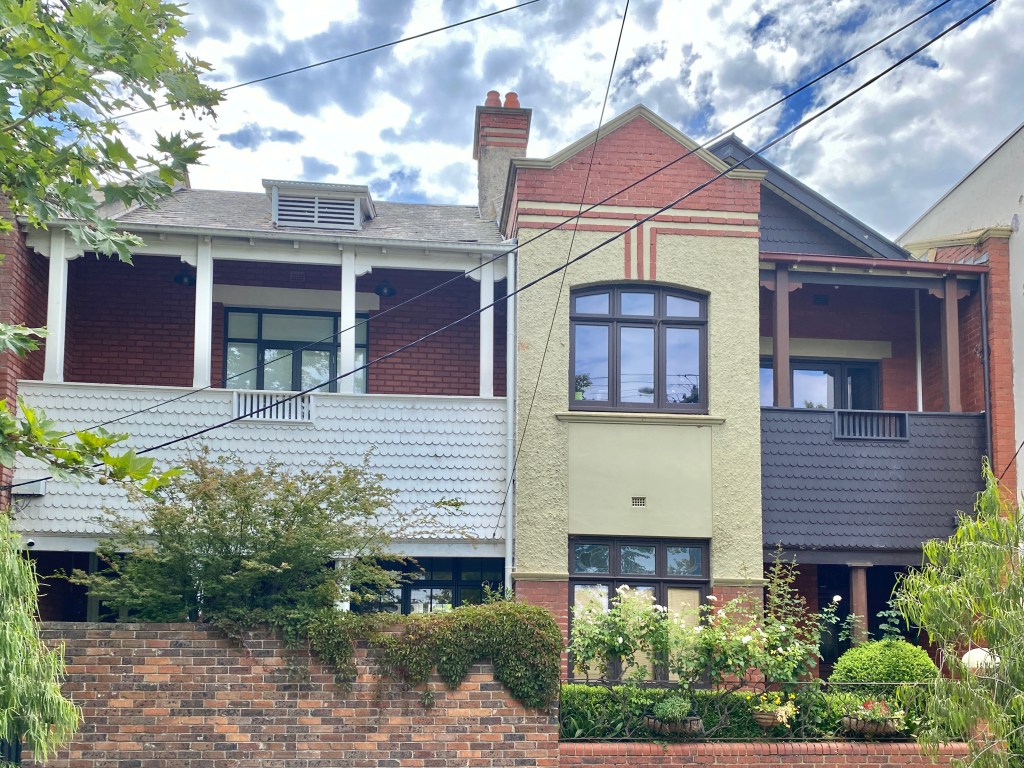 Looks a bit like maybe a school, but it’s a very unusual set of three terraces on Kerferd Road Albert Park in Arts & Crafts style, complete with shingles and solid timber posts and brackets. The style became popular just before WWI, but I can’t think of another place with the chunkiness of the posts and brackets.
