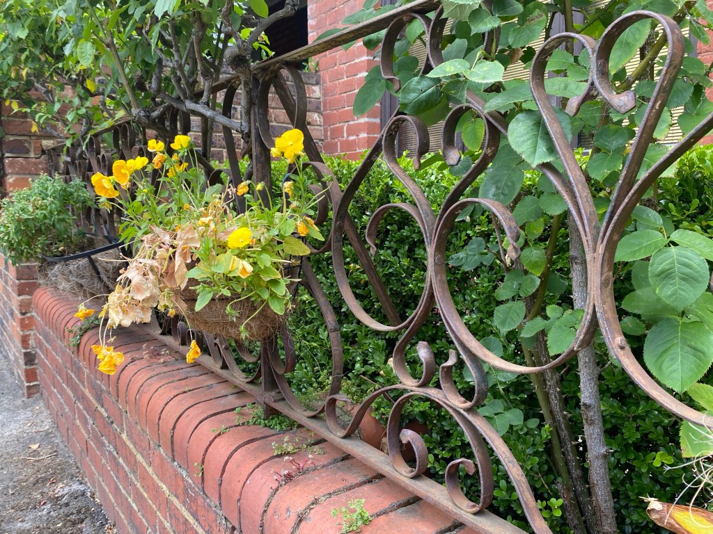 And back on Canterbury the next block, a huge rose bush and some cast iron with the Aesthetic movement flowers picked out, and lastly some excellent cast iron, bolder than most and creating an arched effect.