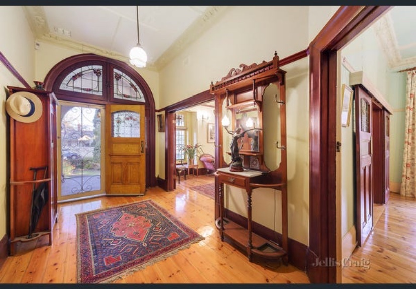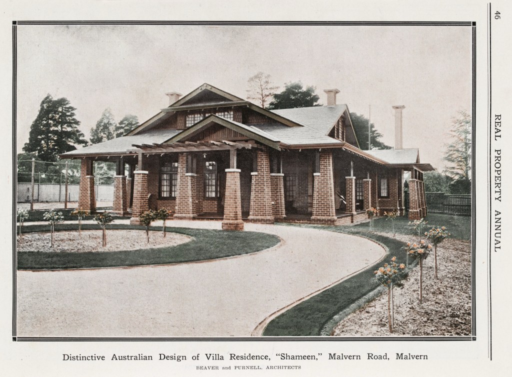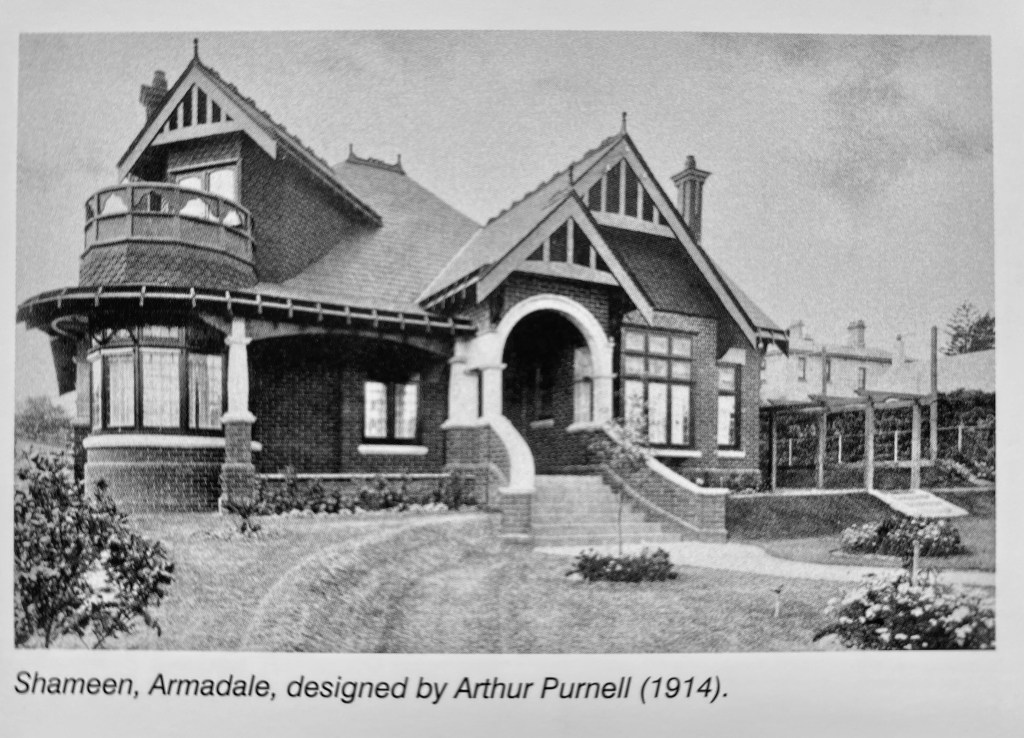 Rather nice Edwardian spotted in Munro Street Armadale, with excellent layered gables, shingled walls, and diagonal projecting circular bay/porch, and lovely interiors – I thought must be by one of leaders in the style like Ussher & Kemp, but turns out to be 1914, by Arthur Purnell, who had a very long and varied career. This was his own house, and named Shameen, after the place where he first practiced architecture- in China !