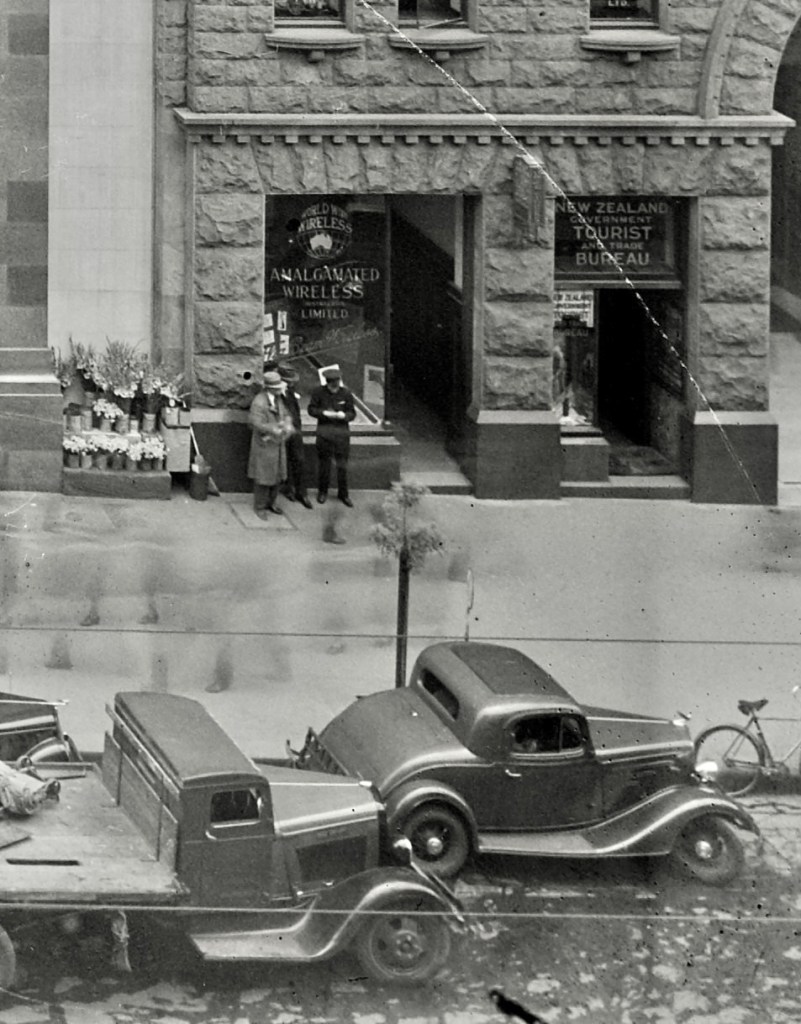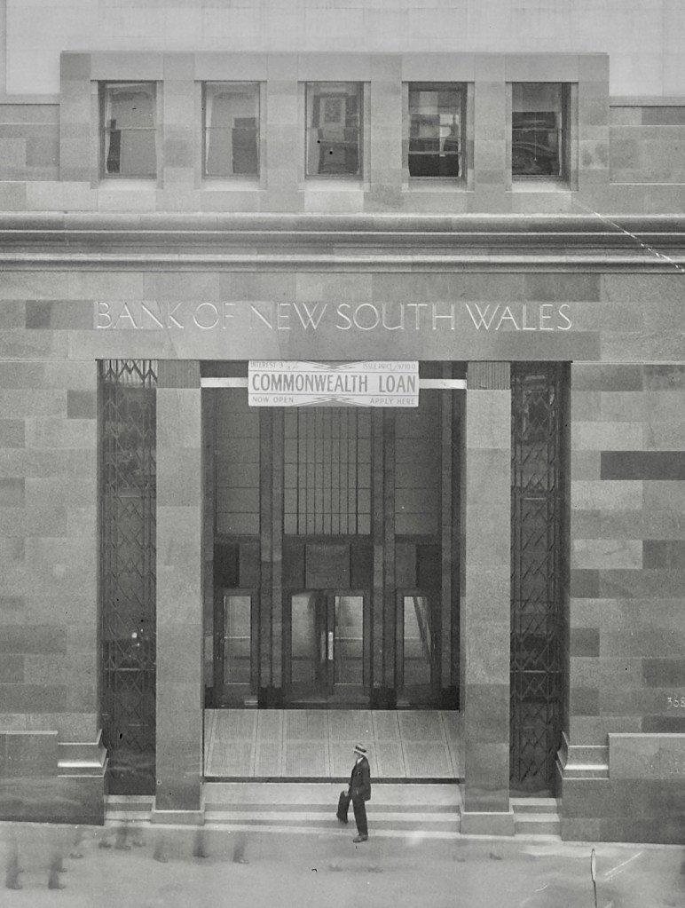 It was built in 1934-5, and designed by Godfrey & Spowers in a restrained version of Art Deco, a bit traditional, clad in granite and sandstone. It had huge bronze doors, with a fine geometric pattern (pic 4 shows them partly closed), and a big banking chamber with a giant skylight and stylish vertical light strips. The pics from Building Magazine include one of the bronze lift doors ‘of the bi-parting type’, and the safe. (The facade was practically copied in 1939 by the one applied to the CBA bank just a block away, pic 10).