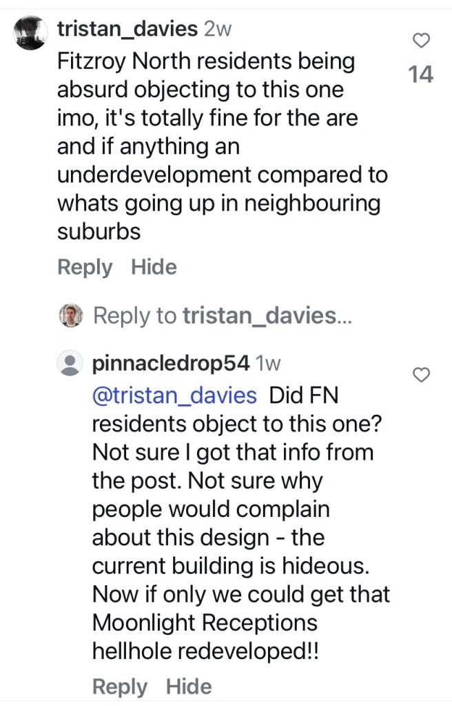Apparently this one was workshopped with the Office of the Victorian Government Architect. But I now discover the guide is summarised as Clause 58, which has lots of minimum sizes and other standards, not as generous as those images imply. In this case, the Officers Report only uses Clause 58, and notes that there are 17 three beds, high ESD ratings, good natural light, minimum balcony sizes and so on. The communal open space is a large area on the south side, but most of it is covered by the building above, with only an area about 6x20m open, that won’t get any sun, but they say ‘it’s near the Edinburgh Gardens’, ha !