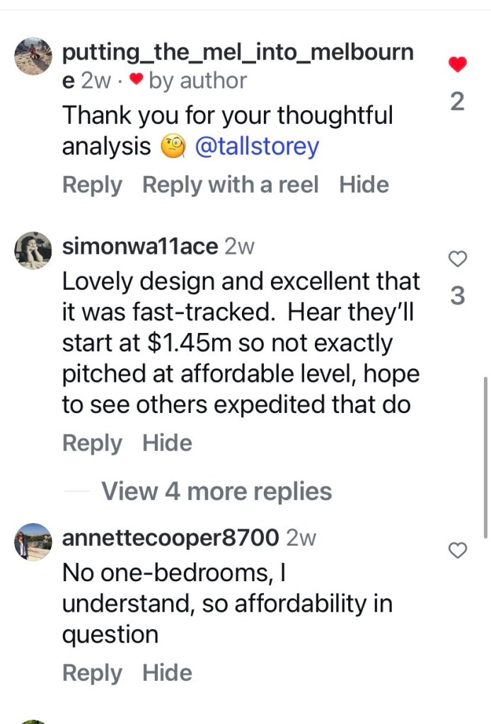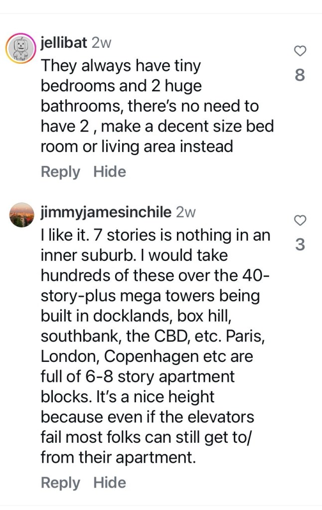 Having said all that, I think it’s ok, and asking for nice communal open space in every big apartment block is going to be resisted. At least this one has a little bit of outdoor circulation. I do think the balconies should be bigger, but it’s still better than many new blocks. Architects @warrenmahoney.