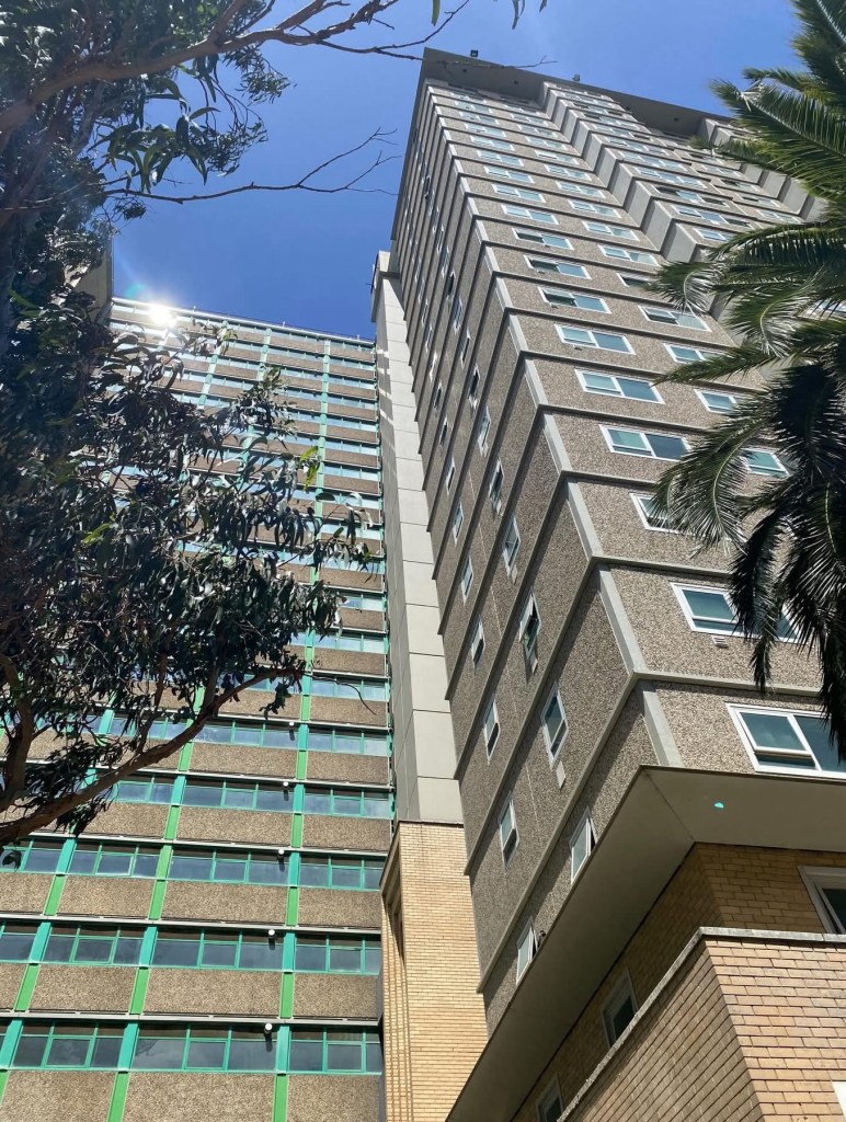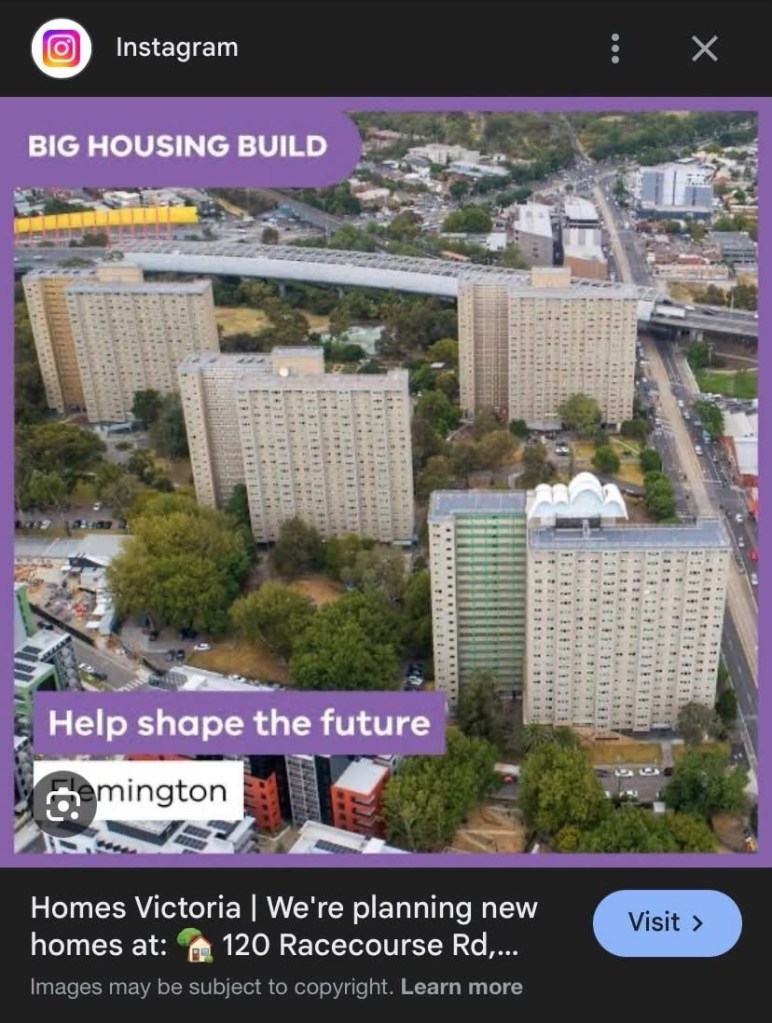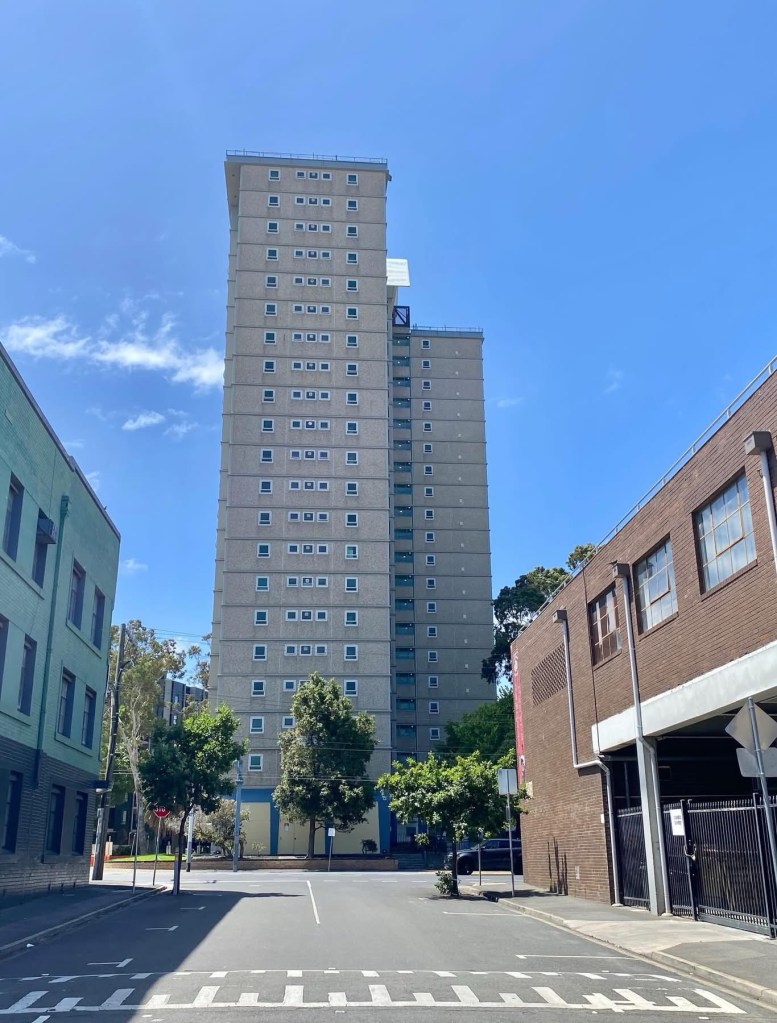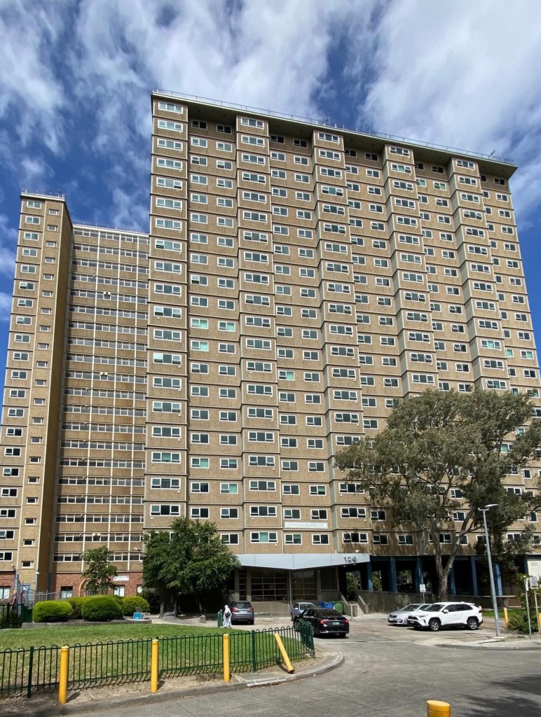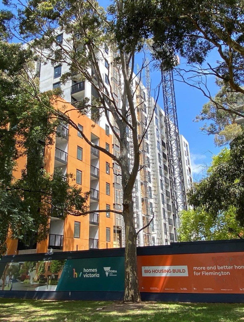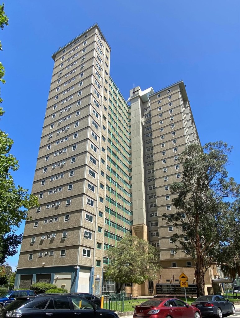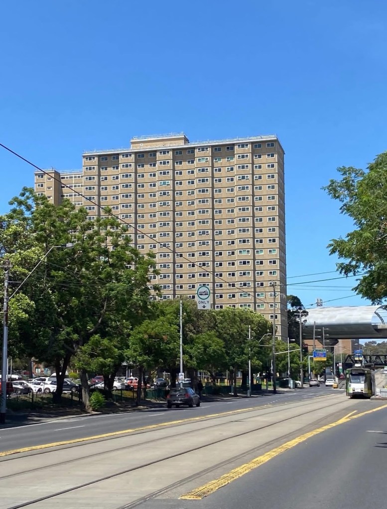 The old Housing Commission towers are rather massive ! This is the Racecourse Road Flemington Estate, the one the Tullamarine sound tube goes past, and consists of four ‘S’ blocks each with 200 flats. They’re quite widely spaced, with some grass and lots of trees and surface carparks. It’s not great but not awful to walk through.