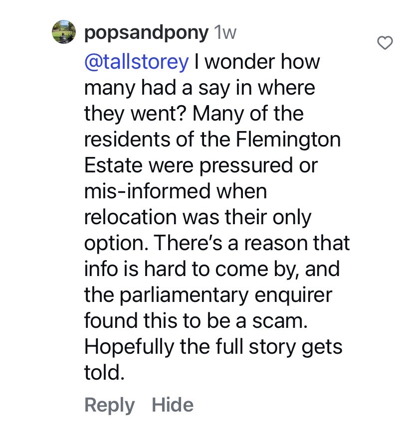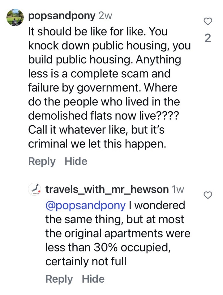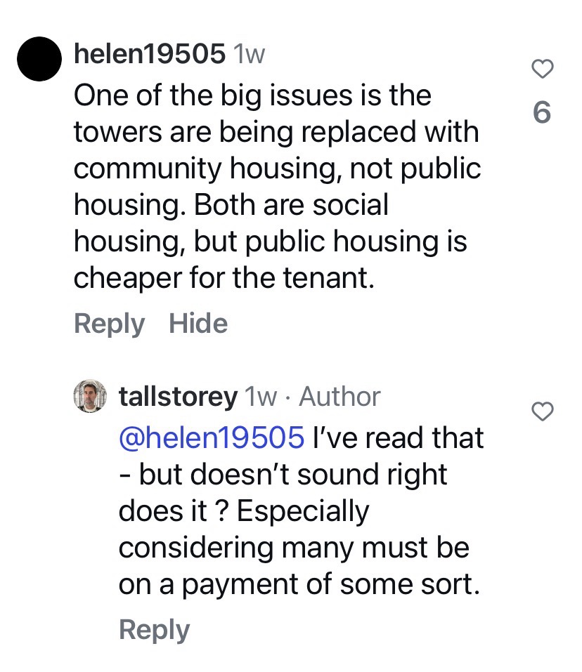 I don’t mind the whole idea of replacement, but I don’t understand what feels like secrecy, with plans and costings not revealed. And of course it’s more important to build more public housing, not just replace the existing with modest amounts extra, but I realise it’s cheaper to build more on existing estates than buy land in other places.