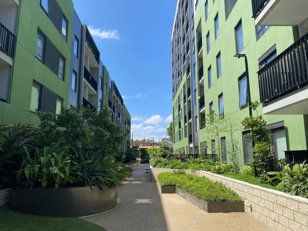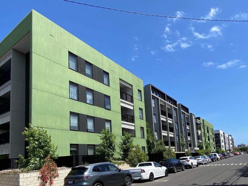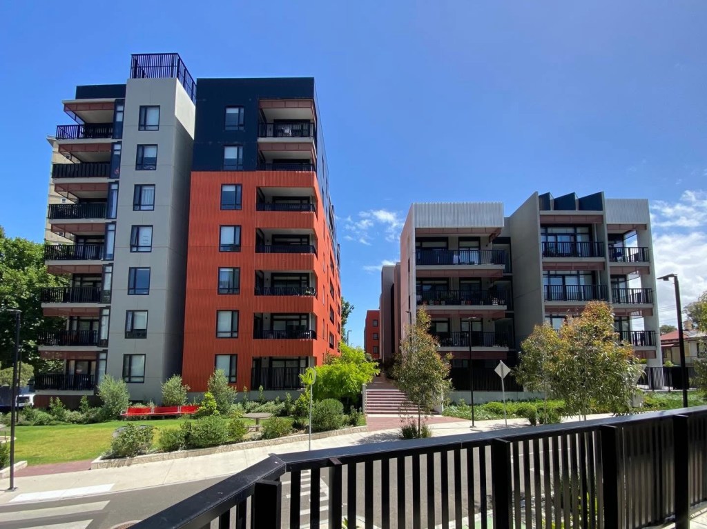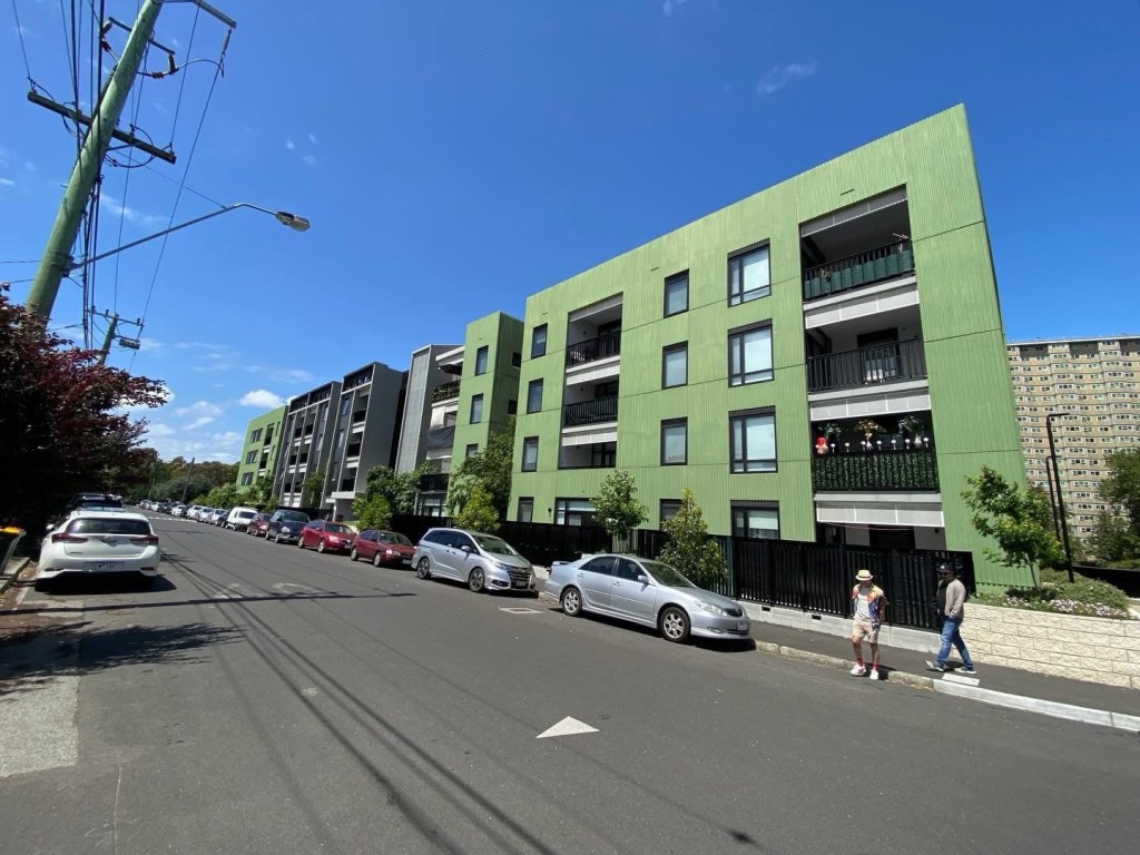 Social housing redevelopment next to the Flemington high rise estate on Racecourse Road, replacing some pretty yukky old walk-ups. 198 commission flats were replaced with 240 1 to 4 bed flats, in blocks 4-8 floors, much much nicer, with balconies, nice colours and lots of planting. I do like that shade of green! Designed with high thermal comfort and low maintenance in mind.