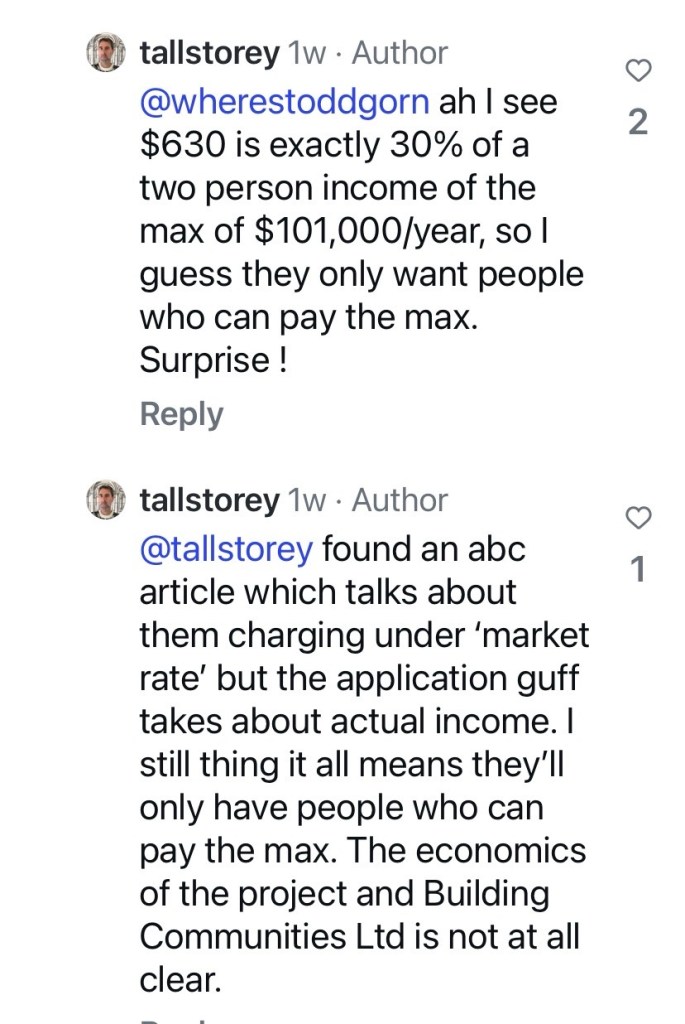 Update : apparently the affordable places are only going to those who earn the max available, $110,000 for a couple, who pay 1/3 of their income ie about $630/week on rent.